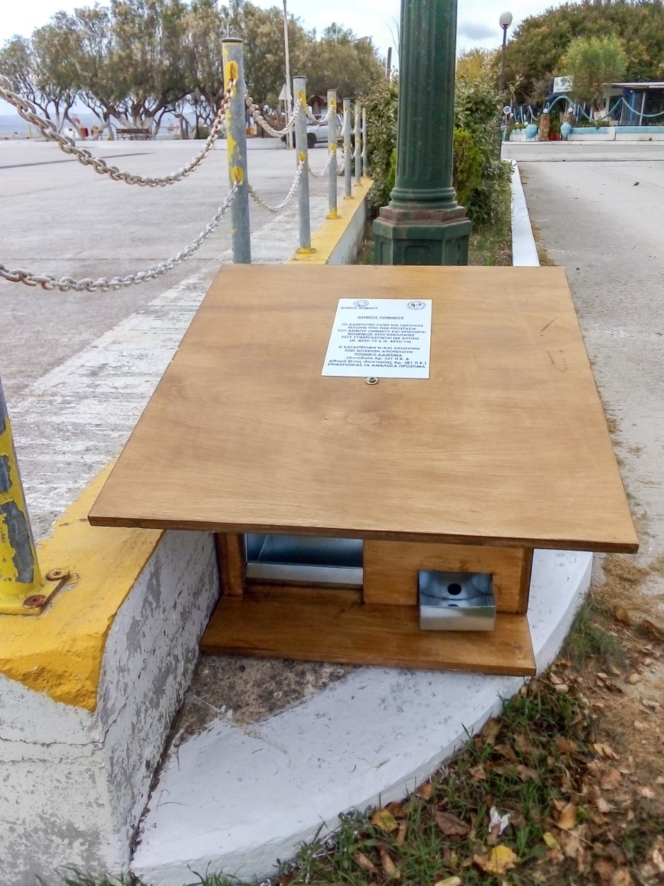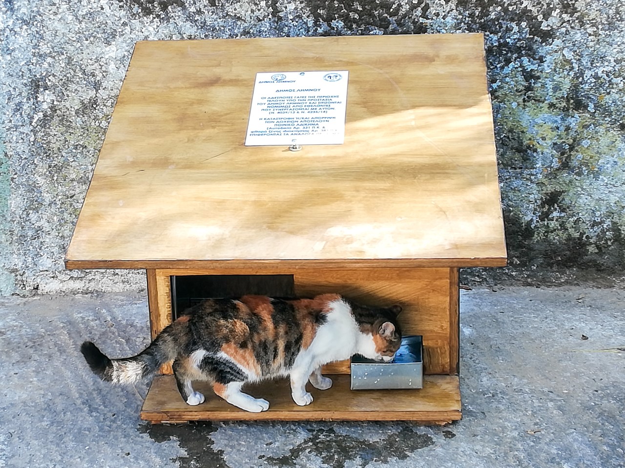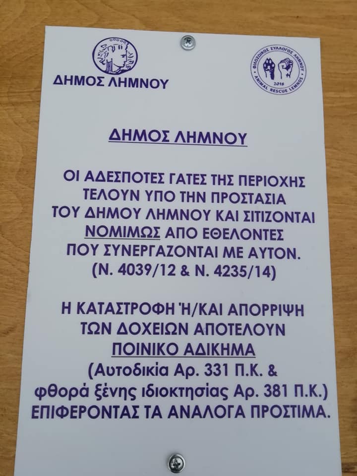 Μετά από πρωτοβουλία του Φιλοζωικού Συλλόγου ''Animal Rescue Lemnos'' ο Δήμος Λήμνου προχώρησε στην αγορά 30 δοχείων(15 ταΐστρες και 15 ποτίστρες), για την φροντίδα των αδέσποτων γατιών του νησιού . Η ξηρή τροφή και το νερό θα τοποθετούνται στα δοχεία μόνον από εθελοντές που έχουν οριστεί υπεύθυνοι γι' αυτόν τον σκοπό.