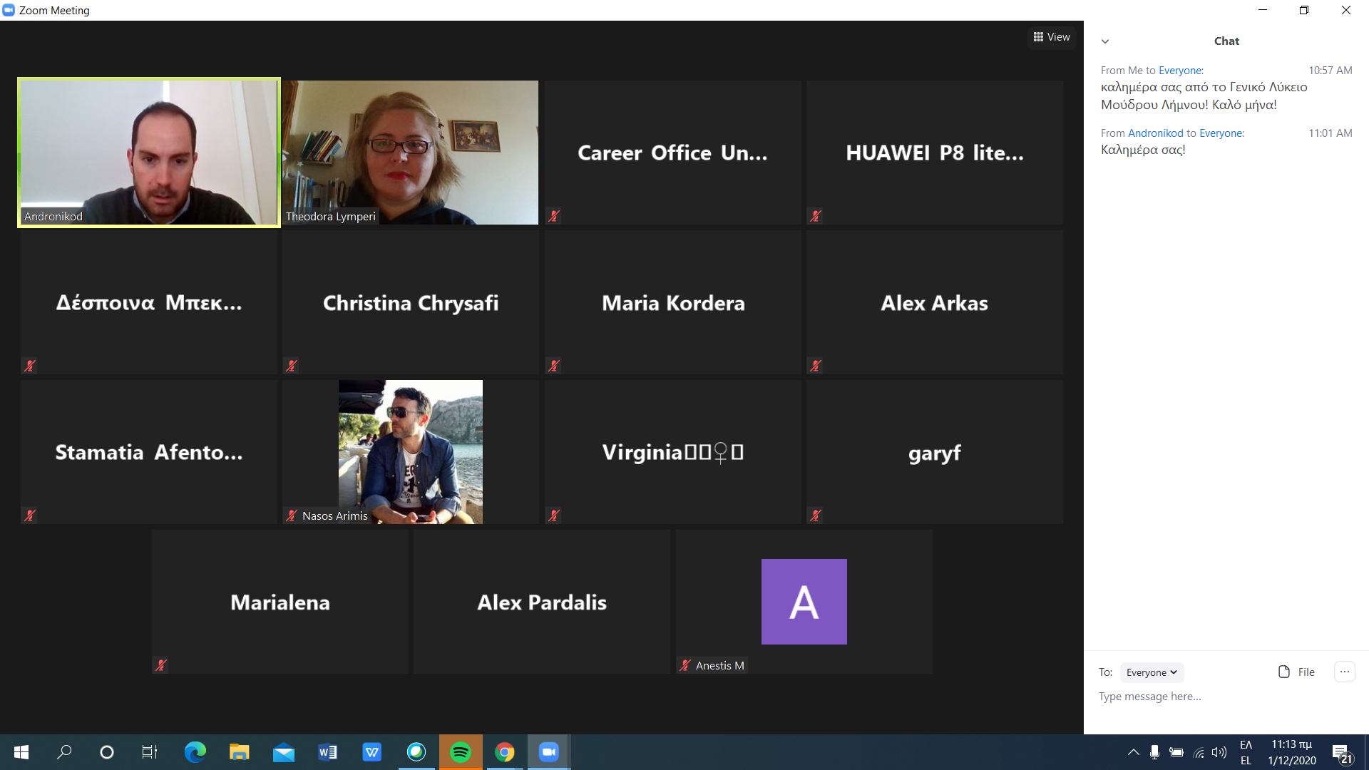 Στη διαδικτυακή συνάντηση μαζί με τους μαθητές συμμετείχαν και οι εκπαιδευτικούς τους, Αθανάσιο Αρίμη και Θεοδώρα Λυμπέρη.