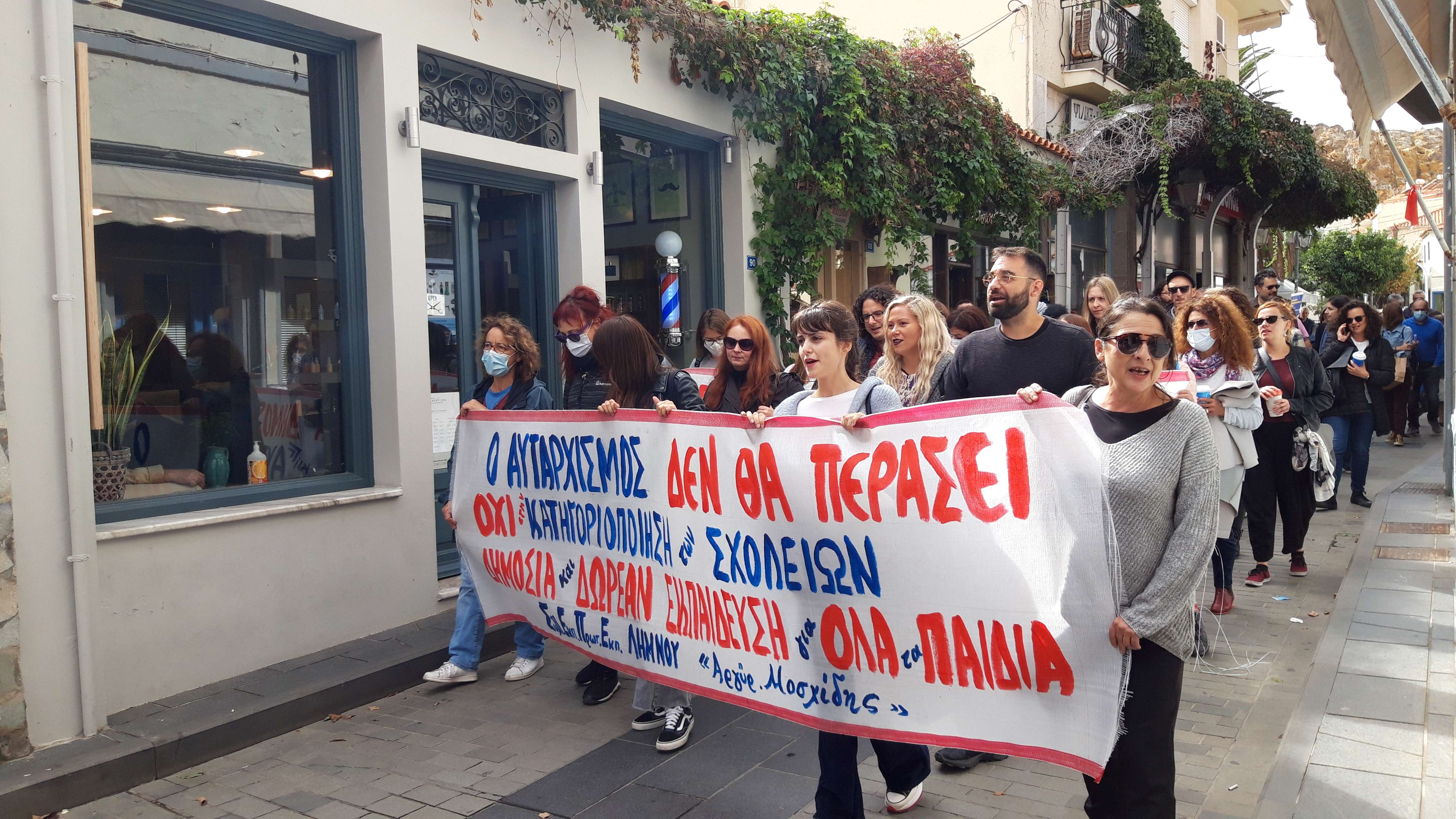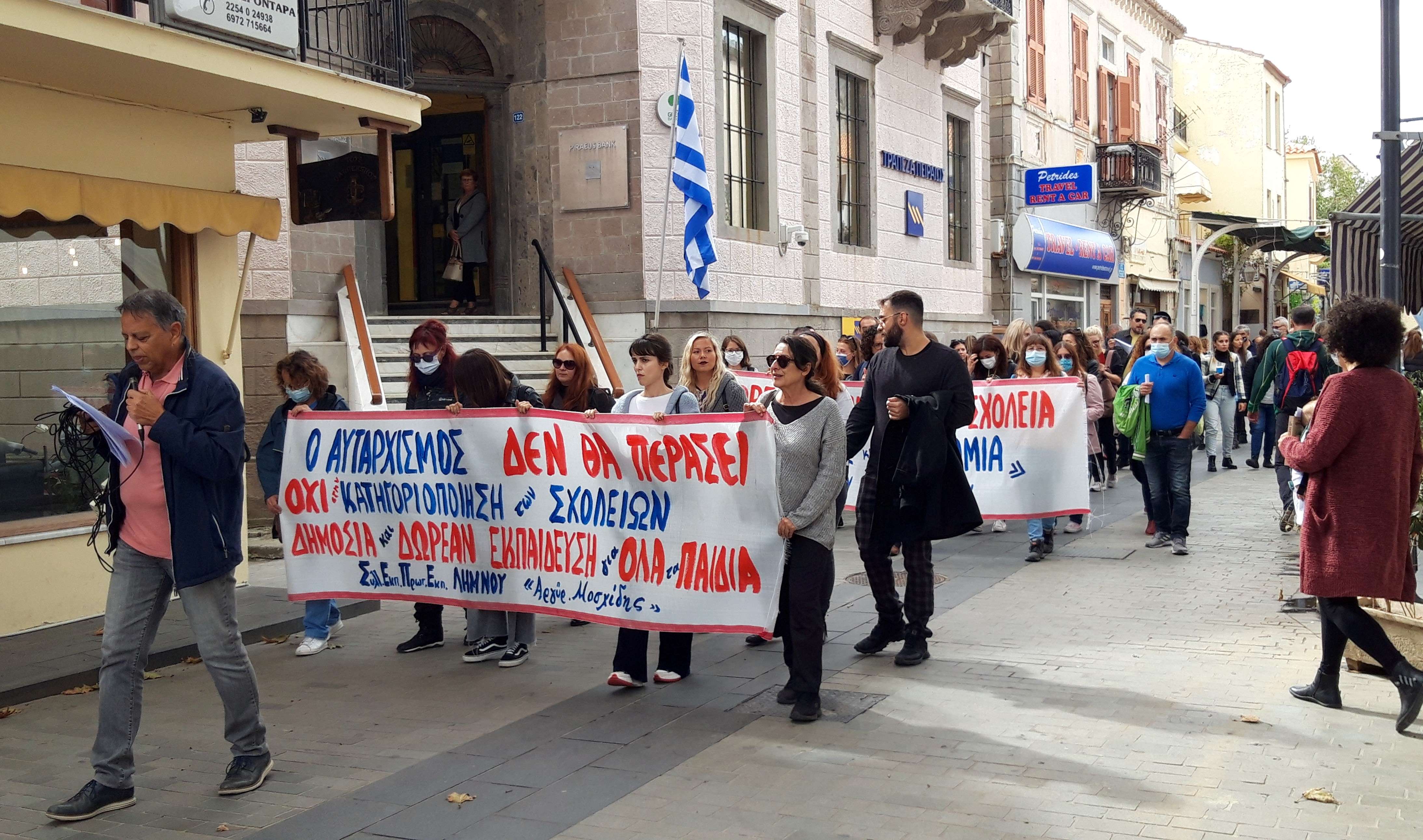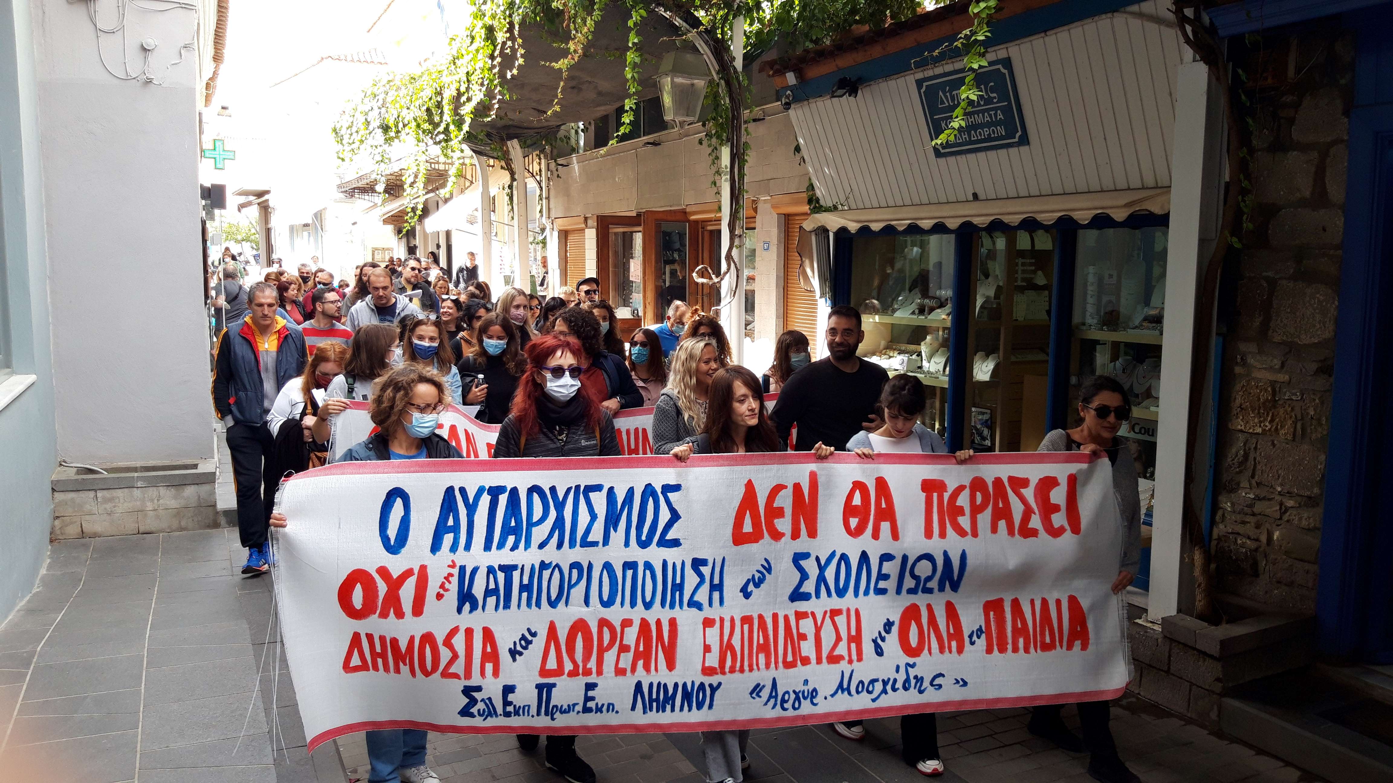 Μετά τη λήξη των ομιλιών - και παρά την βροχόπτωση - ακολούθησε πορεία μέσα από την αγορά και τους δρόμους της Μύρινας, κατά την οποία εκπαιδευτικοί αλλά και γονείς με τραγούδια και συνθήματα βροντοφώναξαν την αντίθεσή τους στους αντιεκπαιδευτικούς σχεδιασμούς Κυβέρησης και Υπουργείου.