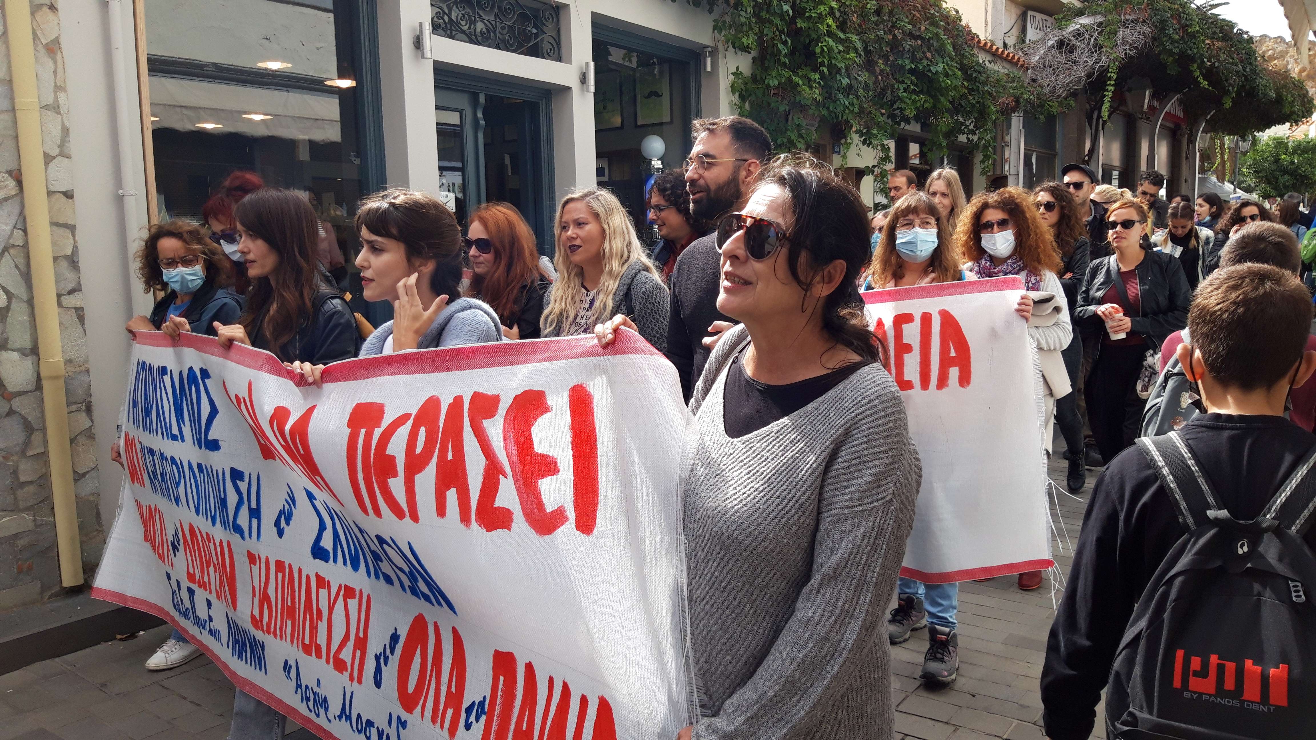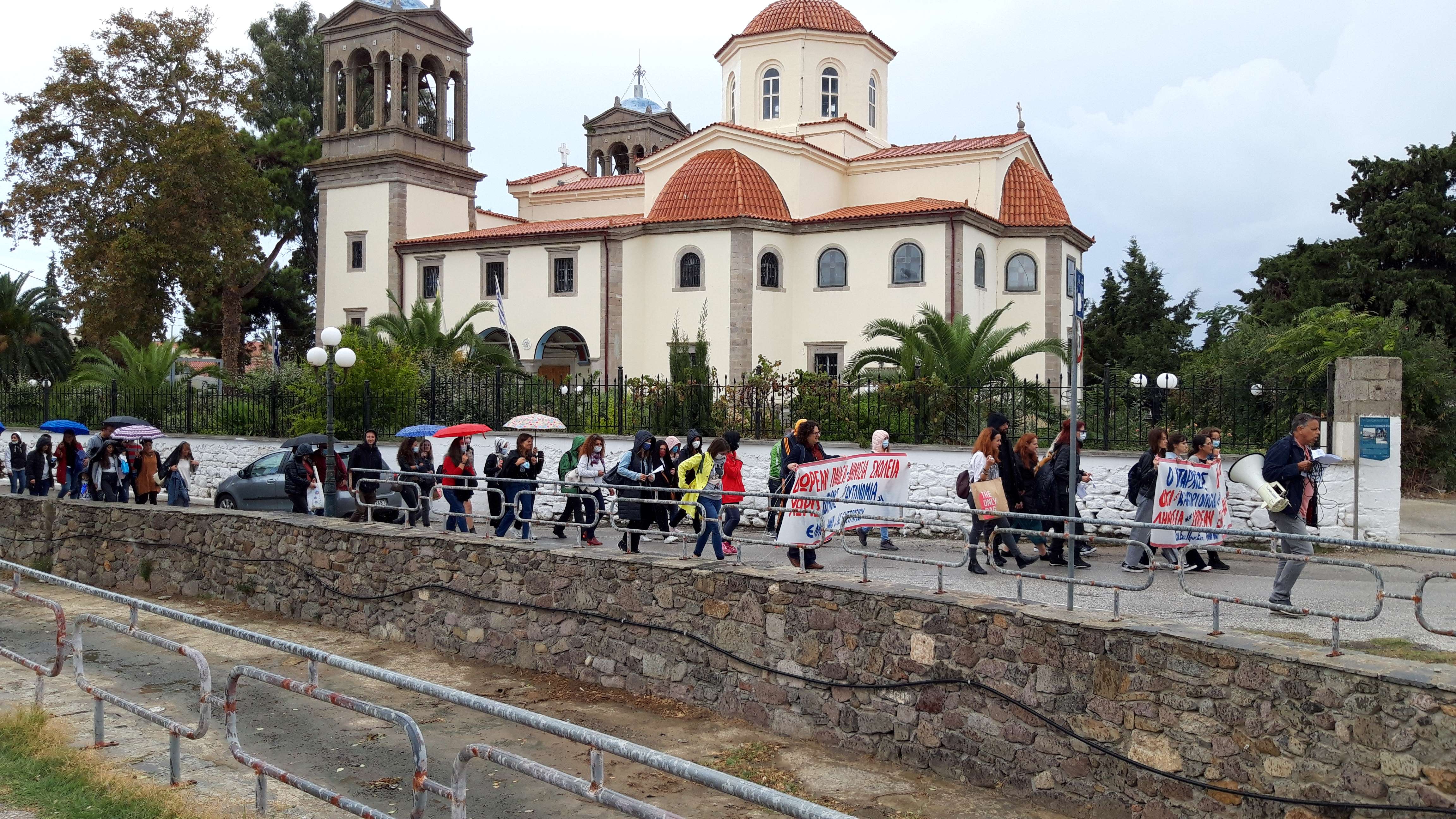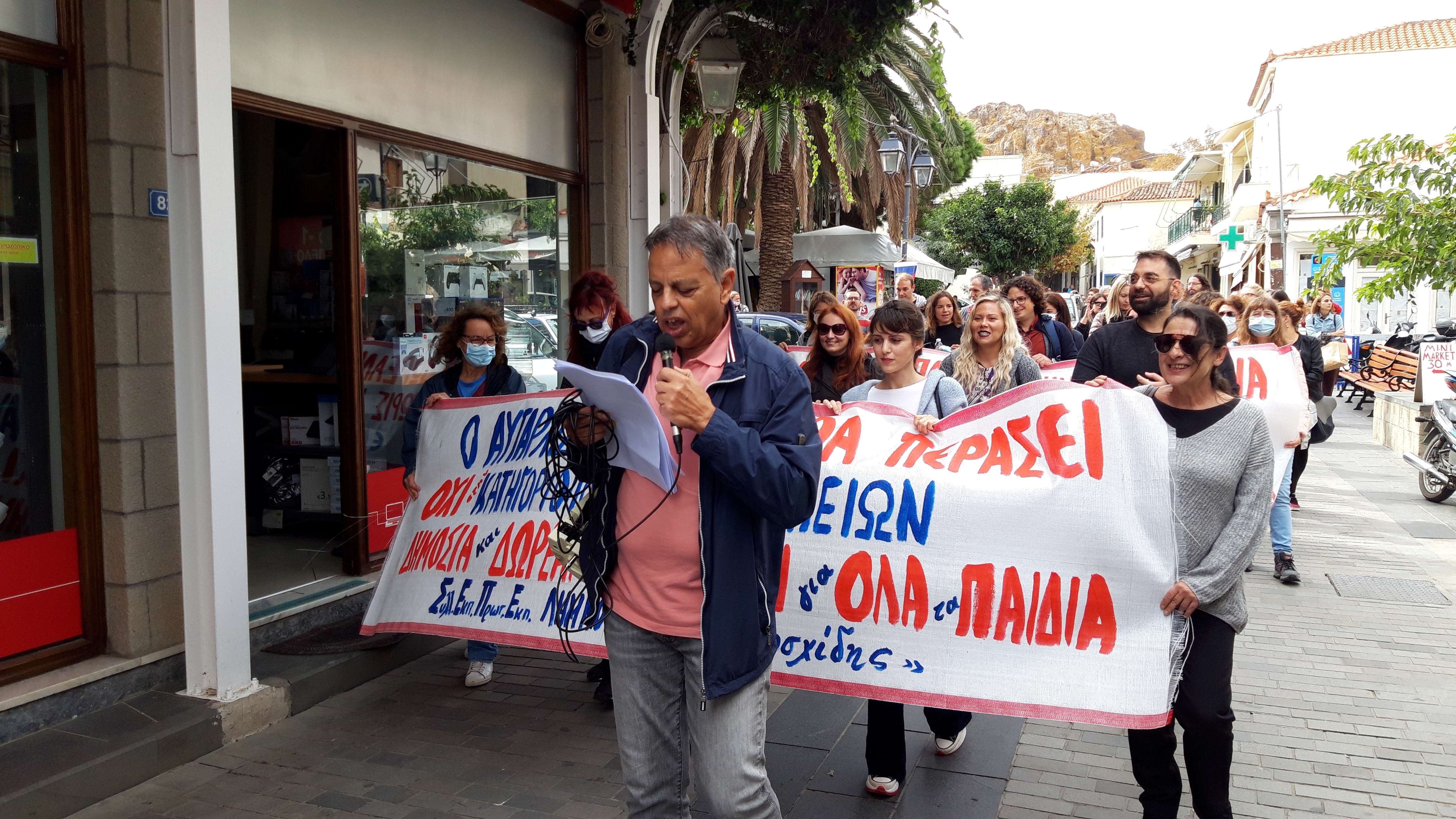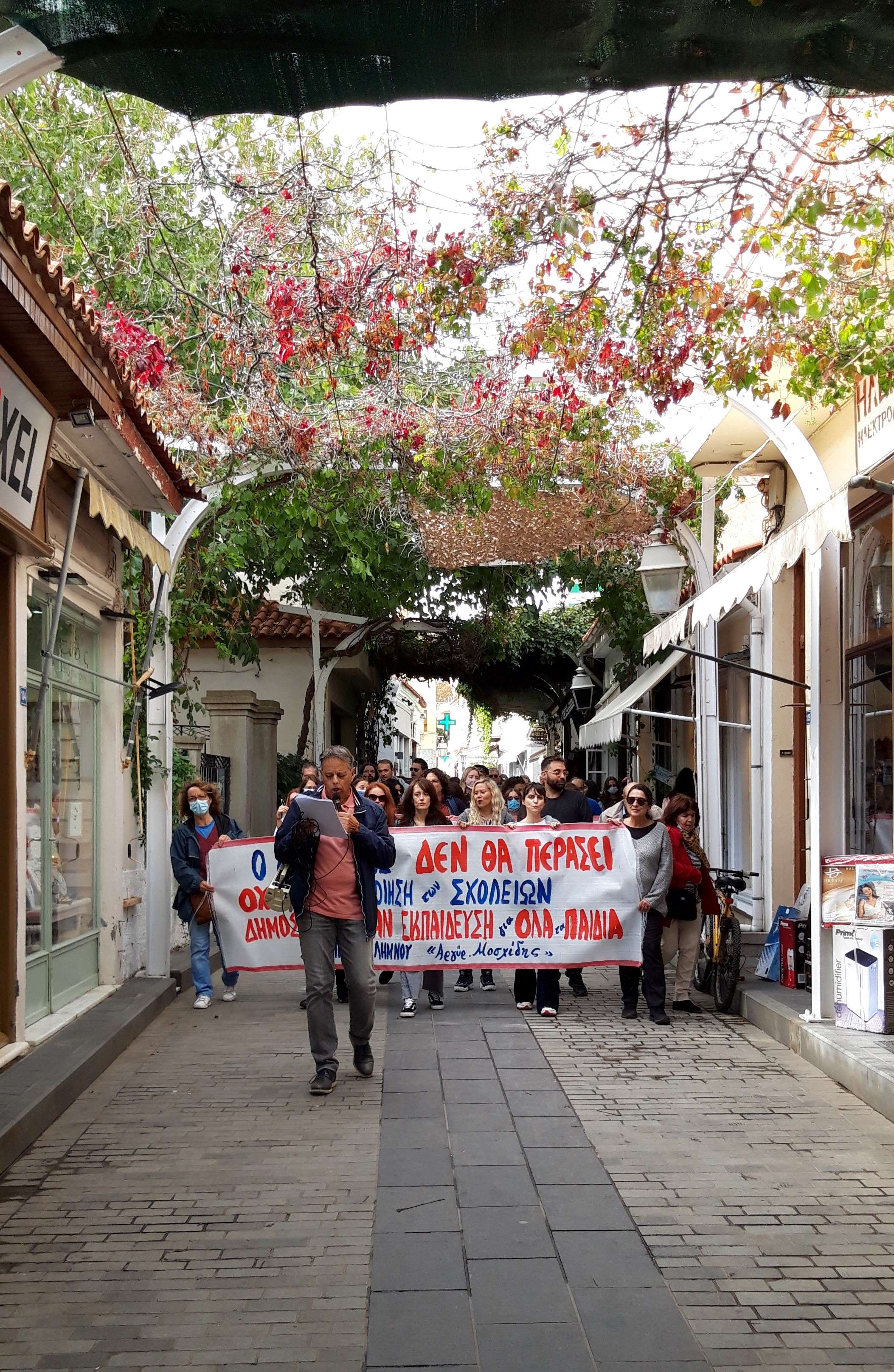 Μετά τη λήξη των ομιλιών - και παρά την βροχόπτωση - ακολούθησε πορεία μέσα από την αγορά και τους δρόμους της Μύρινας, κατά την οποία εκπαιδευτικοί αλλά και γονείς με τραγούδια και συνθήματα βροντοφώναξαν την αντίθεσή τους στους αντιεκπαιδευτικούς σχεδιασμούς Κυβέρησης και Υπουργείου.