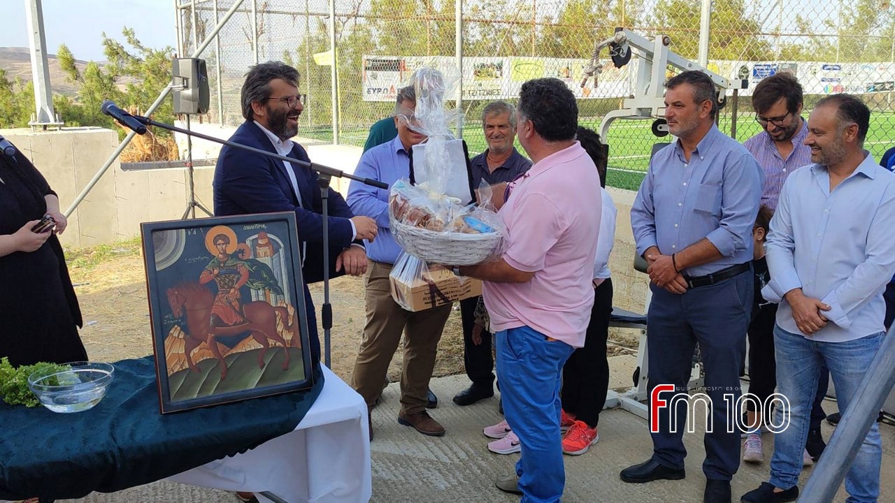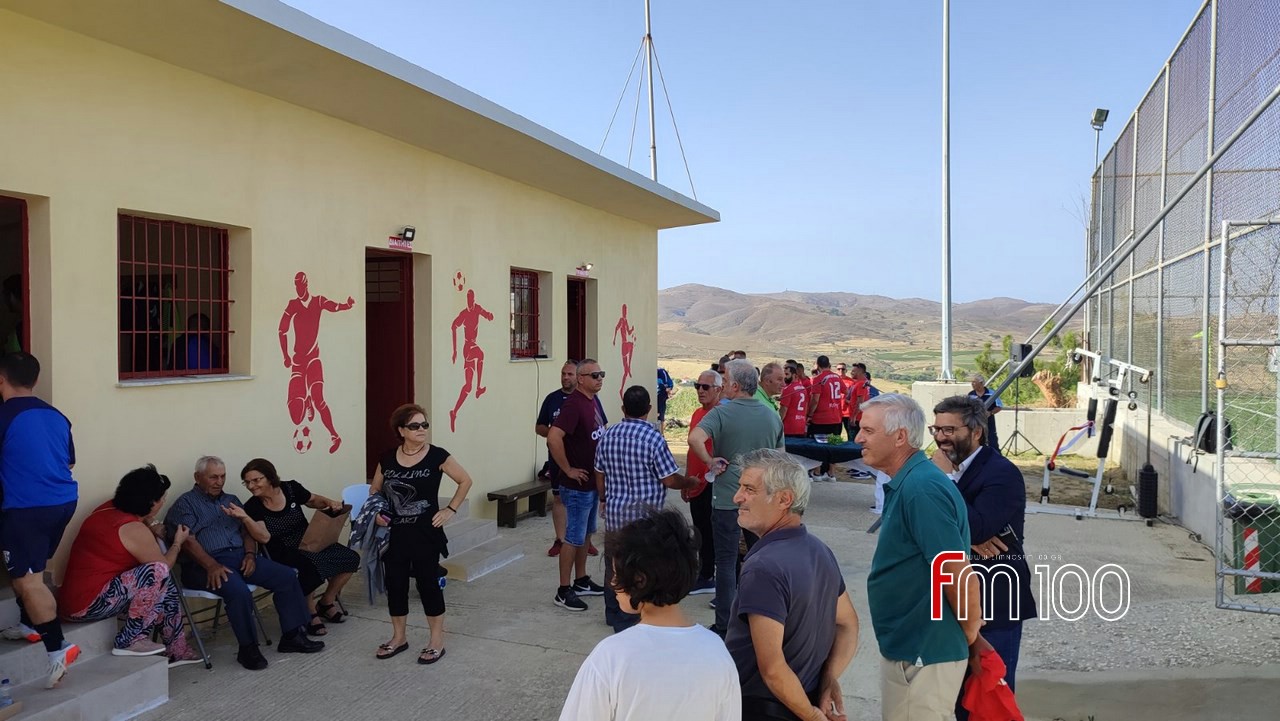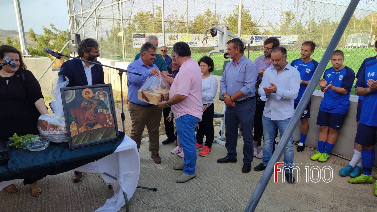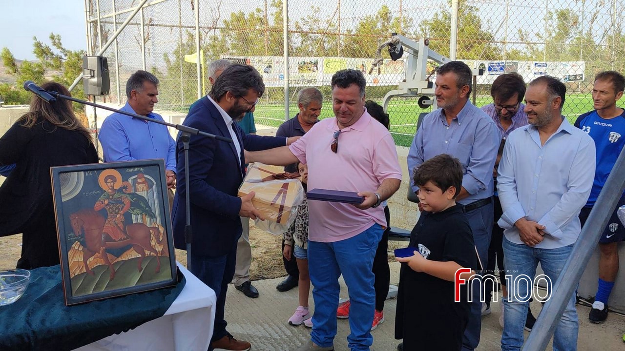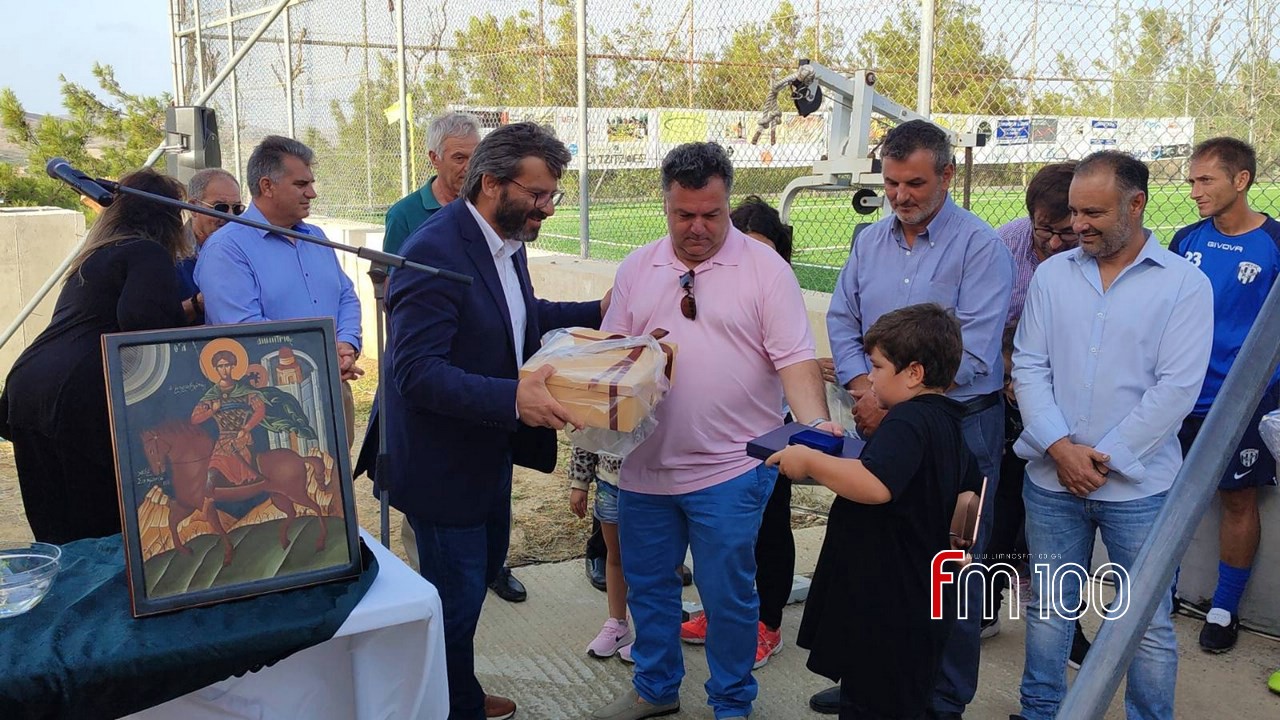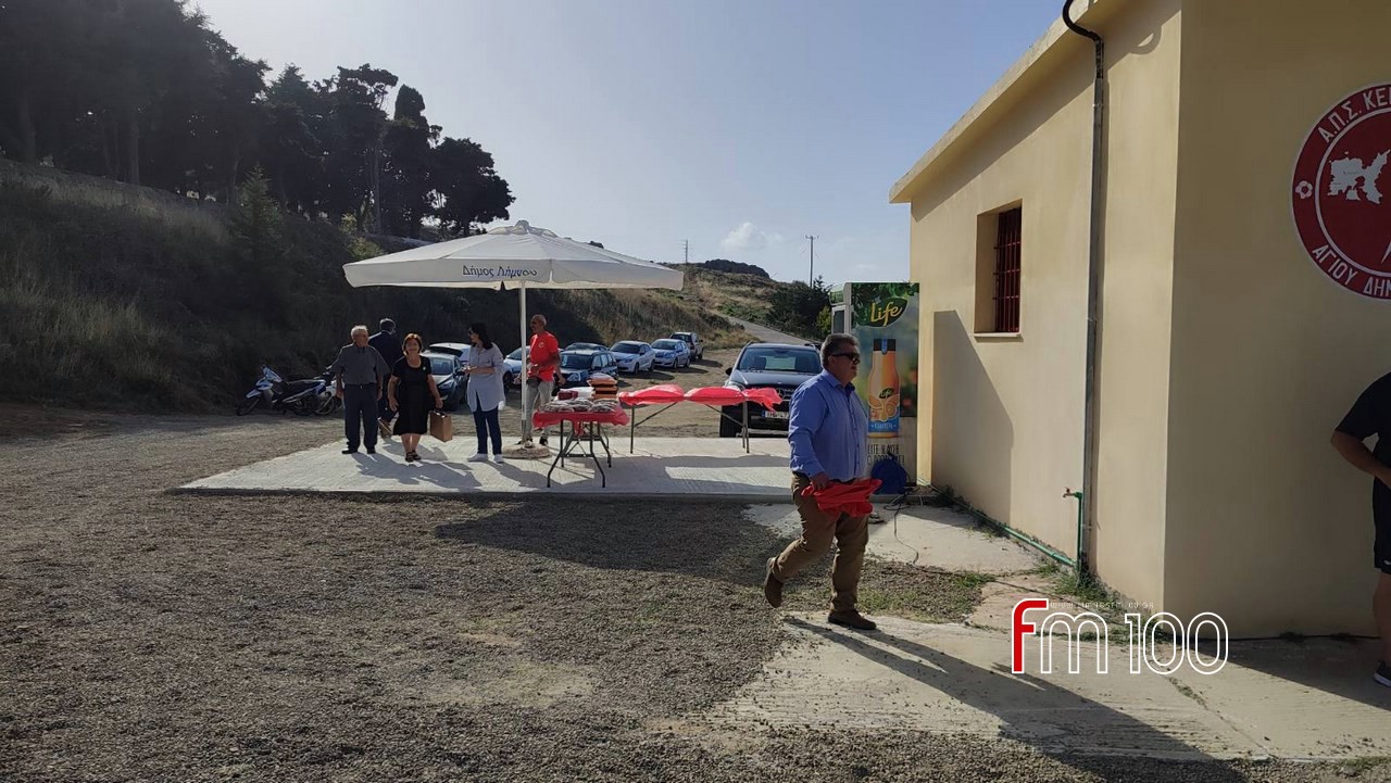 Η εκδήλωση των εγκαινίων συνεχίστηκε με ανταλλαγή δώρων μεταξύ του Δημάρχου και του Προέδρου του «Αετού Λουτρών» κ. Νίκου Σπανού, ενώ ακολούθησαν η κοπή της κορδέλας και ο φιλικός αγώνας Κεραυνού Αγ. Δημητρίου – Αετού Λουτρών, όπου το σκορ ήταν 1-5 υπέρ της ομάδας της Λέσβου.