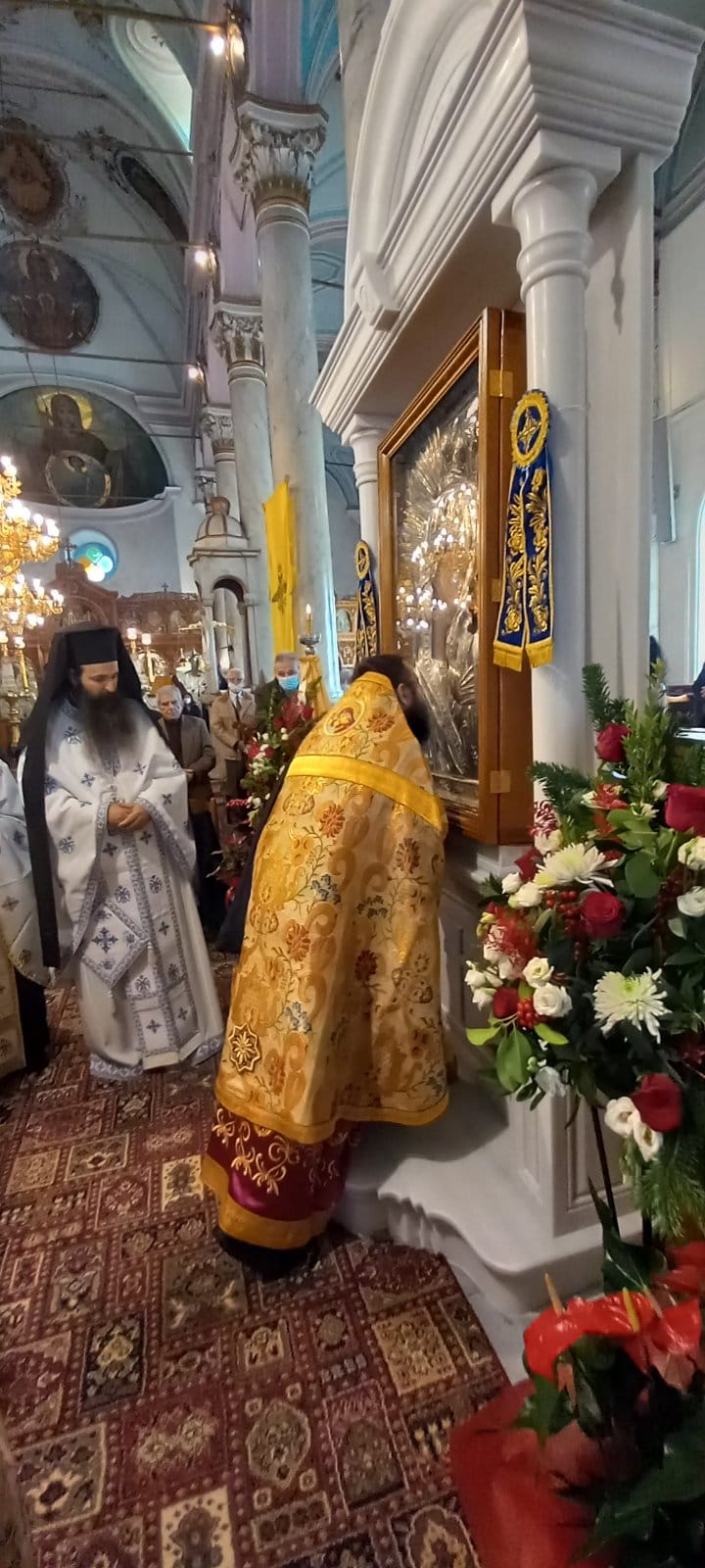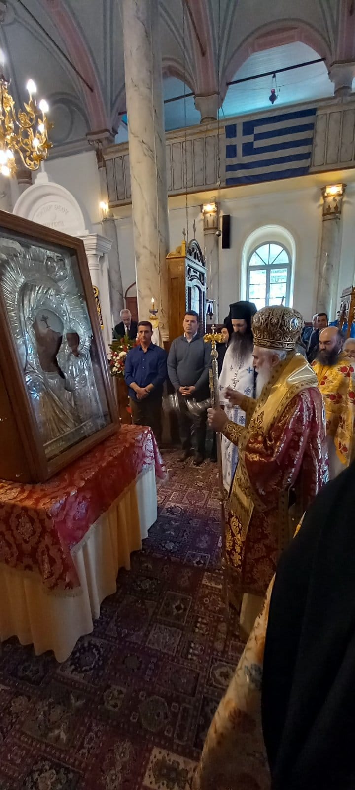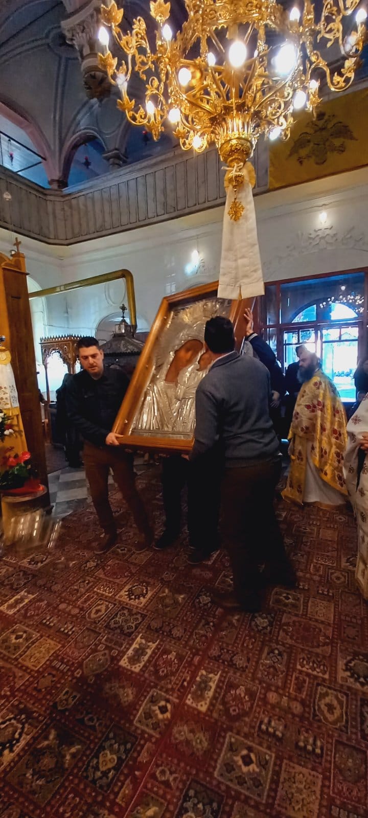 Το ιερό εικόνισμα αφού προηγουμένως λιτανεύθηκε εντός του Ιερού Ναού προεξάρχοντος του Σεβ. Μητροπολίτου μας, τον οποίο πλαισίωσαν οι συλλειτουργούντες ιερείς και διάκονοι, ψαλλομένου του αρχαγγελικού ύμνου «Άξιον Εστίν» υπό του χορού των ιεροψαλτών, εναποτέθηκε στο μαρμάρινο προσκυνητάριο.