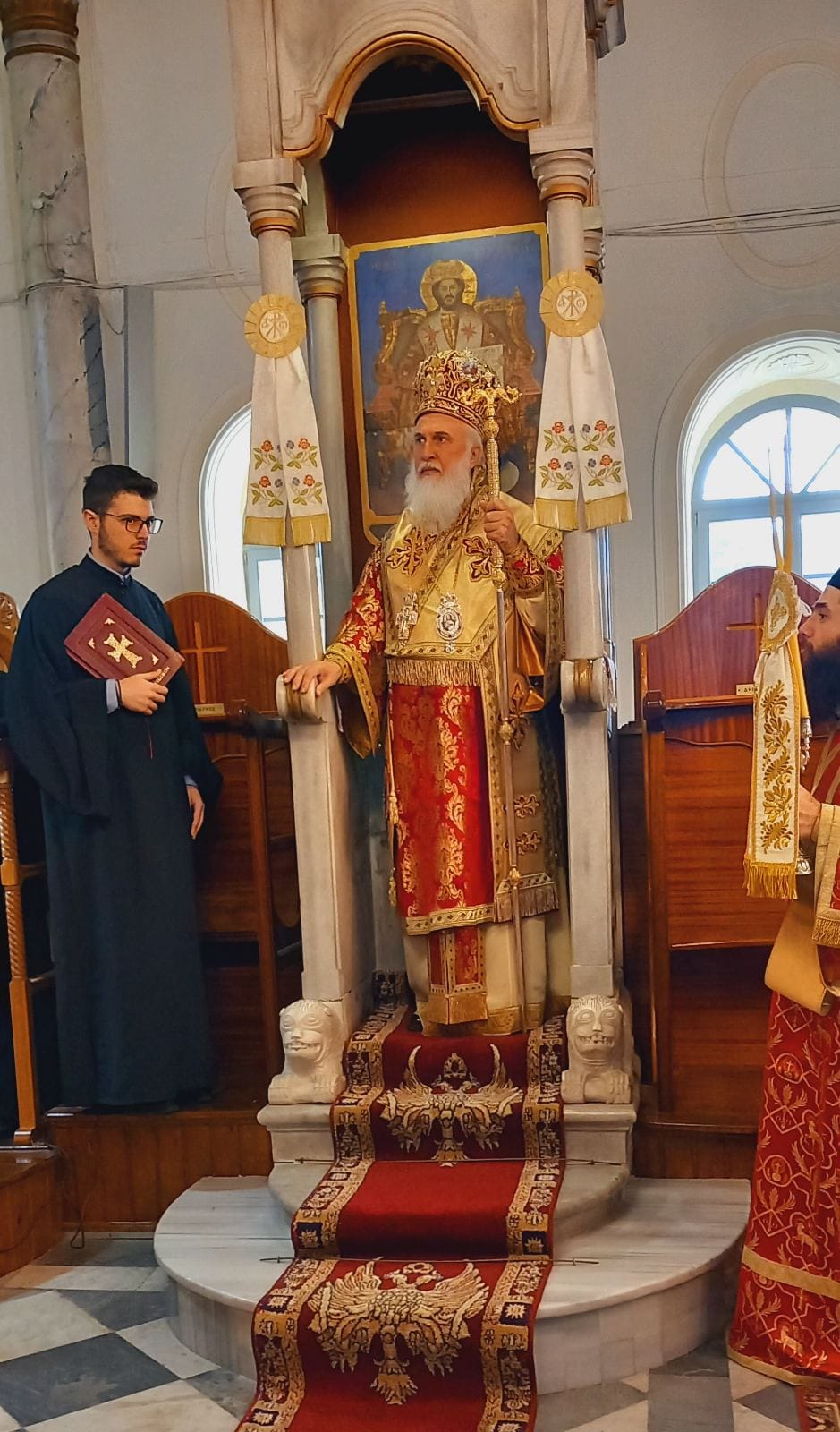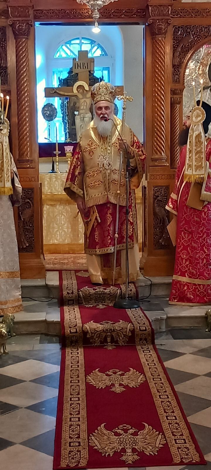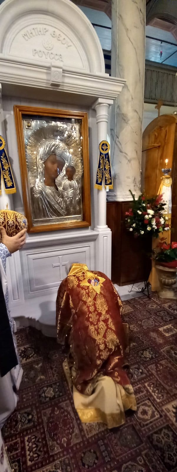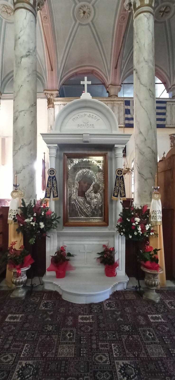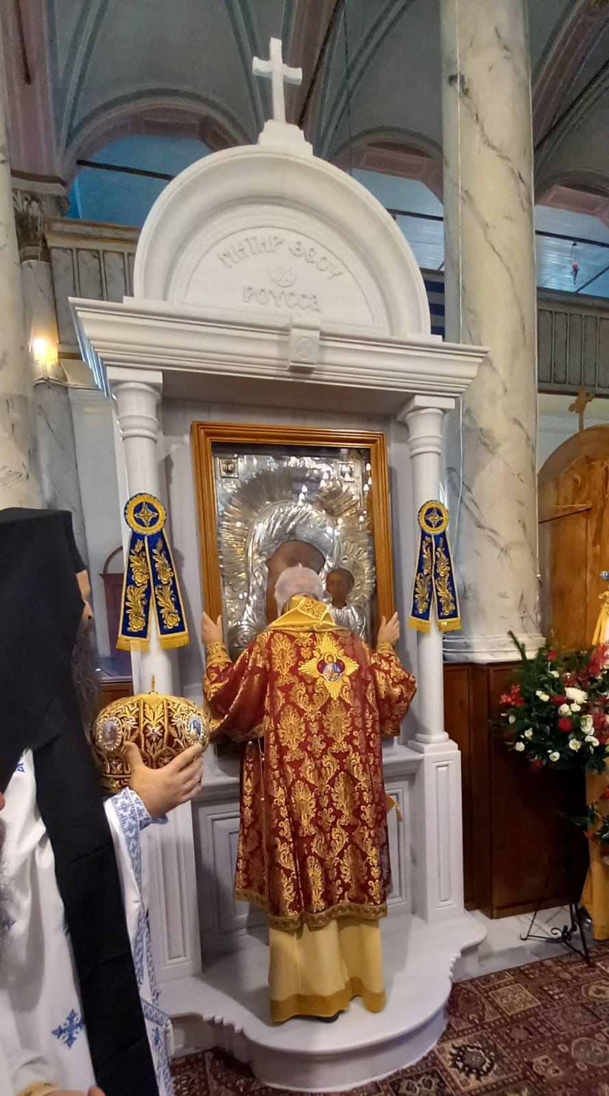 Προ του τέλους της ευχαριστιακής συνάξεως, ο Σεπτός Ποιμενάρχης μας απευθυνόμενος στο εκκλησίασμα τόνισε το νόημα της σημερινής Θεομητορικής εορτής, αλλά και το σπουδαίο εκκλησιαστικώς ιστορικό γεγονός της ενθρονίσεως της ιεράς εικόνος της Παναγίας της «ΡΟΥΣΣΑΣ» στο καλλιμάρμαρο και περίτεχνο προσκυνητάριο, το οποίο φιλοτεχνήθηκε σε ειδικό εργαστήριο μαρμαρογλυπτικής στην Αθήνα και είναι αποτέλεσμα της ευλαβικής χορηγίας των ευσεβών ενοριτών, προκειμένου να διαφυλάξουν και να θέσουν σε προσκύνημα εις το διηνεκές το ιερό εκτύπωμα της Θεομήτορος, που η ευλάβεια των προγόνων τους σε χρόνους χαλεπούς θησαύρισε στον Ιερό Ναό από την μακρινή Ρωσία, για να σκέπει και να περιφρουρεί την πόλη της Μυρίνης.