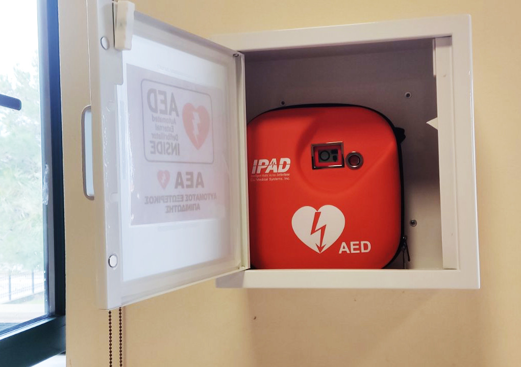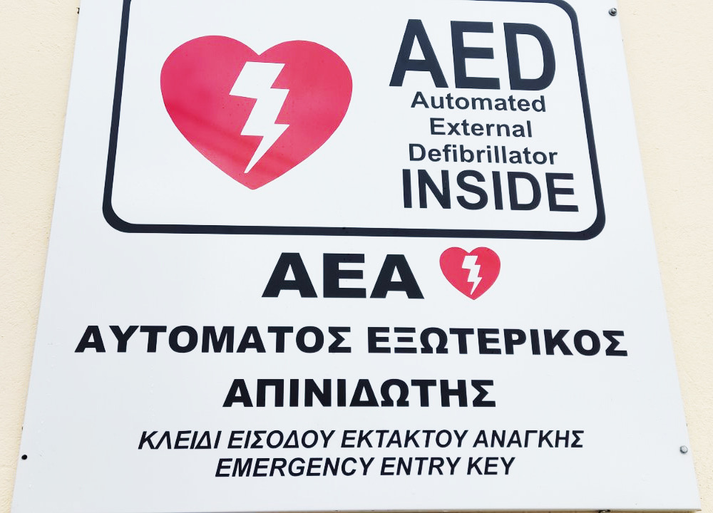 Αν παραστεί ανάγκη, με την ειδική μεταλλική ράβδο σπάει το μικρό τζάμι και υπάρχει άμεση πρόσβαση στο κλειδί που επιτρέπει την πρόσβαση στον απινιδωτή.