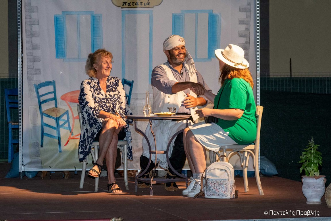 Η αφήγηση αποδόθηκε στην τοπική διάλεκτο από τον κ. Φώτη Πινάκο, στο ρόλο του Κιαχαγιά - σύμβολο της λημνιακής αγροτοκτηνοτροφικής αλλά και μουσικοχορευτικής παράδοσης - σε κείμενα της κ. Άντζελας Κονιδάρη και διαλόγους της κ. Φανής Λούγκλου. Τον Κιαχαγιά συντρόφευσαν επί σκηνής, στον ρόλο των τουριστριών οι κ. Φανή Λούγκλου και Μαρτίν Γκρεπέν ενώ τον ρόλο του καφετζή, στο παραδοσιακό καφενείο “Η Πατατιά”, απέδωσε ο κ. Γρηγόρης Παπακανάκης.