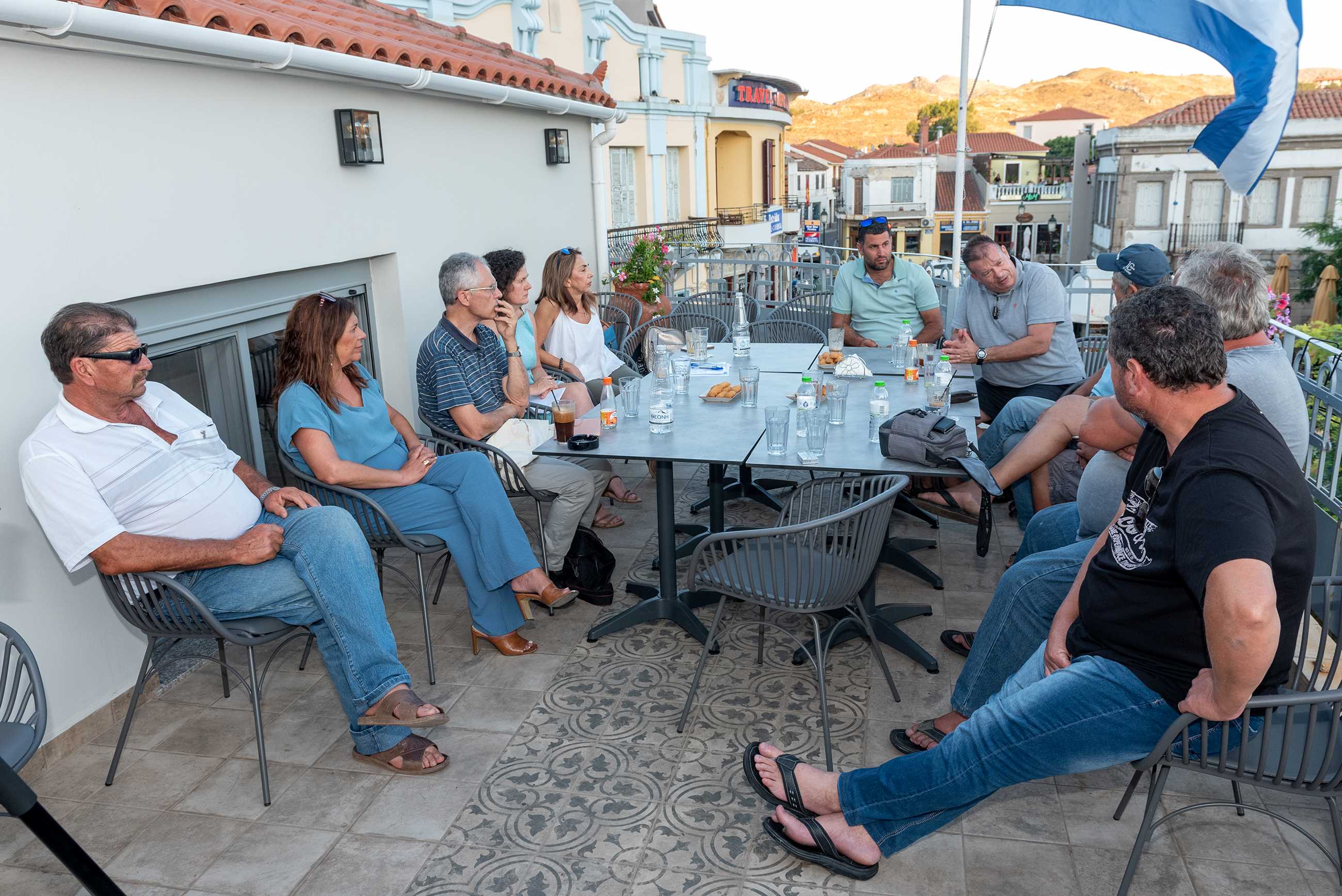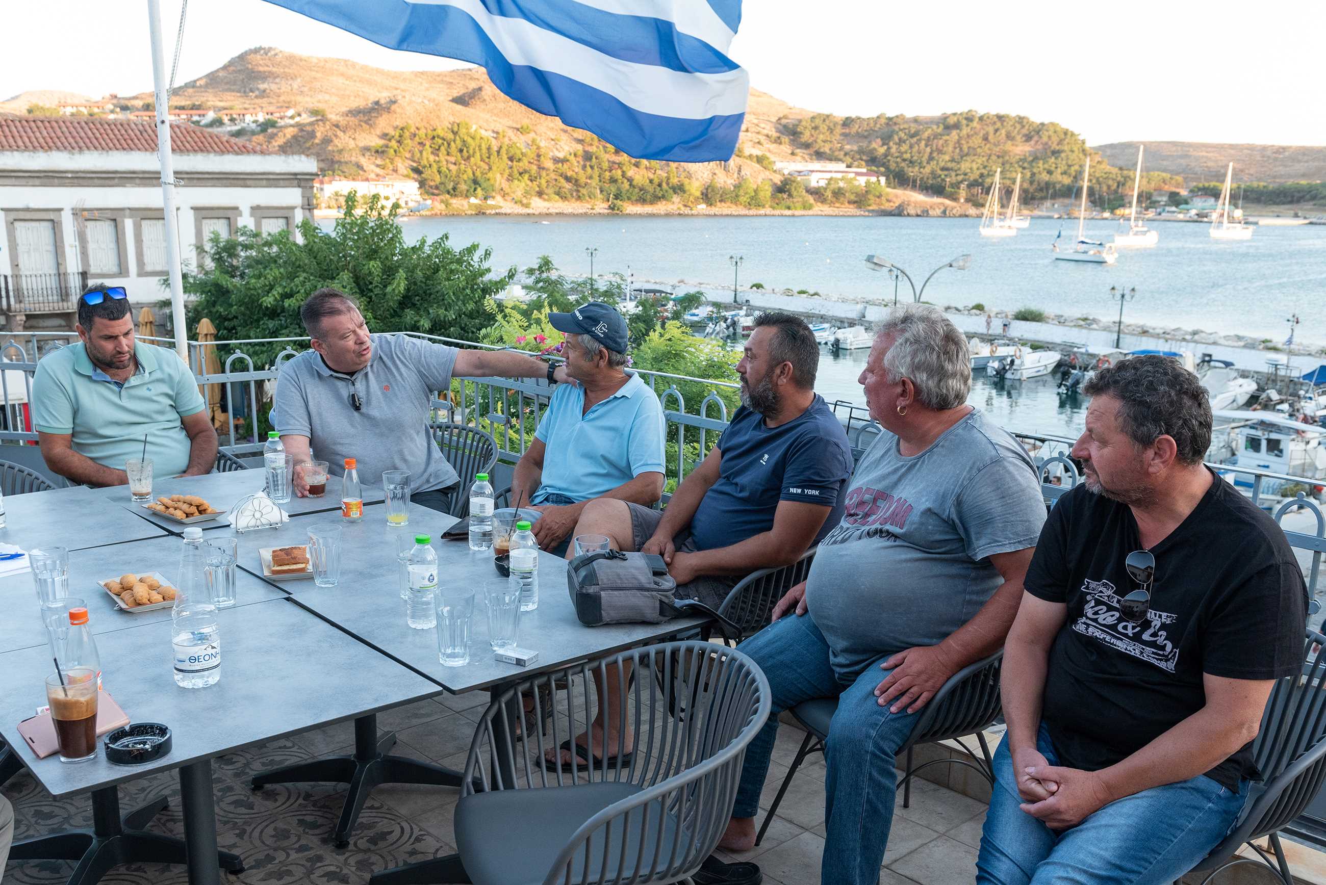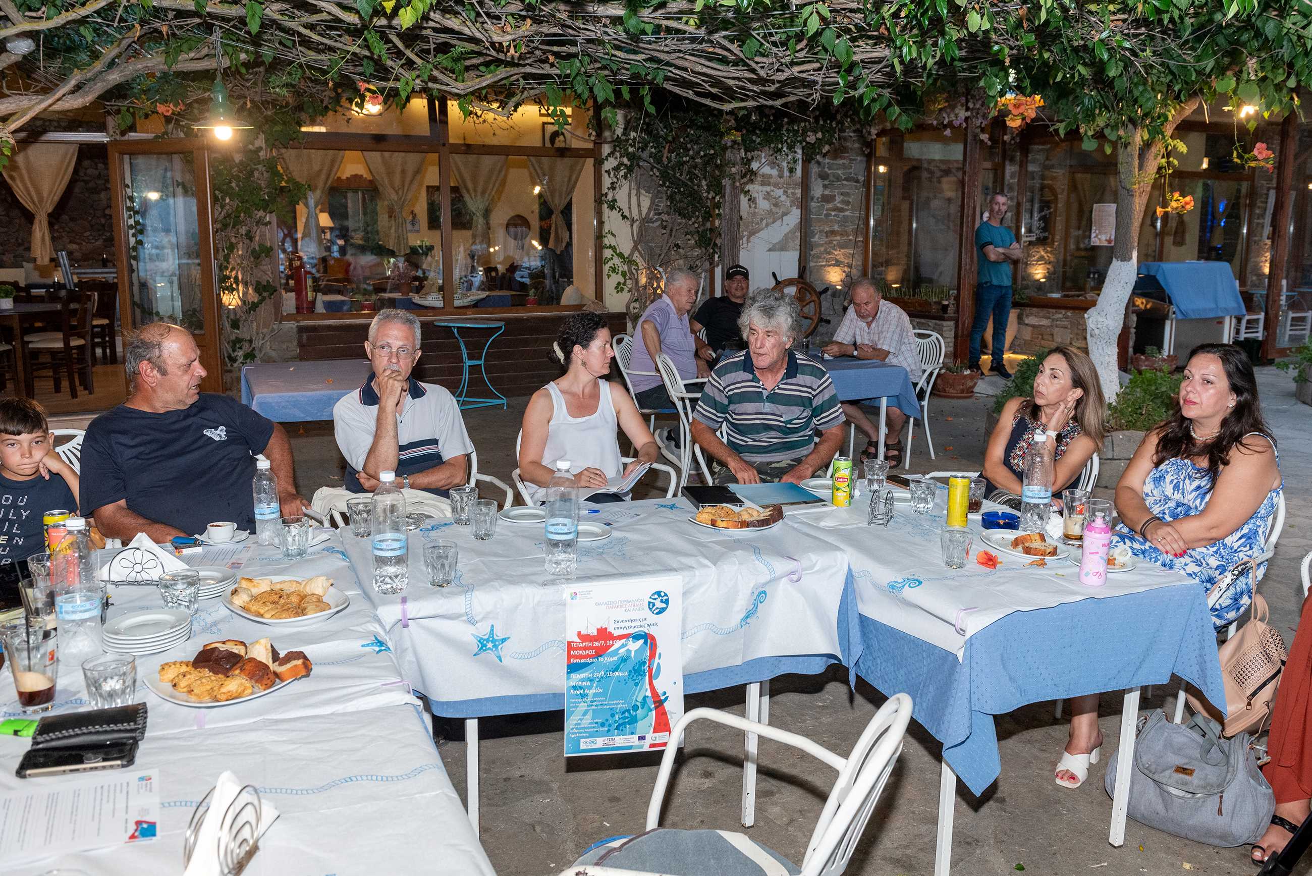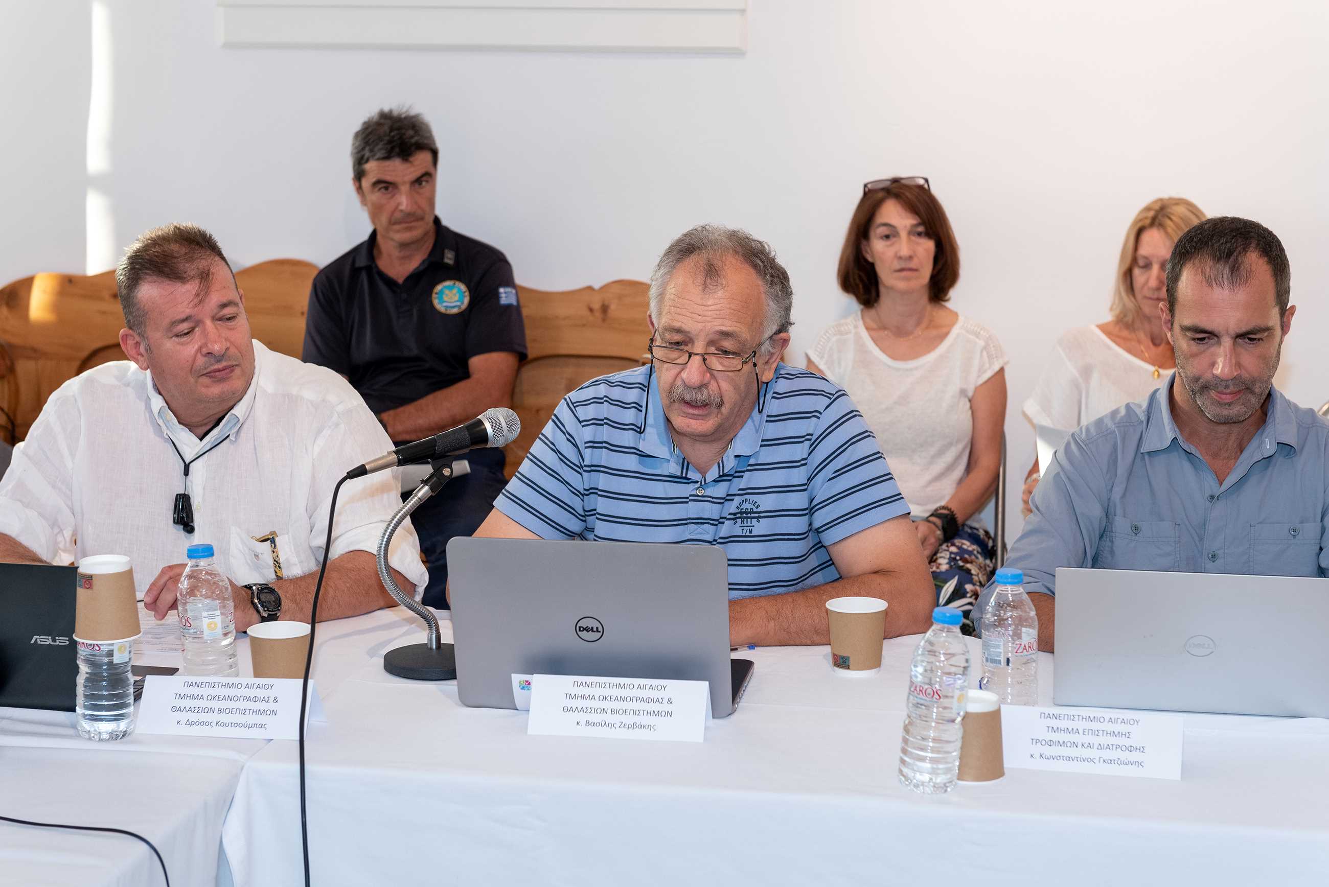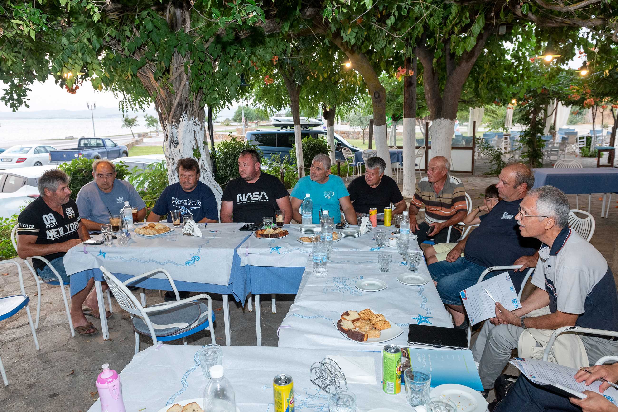 Μέρος των δράσεων του σχεδίου, αποτέλεσαν συναντήσεις με επαγγελματίες αλιείς που πραγματοποιήθηκαν στις 26 και 27 Ιουλίου, στο Μούδρο και στη Μύρινα αντίστοιχα. Στις συναντήσεις, παρουσία του κ. Μιχάλη Πασπάτη, προϊστάμενου της Γενικής Διεύθυνσης Αγροτικής Οικονομίας, Κτηνιατρικής και Αλιείας της Περιφέρειας Β. Αιγαίου, καθώς και του κ. Δρόσου Κουτσούμπα, καθηγητή θαλάσσιας Βιολογίας του Τμήματος Ωκεανογραφίας και Θαλάσσιων Βιοεπιστημών του Παν/μίου Αιγαίου, συζητήθηκαν και καταγράφηκαν προβλήματα και απειλές στον τομέα της αλιείας που προέρχονται από τις επιπτώσεις της ρύπανσης και της κλιματικής αλλαγής. Αναδείχθηκαν προβλήματα και πιέσεις κυρίως από την υπεραλίευση, την παρουσία κητωδών και τη ρύπανση που απειλούν κατά κύριο λόγο την επάρκεια και την ποιότητα των αλιευμάτων και κατ’ επέκταση το επάγγελμα των αλιέων.