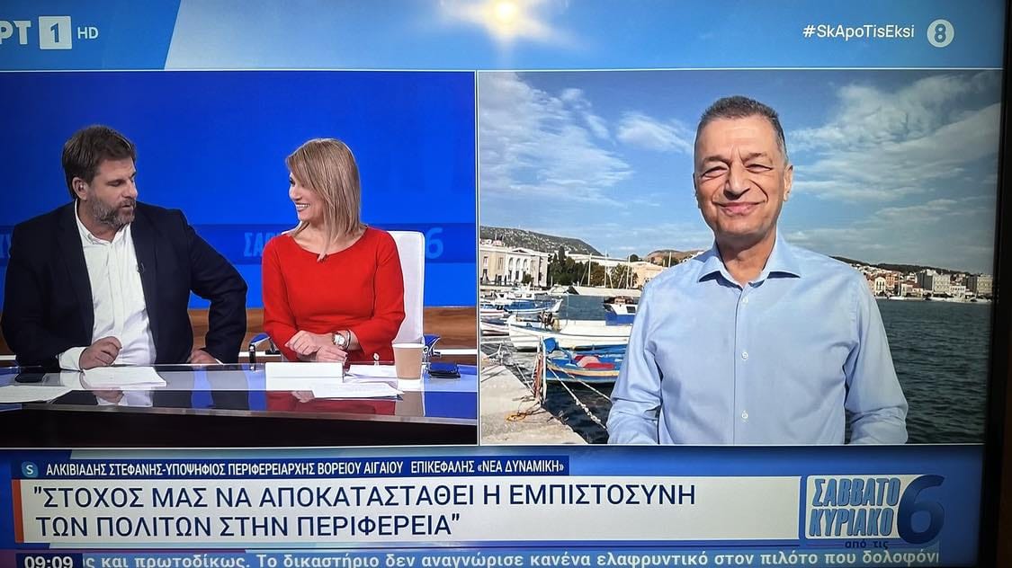 Ο επικεφαλής του συνδυασμού «ΝΕΑ ΔΥΝΑΜΙΚΗ» από μια χαρακτηριστική γωνιά της πόλης της Μυτιλήνης, κι έχοντας στο πίσω μέρος του να δεσπόζει ο επιβλητικός τρούλος του Αγ. Θεράποντα, παραχώρησε συνέντευξη στην ΕΡΤ 1, στην πρωινή εκπομπή «Σαββατοκύριακο από τις 6» με τους κ. Δημήτρη Κοτταρίδη και κα. Νίνα Κασιμάτη. Μεταξύ άλλων, ανέφερε: «Καλημέρα σας, από την όμορφη πόλη της Μυτιλήνης με τους καταπληκτικούς ανθρώπους της. Είμαστε εδώ για να προσφέρουμε στην πατρίδα, στο Βόρειο Αιγαίο. Αυτός είναι ο μοναδικός σκοπός μας, γι’ αυτό είμαι εδώ. Σας το λέει ένας άνθρωπος που έχει την τιμή να υπηρετεί την πατρίδα εδώ και 45 χρόνια. Ξημερώνουν καλύτερες ημέρες για τα νησιά μας, με το Βόρειο Αιγαίο να βρίσκεται εκεί που του αξίζει, στην πρώτη γραμμή».