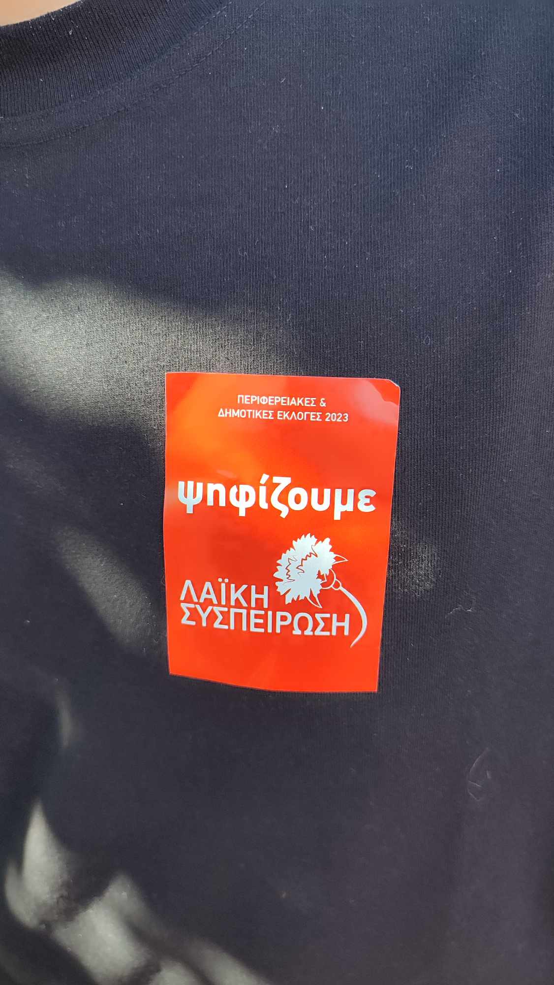 Τον κ. Μαδυτινό συνόδευαν υποψήφιοι δημοτικοί σύμβουλοι της παράταξης, φορώντας στο σημείο της καρδιάς αυτοκόλλητο με το έμβλημα του συνδυασμού.