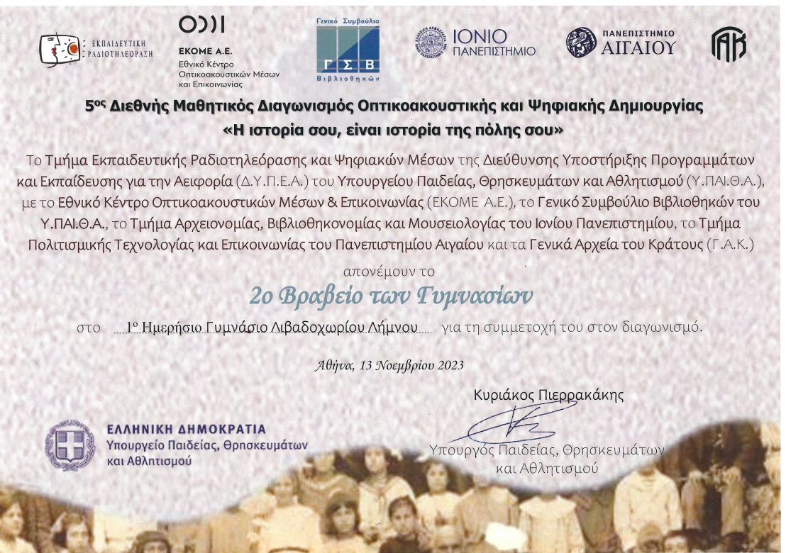 3ο Βραβείο Ντοκιμαντέρ και 2ο Βραβείο Αφίσας στην κατηγορία ντοκιμαντέρ Γυμνασίων στον Διαγωνισμό "CΙΝΕμάθεια, 2023" Φεστιβάλ Μαθητικών Ταινιών Βορείου και Νοτίου Αιγαίου.