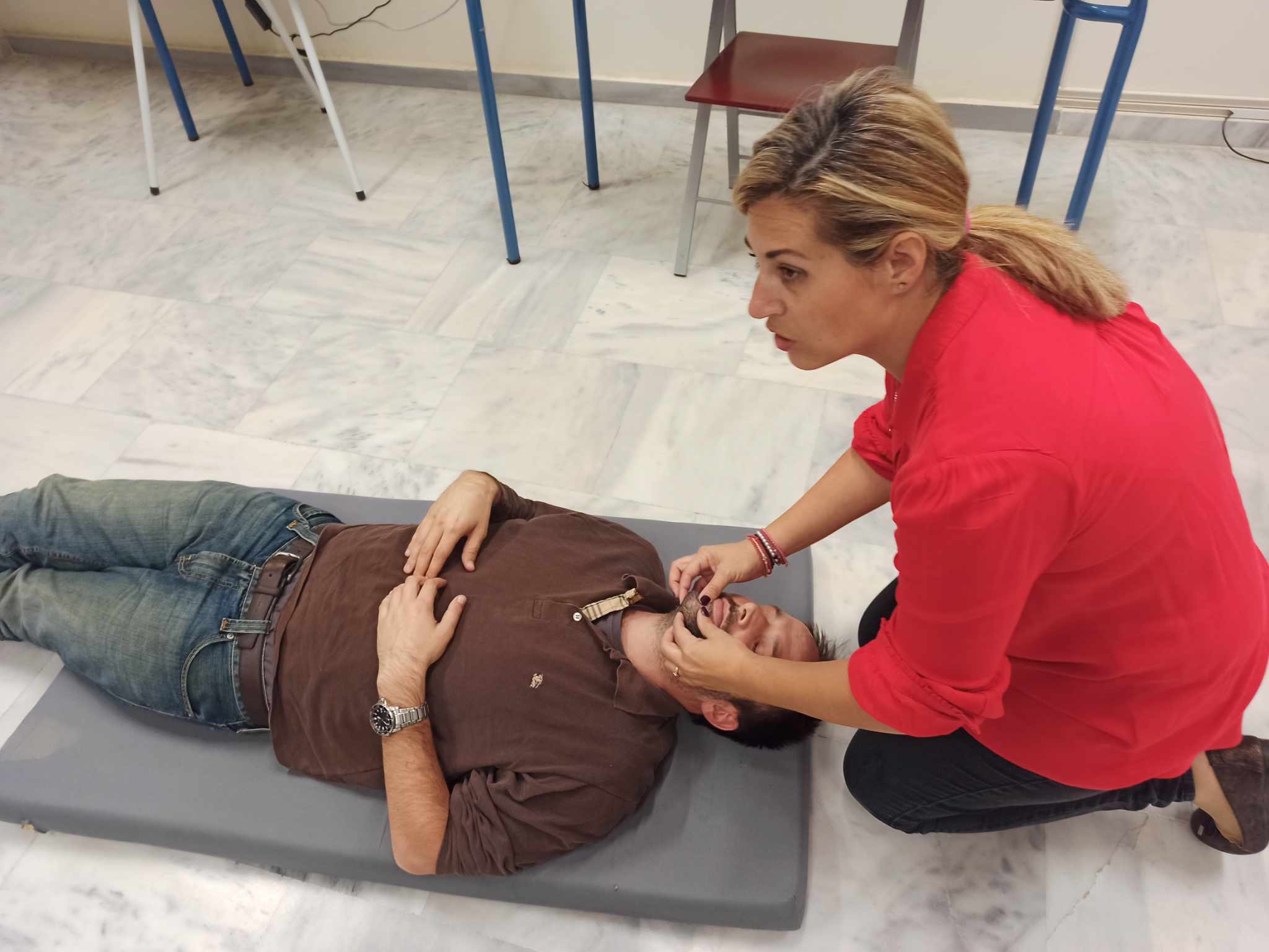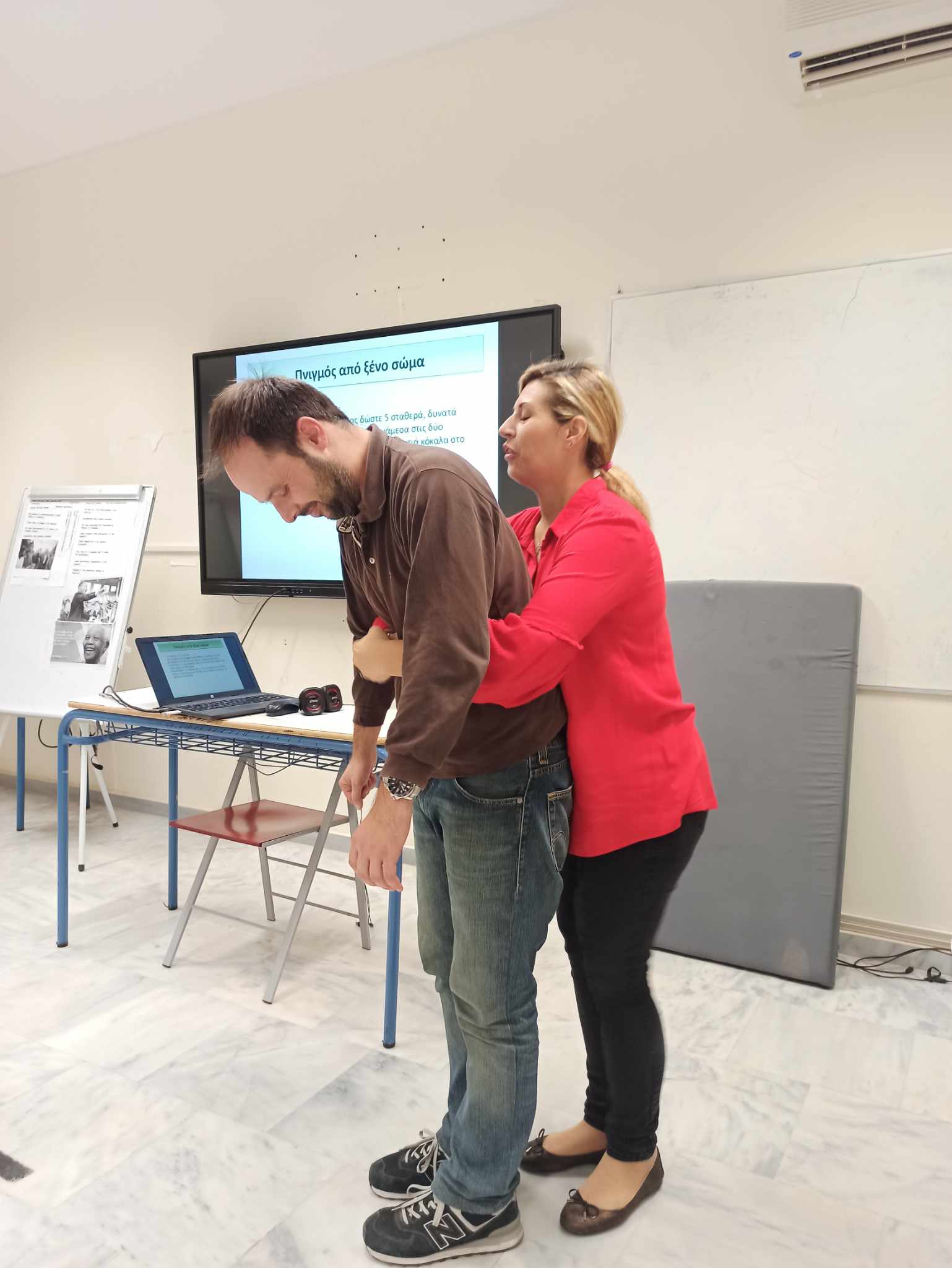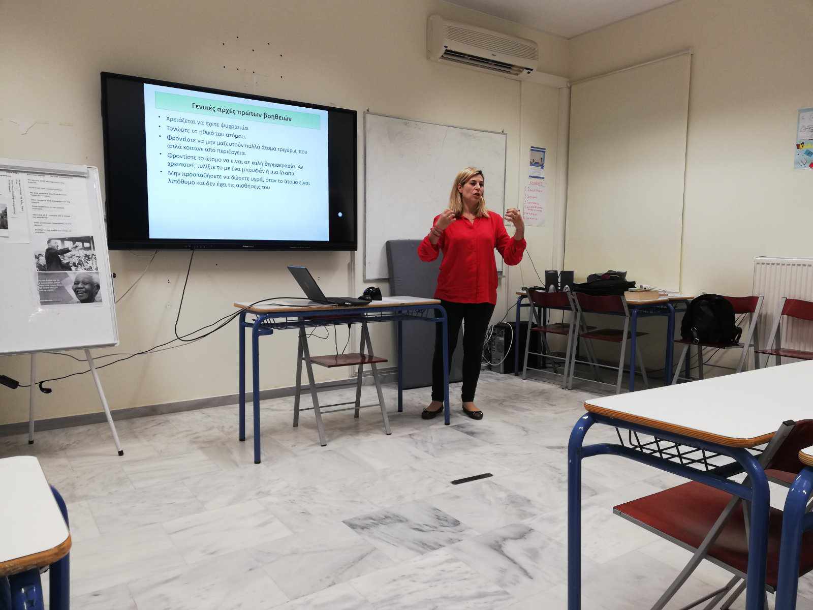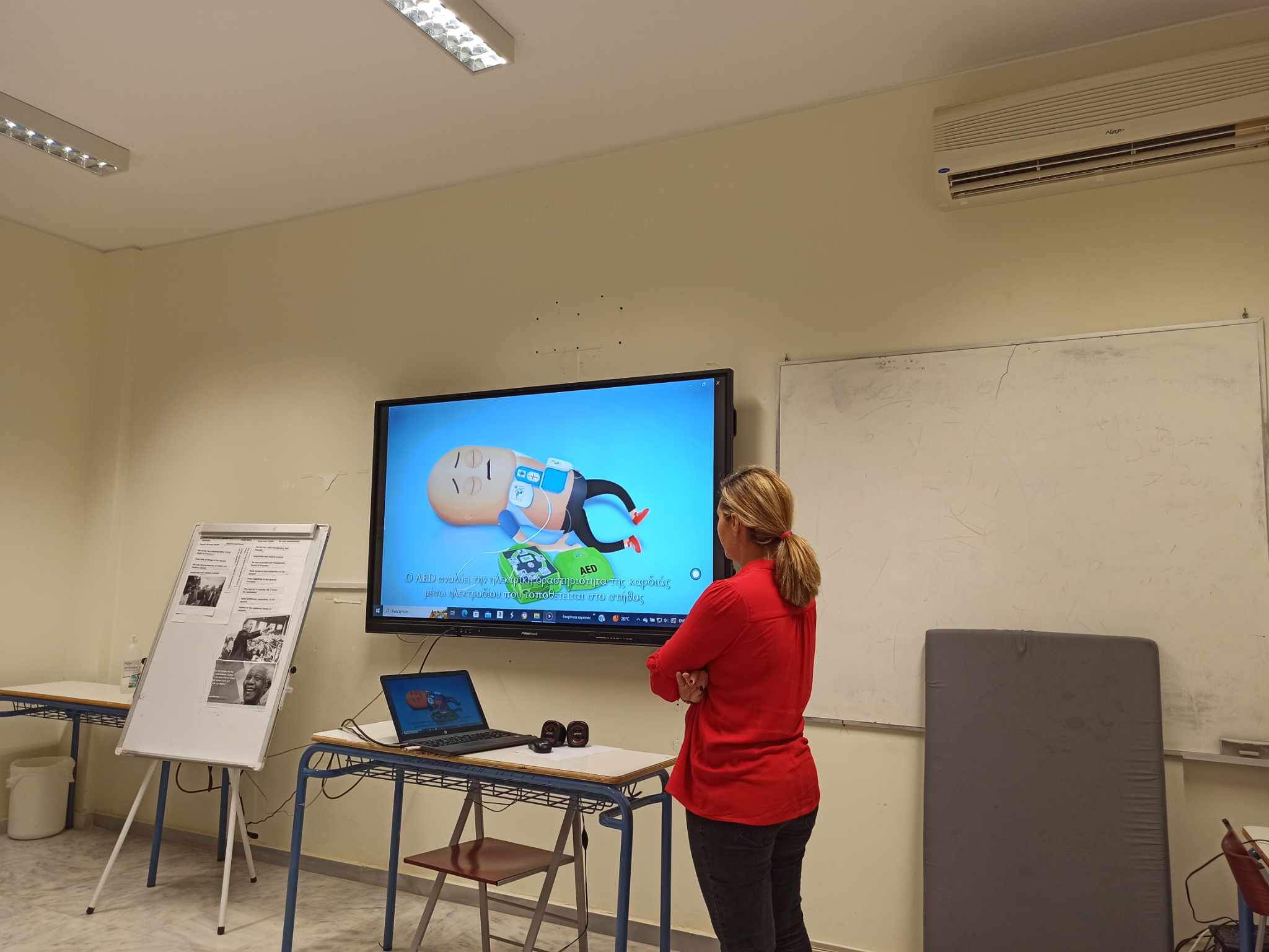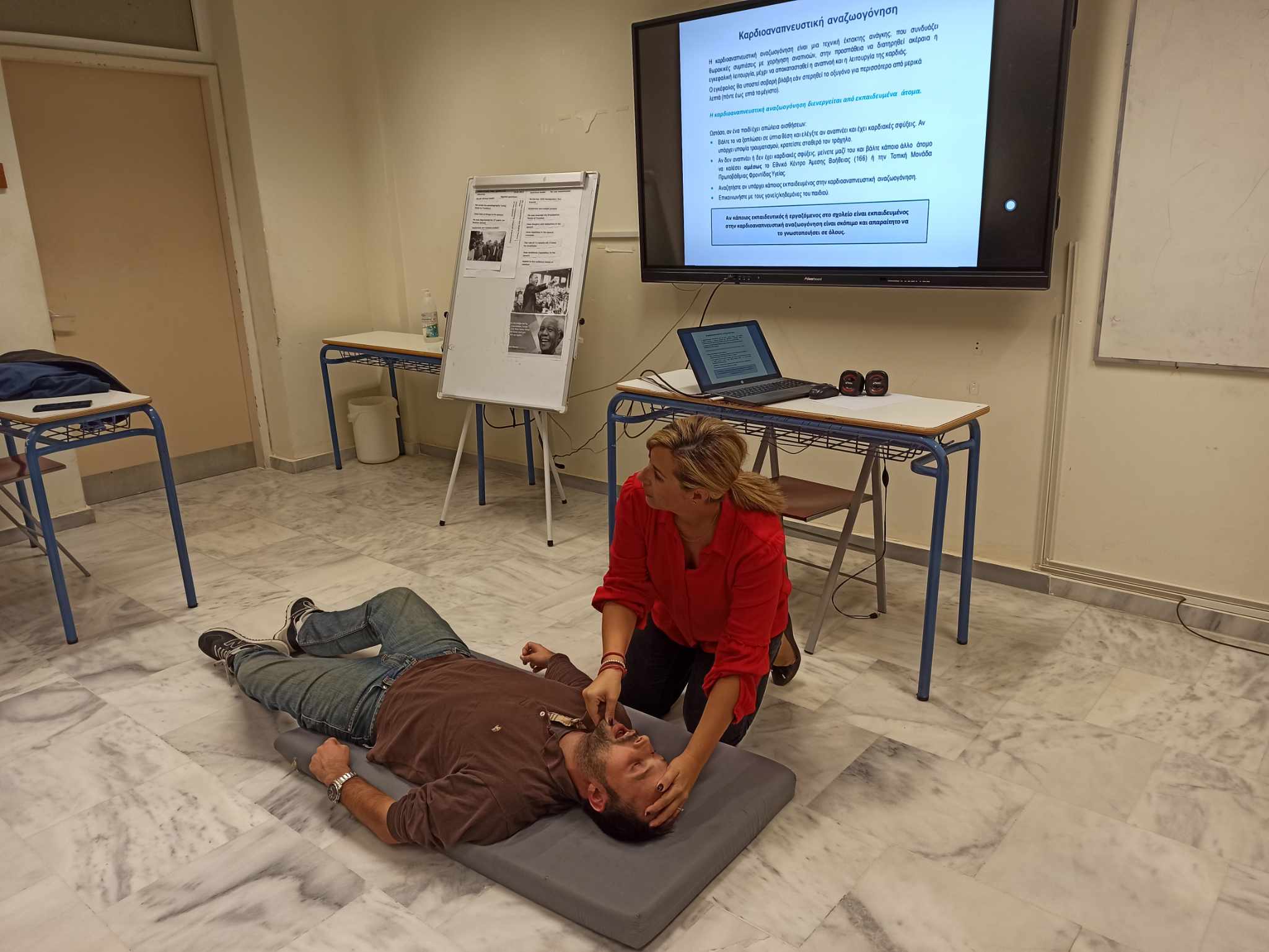 Μας μίλησε, λοιπόν, για την σπουδαιότητα των πρώτων βοηθειών και τον σωστό τρόπο παροχής φροντίδας σε άτομα που ασθενούν ξαφνικά ή τραυματίζονται. Ο Σύλλογος Διδασκόντων ενημερώθηκε για την αναγνώριση και αντιμετώπιση των λιποθυμικών επεισοδίων, των αιμορραγιών-ρινορραγιών, την παροχή πρώτων βοηθειών σε διαστρέμματα-κατάγματα-εξαρθρήματα και κοιλιακό πόνο. Επιπλέον, πραγματοποιήθηκε επίδειξη χειρισμού με την τεχνική Heimlich, ΚΑΡΠΑ και τη χρήση Αυτόματου Εξωτερικού Απινιδωτή (ΑΕΑ). Δεν παρέλειψε να αναφερθεί στην αντιμετώπιση περίπτωσης επιληπτικής κρίσης.