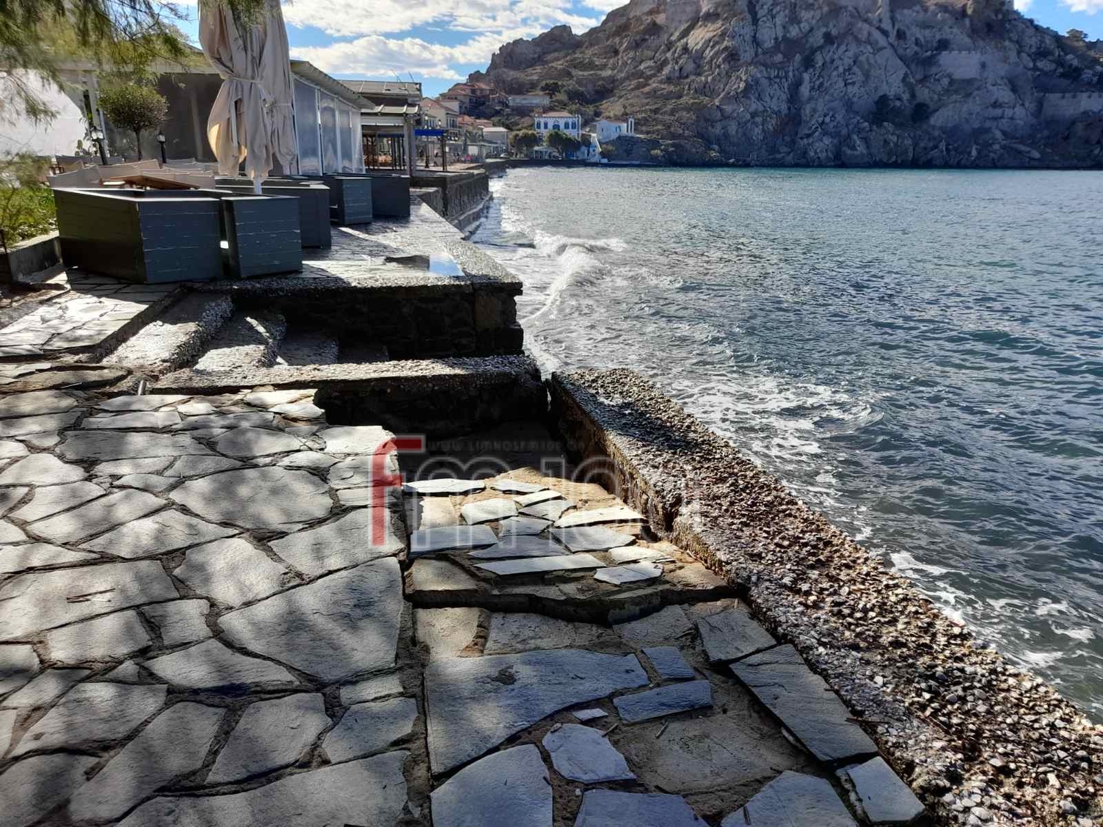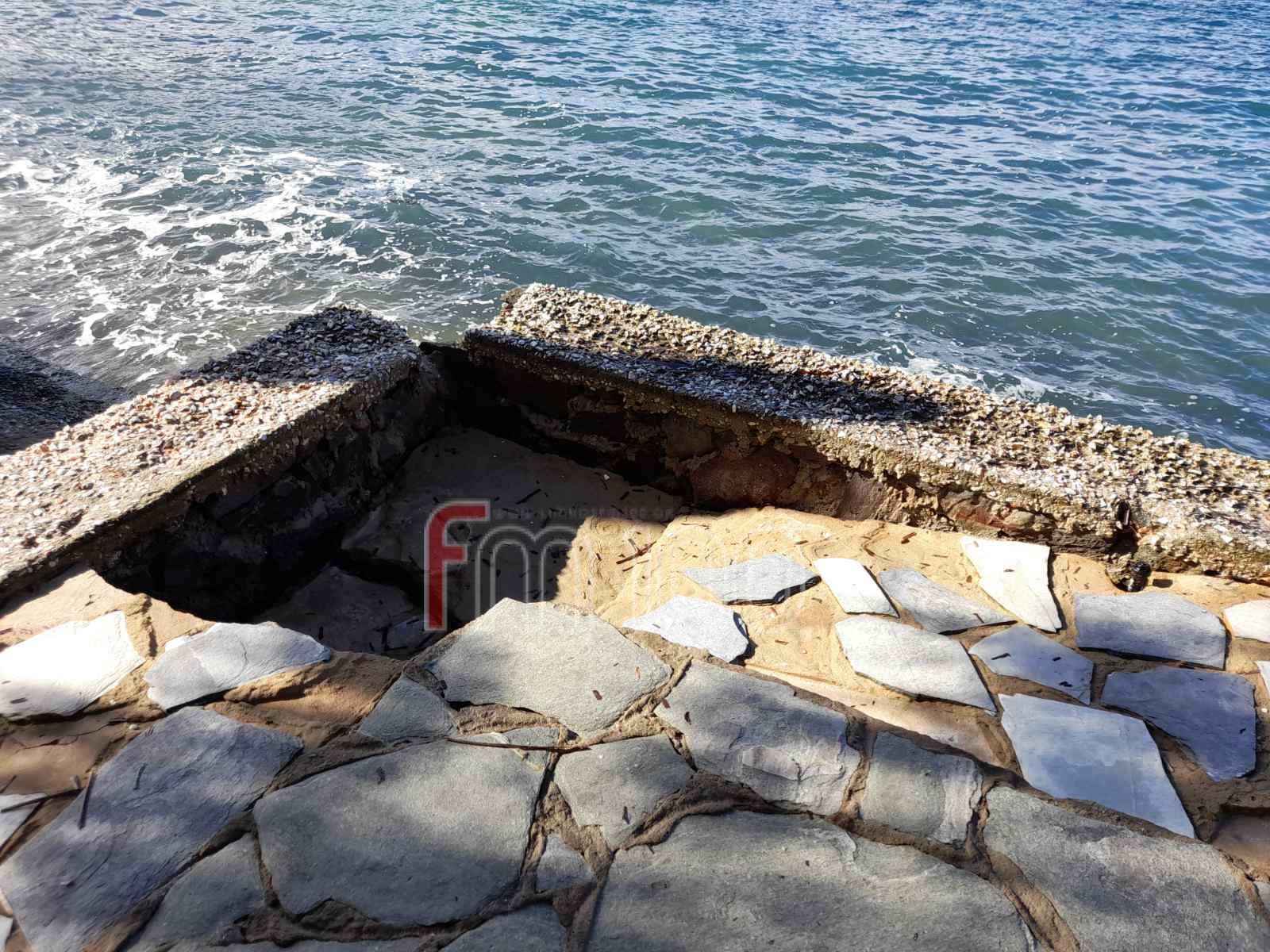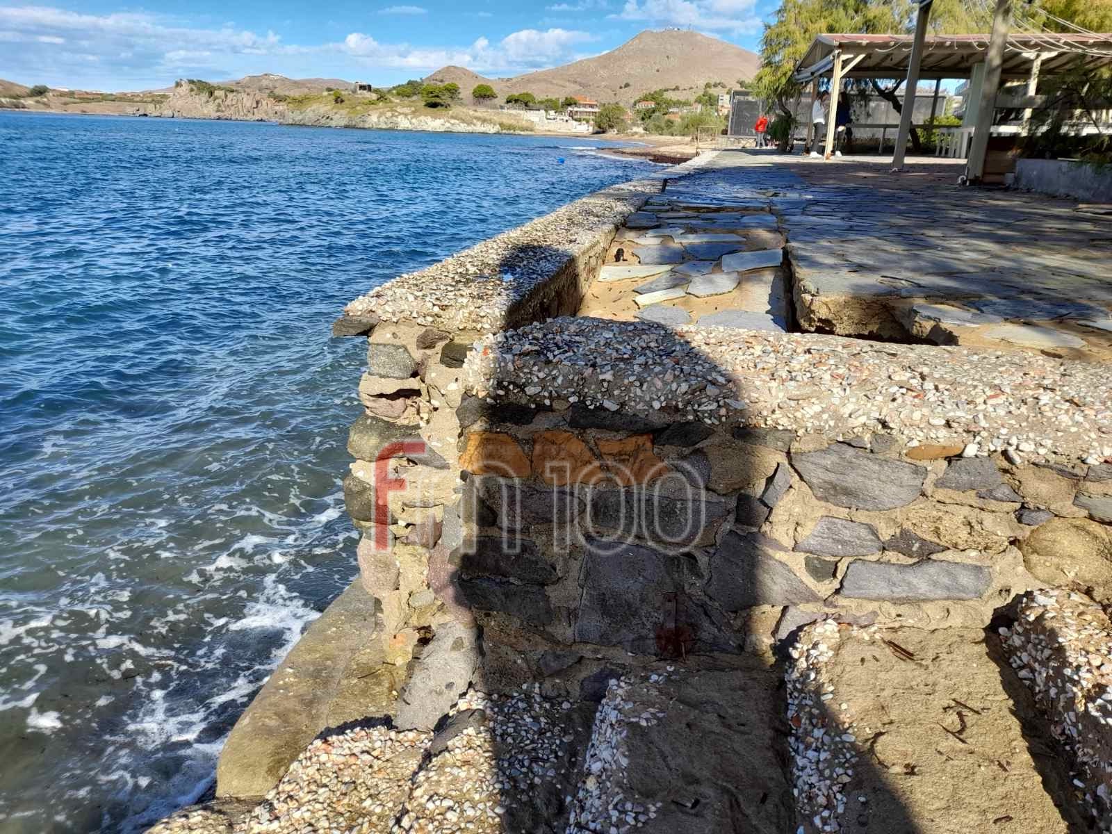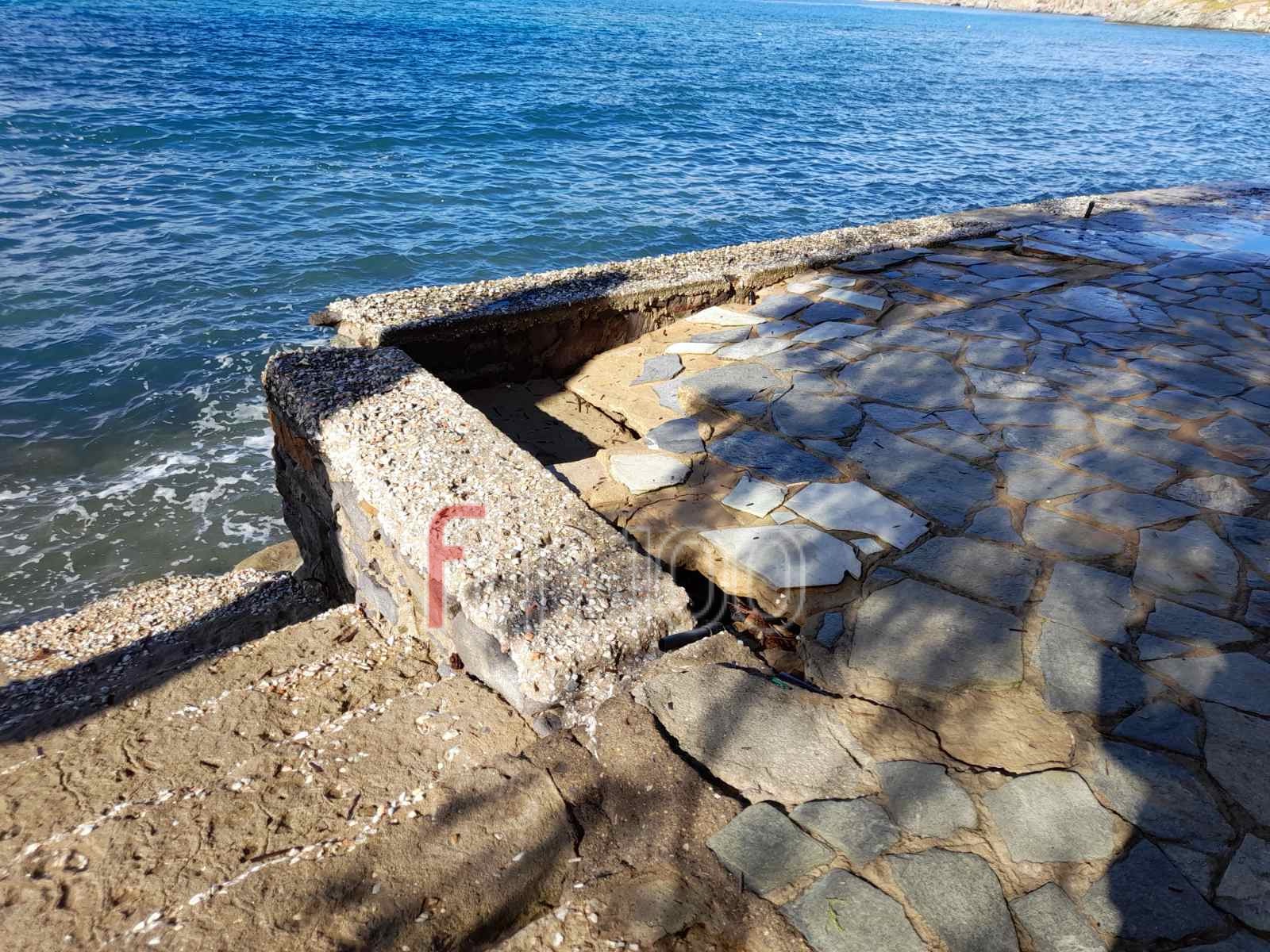 Τα μανιασμένα κύματα στο έλεος των οποίων βρέθηκε ο Ρωμέικος Γυαλός το Σάββατο, δημιούργησαν καθίζηση σε ένα τμήμα της πλατείας, ενώ από τις φωτογραφίες είναι εμφανές ότι στο επόμενο κύμα κακοκαιρίας, το «λαβωμένο» κομμάτι δεν θα αντέξει και μαζί με αυτό και το υπόλοιπο τοιχίο.