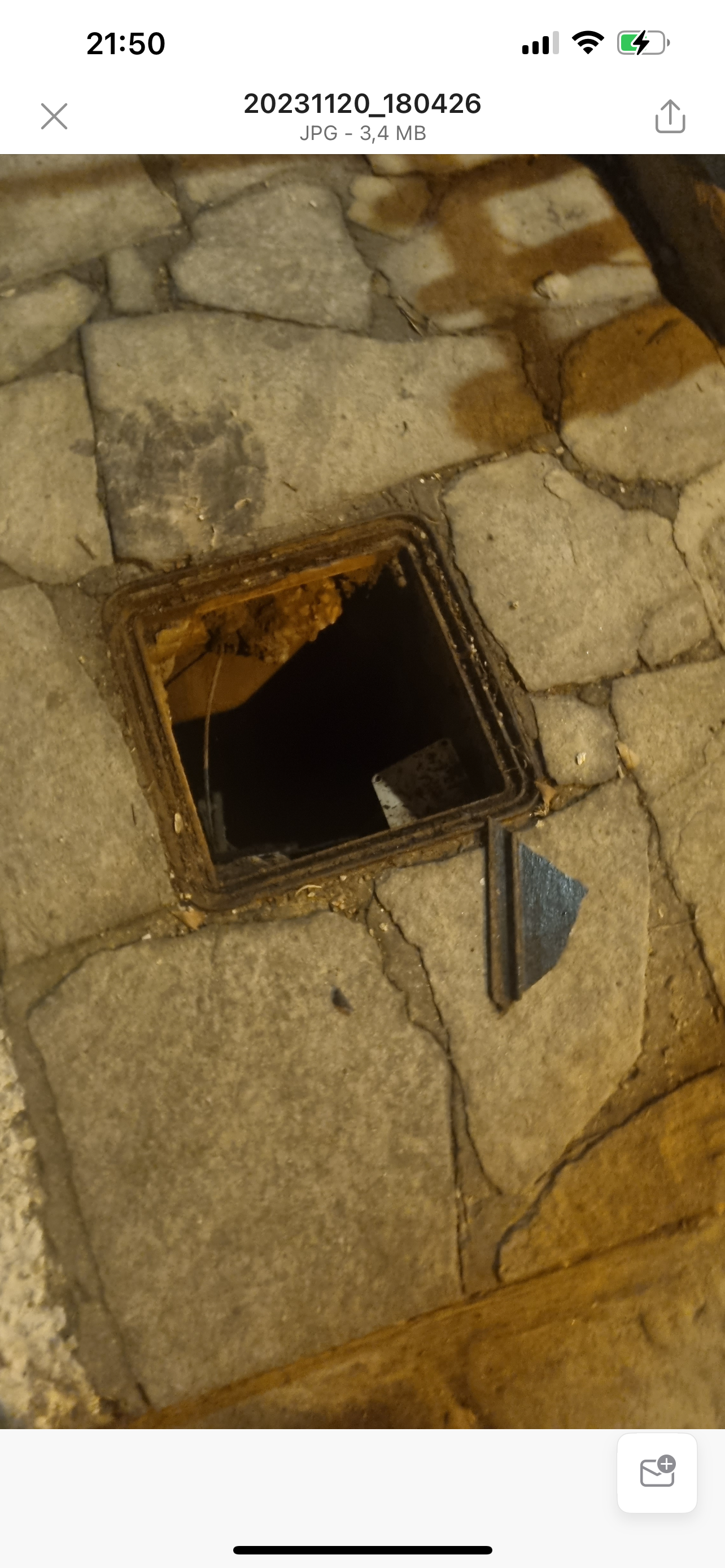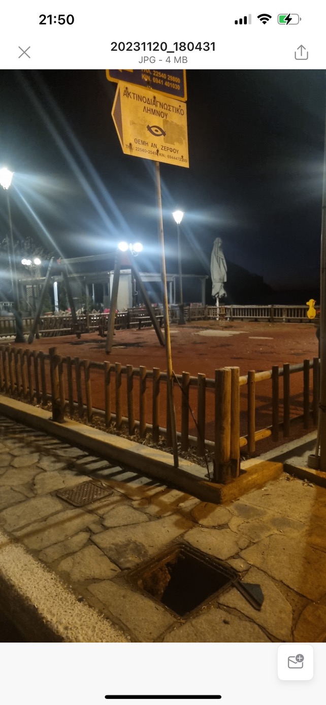 Όπως φαίνεται στις φωτογραφίες, ένα μεταλλικό καπάκι έχει αποκολληθεί και μια καθ' όλα επικίνδυνη τρύπα χάσκει στο πεζοδρόμιο.