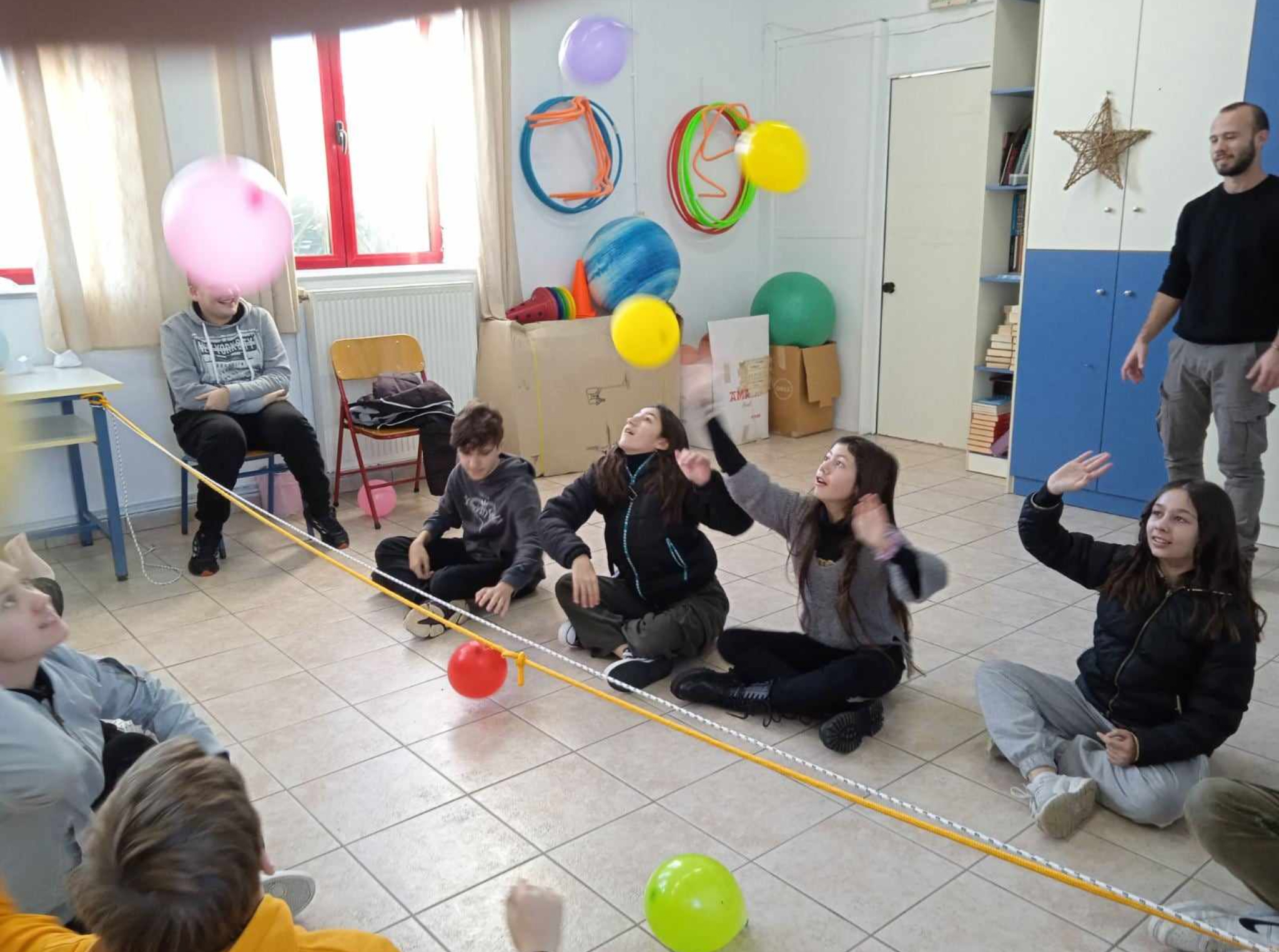Η γυμνάστρια και ο φυσικοθεραπευτής κινητοποίησαν τα παιδιά να παίξουν βόλεϊ, προσαρμοσμένο στις ανάγκες των ατόμων με κινητική αναπηρία. Σκοπός ήταν η ευαισθητοποίηση των μαθητών/τριών και η καλλιέργεια της ενσυναίσθησης.