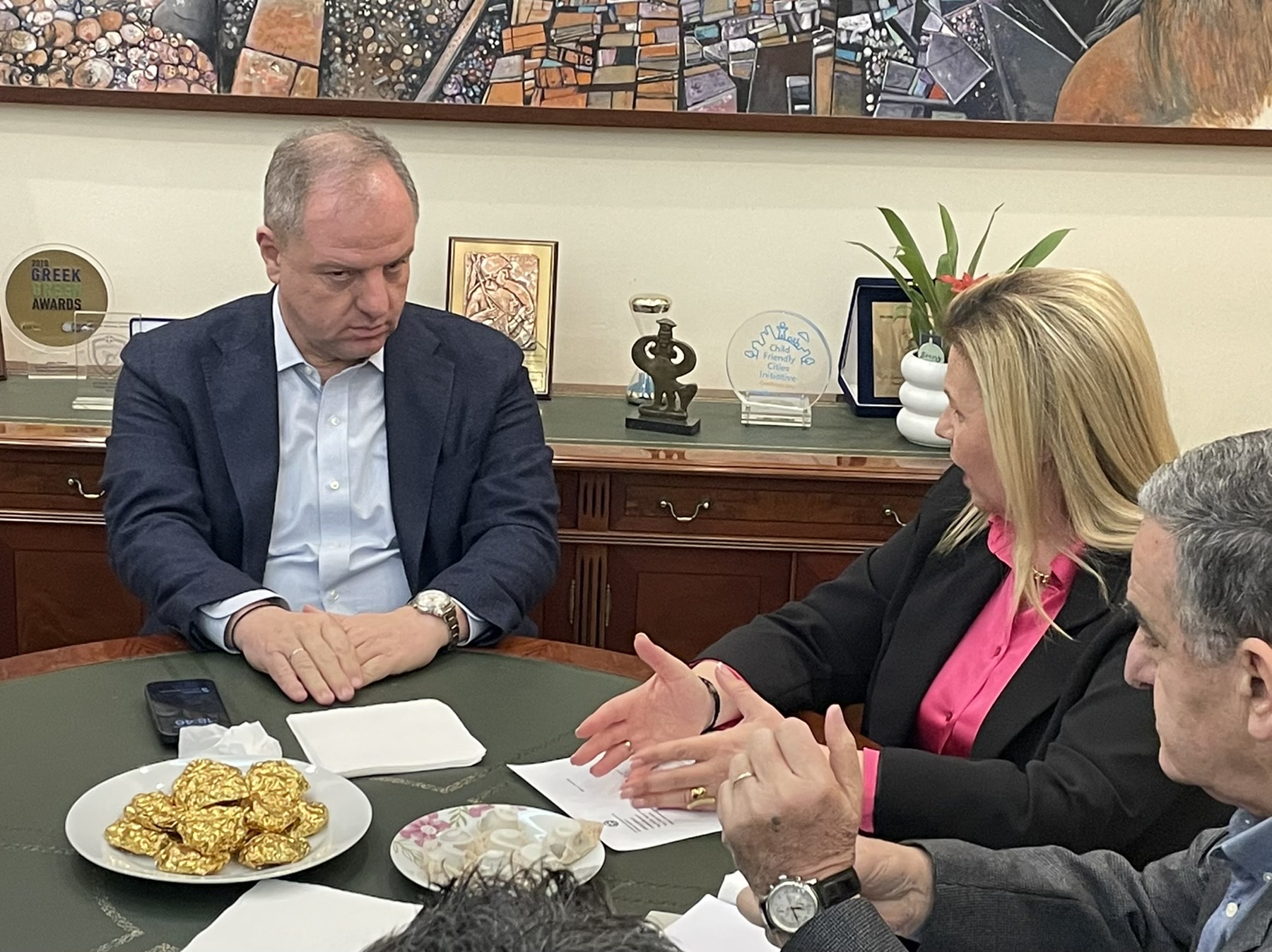 Κατά την έναρξη της συνάντησης, ο Υφυπουργός επεσήμανε την πρόοδο που έχει συντελεστεί ως προς την τουριστική ανάπτυξη του νησιού, το υψηλό επίπεδο των παρεχόμενων υπηρεσιών και την ποιότητα των τοπικών προϊόντων. Από την πλευρά της, η Δήμαρχος τόνισε: «Ως νέα Δημοτική Αρχή, είναι πολλά αυτά τα οποία προσδοκάμε και ως προς την επίλυση προβλημάτων και ως προς την ανάπτυξη του τόπου», προσθέτοντας ότι: «Είμαστε σε πολύ καλά επίπεδα και το τουριστικό προϊόν ανεβαίνει σε συνδυασμό με τον πρωτογενή τομέα. Θέλουμε μια αρμονική, ισόρροπη ανάπτυξη που δεν θα προσβάλλει τον χαρακτήρα του νησιού μας, αλλά ταυτόχρονα θα δώσει άλλη δυναμική».