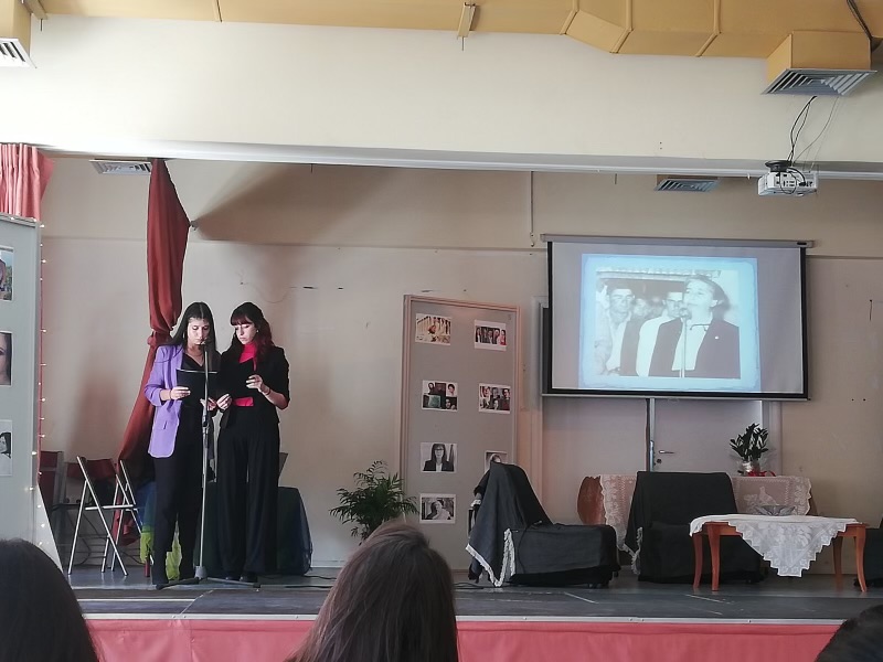 Η εκδήλωση ολοκληρώθηκε με απαγγελία του «Σημείου αναγνωρίσεως» της Κικής Δημουλά από τη μαθήτρια της Β΄Λυκείου, Κωνσταντίνου Κυβέλης και ερμηνεία του τραγουδιού του Φοίβου Δεληβοριά και Πάνου Μουζουράκη «Εκείνη». Στην κιθάρα και στο τραγούδι ο μαθητής της Γ΄Λυκείου, Αγιοστρατίτης Χάρης.