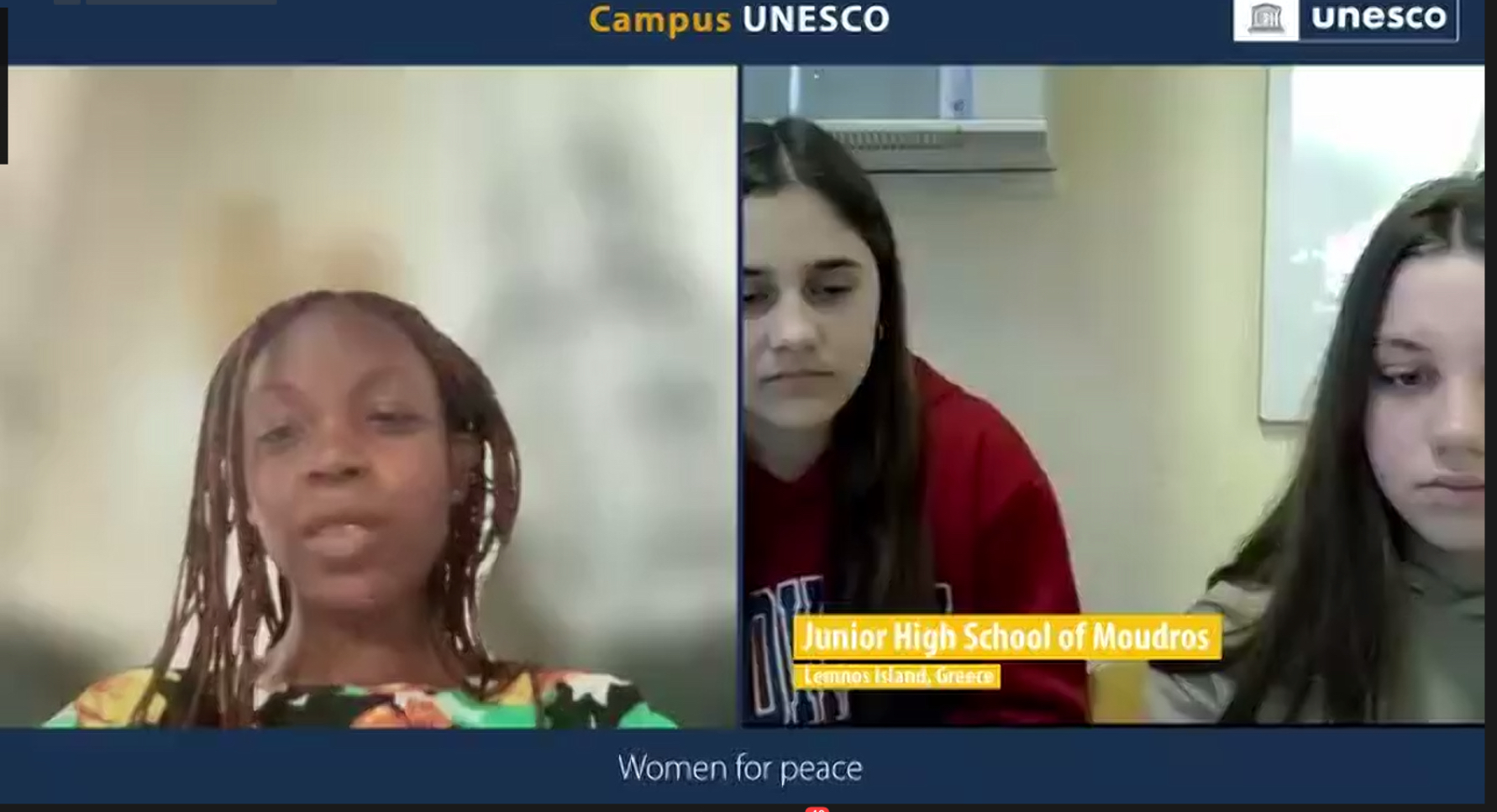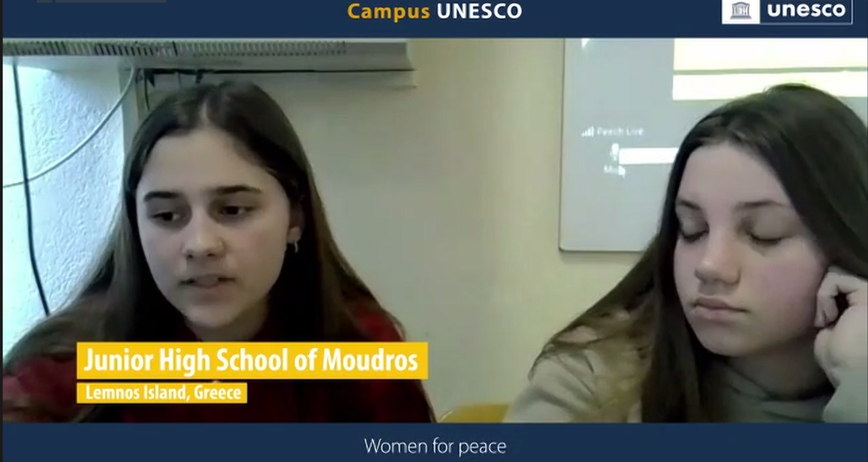 Το Γυμνάσιο Μούδρου “Αργύριος Μοσχίδης” εκπροσώπησε την Ελλάδα και ανάμεσα σε μαθητές και μαθήτριες σχολείων από Ευρώπη και Αφρική (Ιταλία, Μπενίν, Τανζανία, Νιγηρία, Ζάμπια), δύο μαθήτριες της Γ’ τάξης, η Ελεάννα Βαρδαξή και η Βέρα Καλλιπολίτου παρακολούθησαν σε ζωντανή σύνδεση τρεις ομιλίες και διατύπωσαν τους δικούς τους προβληματισμούς στη συζήτηση που ακολούθησε.
