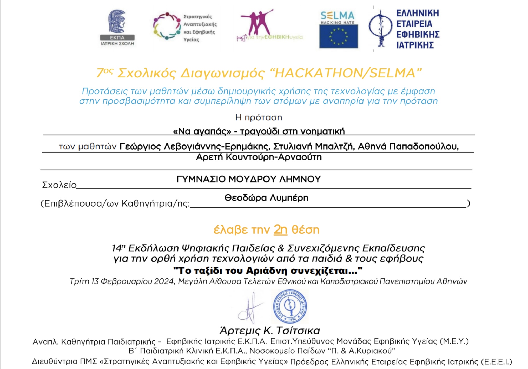 Στο διαγωνισμό συμμετείχαν οι μαθητές/τριες: Γιώργος Λεβογιάννης Ερημάκης, Στέλλα Μπαλτζή, Αθηνά Παπαδοπούλου και Αρετή Κουντούρη-Αρναούτη. Υπεύθυνοι υλοποίησης του διαγωνιστικού βίντεο ήταν οι εκπαιδευτικοί: Αβραάμ Ελένη, φιλόλογος Ειδικής Αγωγής, Δημήτριος Φωκάς, μαθηματικός και Γιάννης Μεταξάς, μαθηματικός Ειδικής Αγωγής.
