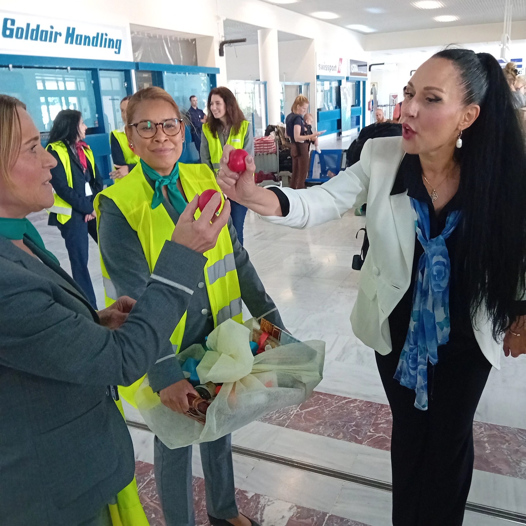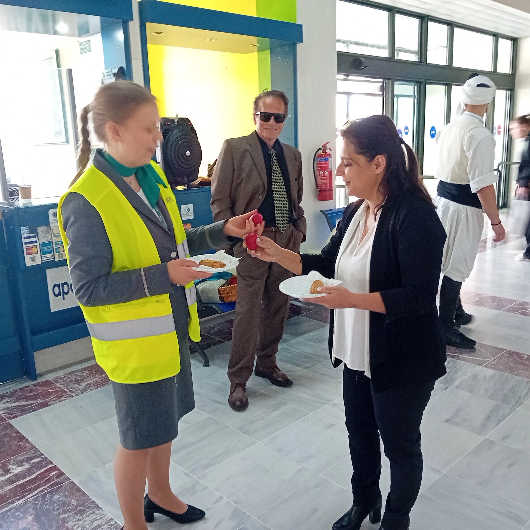 Η Προέδρος της ΑΜΚΕ, Αδαμαντία Γαροφαλλίδου και η Αντιπρόεδρος Σεβαστιάνα Σταματέρη, βρέθηκαν στο αεροδρόμιο, υποδέχτηκαν τους επιβάτες της πτήσης, τους δώρισαν από μια φιάλη λημνιό κρασί, προσφορά της «Ένωσης», του Κτήματος Χατζηγεωργίου και του Μ. Γκαράλη, και τσούγκρισαν μαζί τους κόκκινα αυγά ένεκα της ημέρας.
