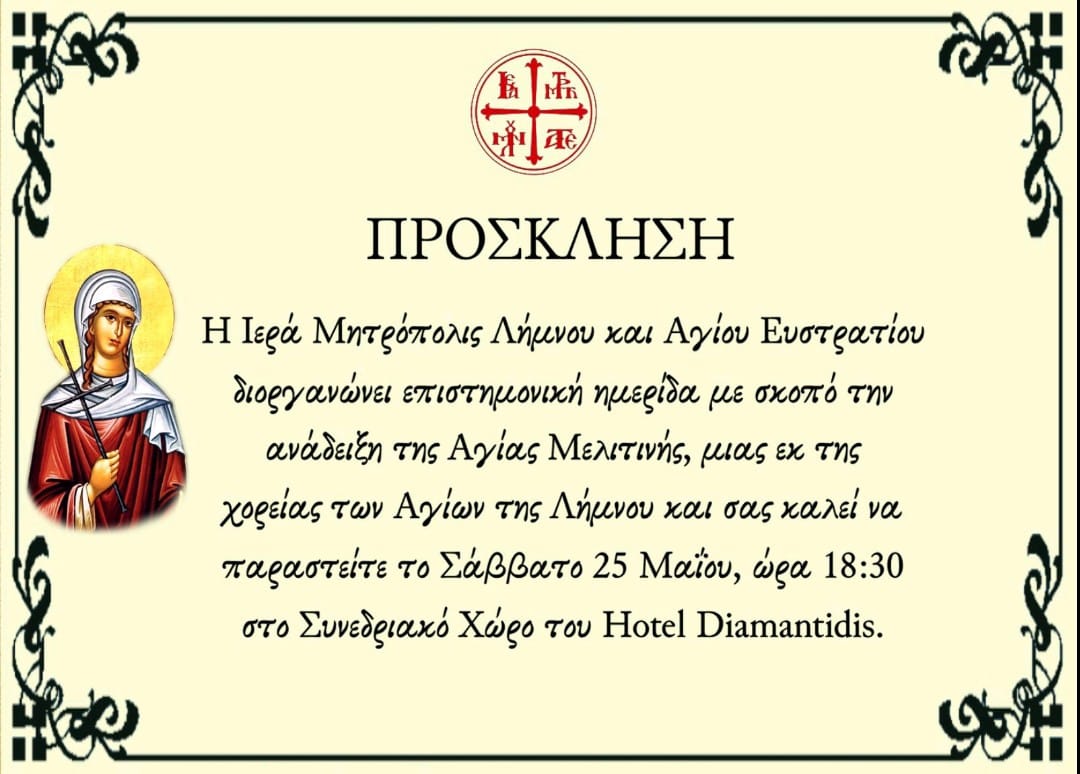 Επιστημονική ημερίδα διοργανώνει η Ιερά Μητρόπολη Λήμνου και Αγίου Ευστρατίου, με σκοπό την ανάδειξη της Αγίας Μελιτινής,