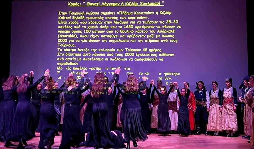 Η αναπαράσταση της πορείας των αδελφών μας Ποντίων στο δρόμο για την ξενιτιά μετά την Γενοκτονία, ο σεβασμός και η αρτιότητα στη χορευτική προσέγγιση των χορών του Πόντου, το τραγούδι της Αντιγόνης Στραντή που συνόδευε το μοιρολόι της Δέσποινας Βασιλειάδου στην Ποντιακή διάλεκτο υπό τους ήχους της λύρας του Δημήτρη Κελλίδη, η παρουσίαση των χορών της Λήμνου, με την παλιά και νέα γενιά να ενώνονται στον κύκλο του χορού και να παρουσιάζουν την τοπική χορευτική μας παράδοση με ζωντάνια όπως ακριβώς της αξίζει , η λεβεντιά των αντρών και η χάρη των γυναικών στην παρουσίαση των χορών της Κρήτης, αλλά κυρίως η κατάθεση ψυχής και το ταλέντο των μικρών παιδιών και των εφήβων που συμμετείχαν στην παράσταση, καταχειροκροτήθηκαν ασταμάτητα από το κατενθουσιασμένο κοινό.