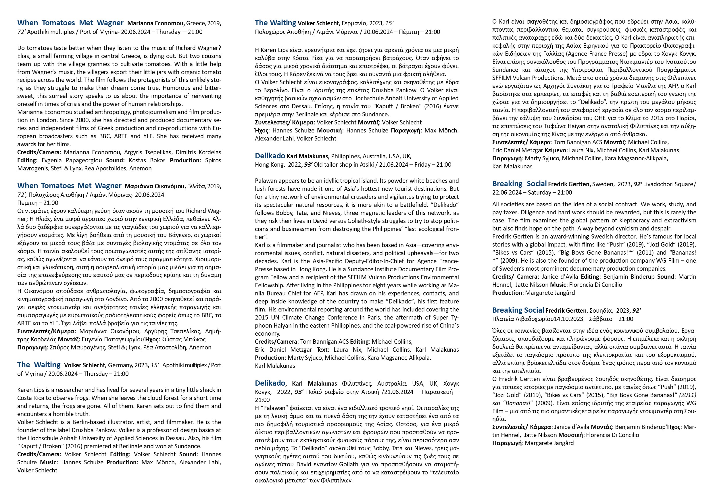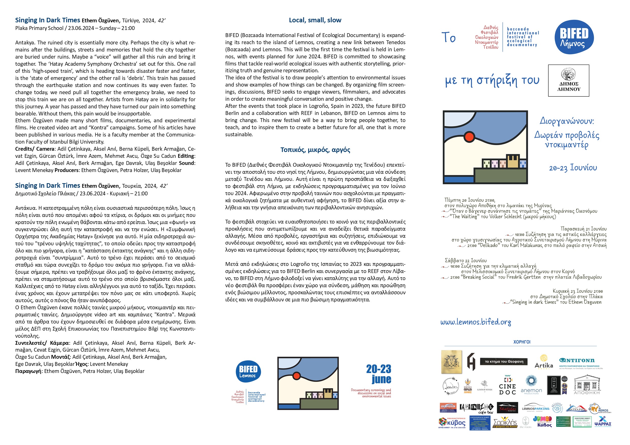 Στη Λήμνο θα προβληθούν συνολικά 6 βραβευμένα ντοκιμαντέρ με ελληνικούς υπότιτλους, οικολογικού και κοινωνικού περιεχομένου, από τις 20 μέχρι και τις 23 Ιουνίου 2024 και θα πραγματοποιηθούν δύο εργαστήρια –συζητήσεις σύμφωνα με το παρακάτω πρόγραμμα: