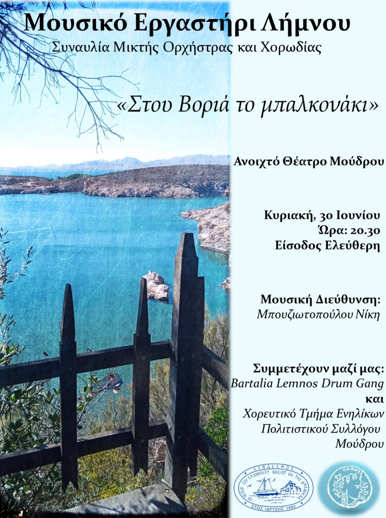 Την Κυριακή 30 Ιουνίου, στο Ανοιχτό Θέατρο Μούδρου και ώρα 20.30, η Μικτή Ορχήστρα του Εργαστηρίου, αποτελούμενη από τους μαθητές και η Χορωδία Ενηλικών, θα τραγουδήσουν αγαπημένα παραδοσιακά κομμάτια από όλη την Ελλάδα.
