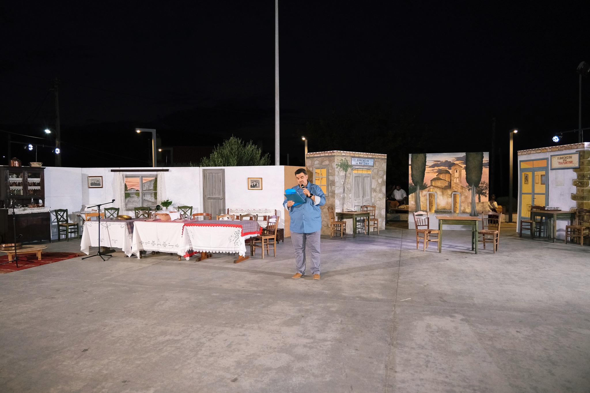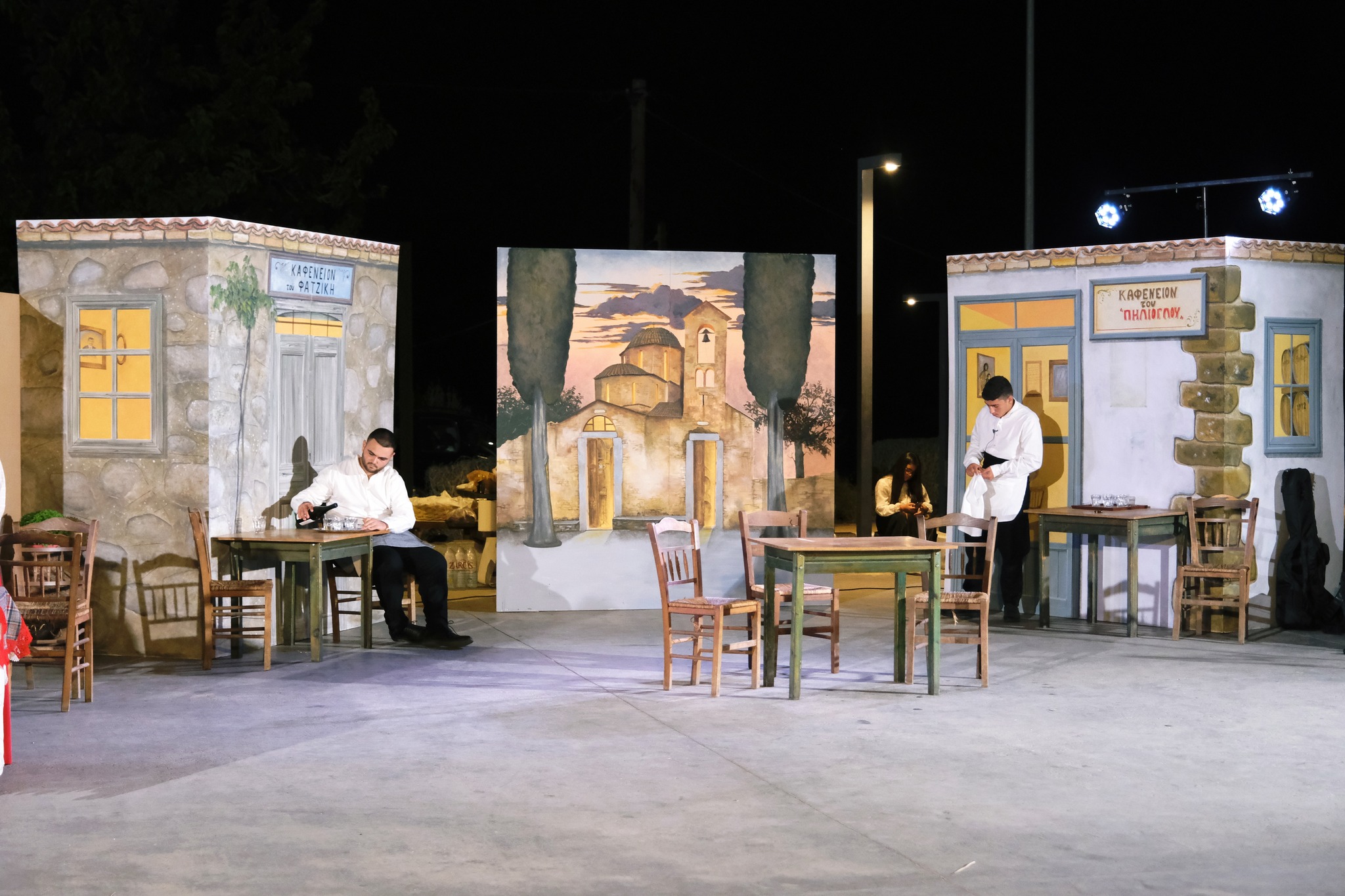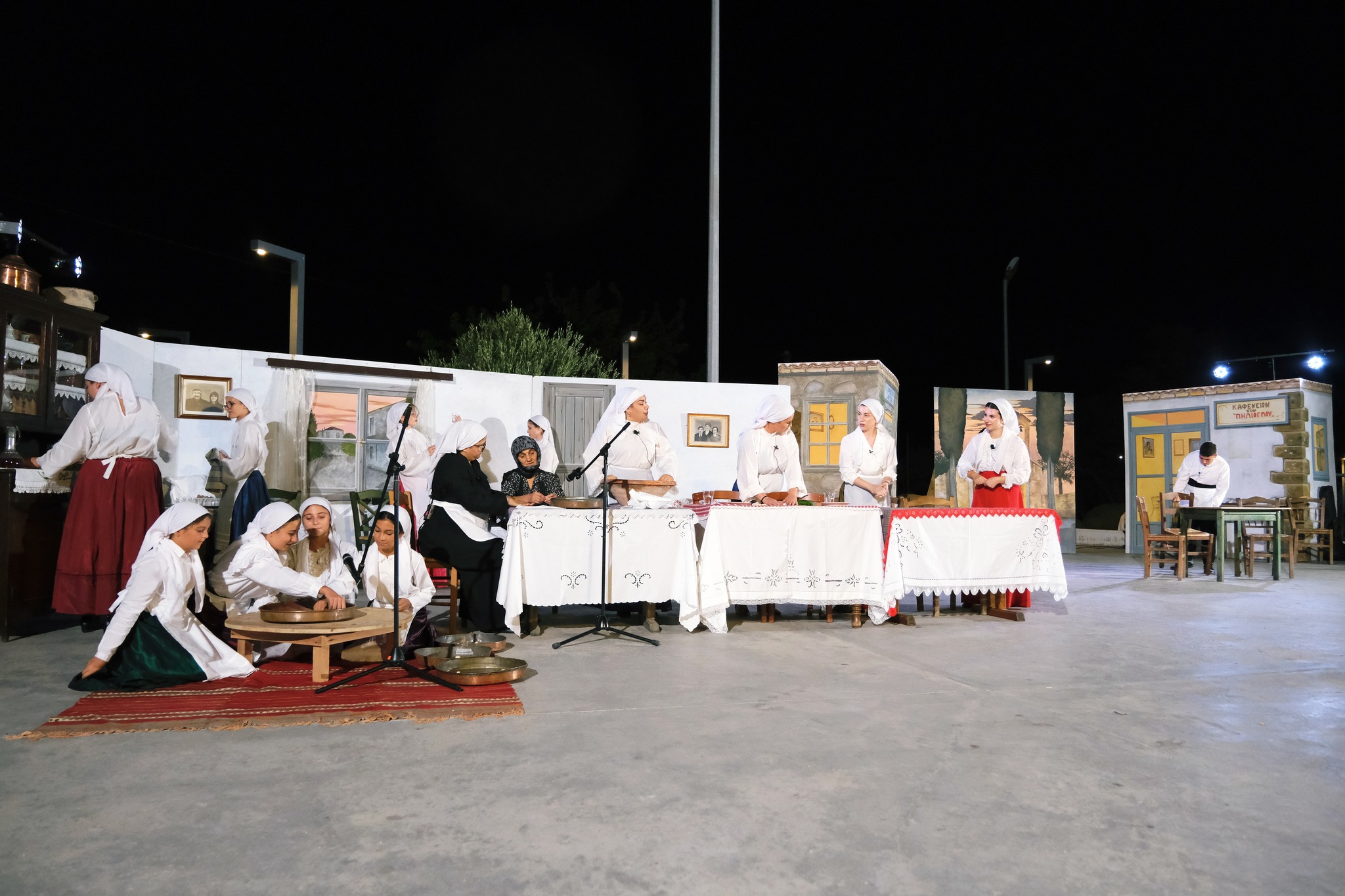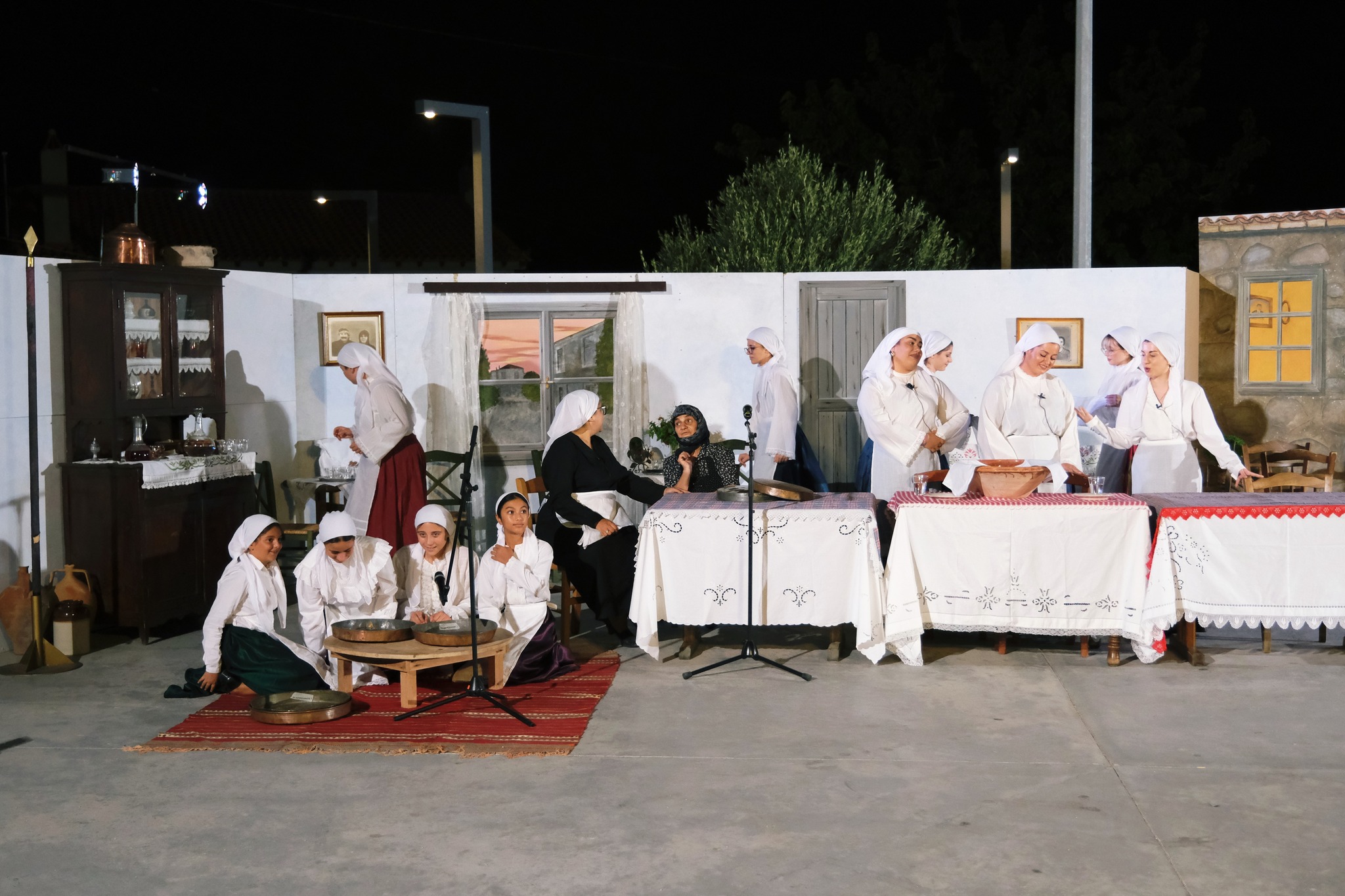 Εκεί όπου ο ΜΕΣ «Άγιος Δημήτριος» κατάφερε να «χτίσει» μια ολόκληρη γειτονιά χάρη στο ζωγράφο Κώστα Παντελιδάκη και τη βοήθεια του ξυλουργού Νίκου Μαρκάκη. Δεκάδες παλιά αντικείμενα, εργόχειρα, σκεύη, διακόσμησαν το σκηνικό με τη βοήθεια του Δημήτρη Γκαράλη, του Γιάννη Καλογιάννη και του Γιάννη Σπανού. Η Μαρία Φαντζίκη προσέφερε τον εξοπλισμό του καφενείου του Αντώνη και της Σοφίας Φαντζίκη. Η Μοδίστρα Ευγενία Ταρασίδου επιμελήθηκε την ενδυμασία όσων συμμετείχαν και η Ραφαέλα Πατρώνια τα χτενίσματα και το μακιγιάζ.
