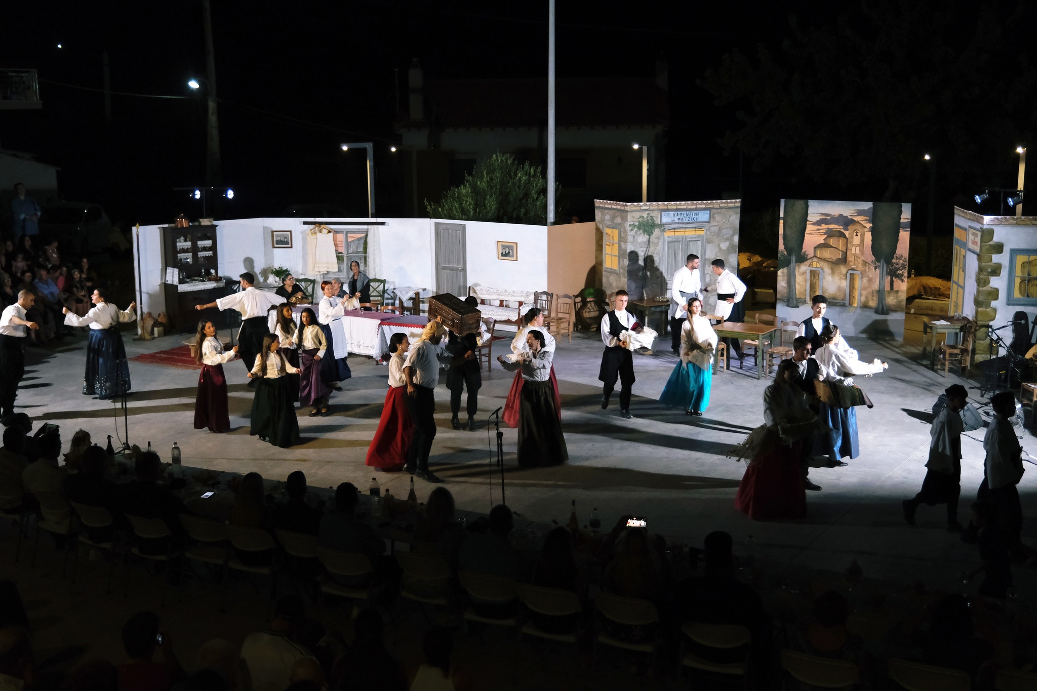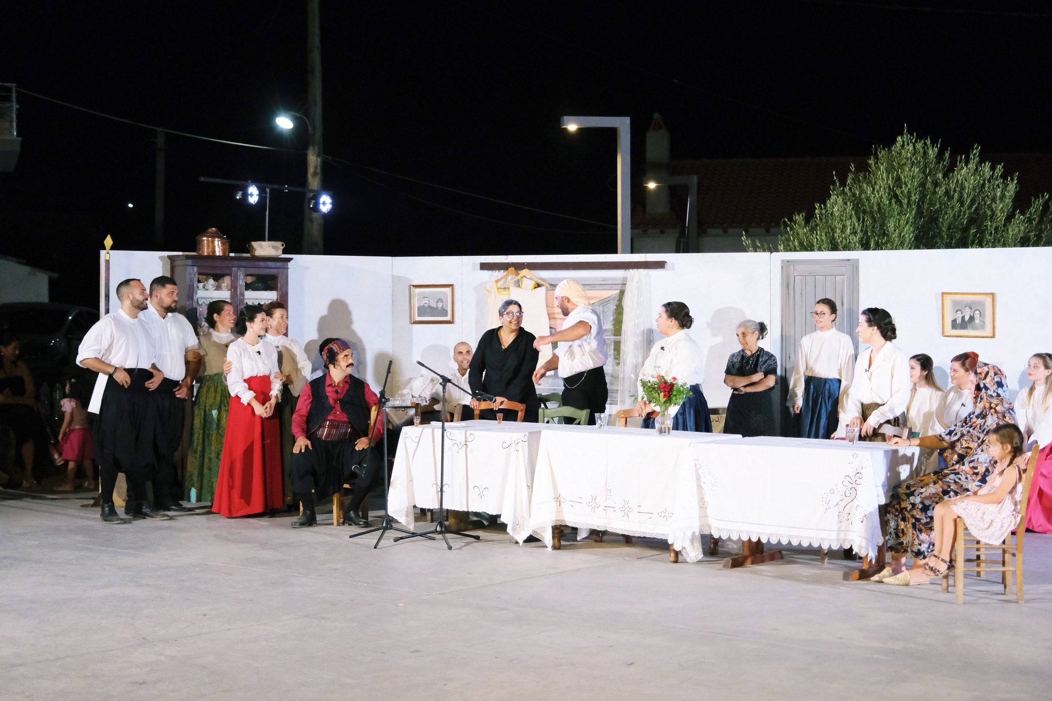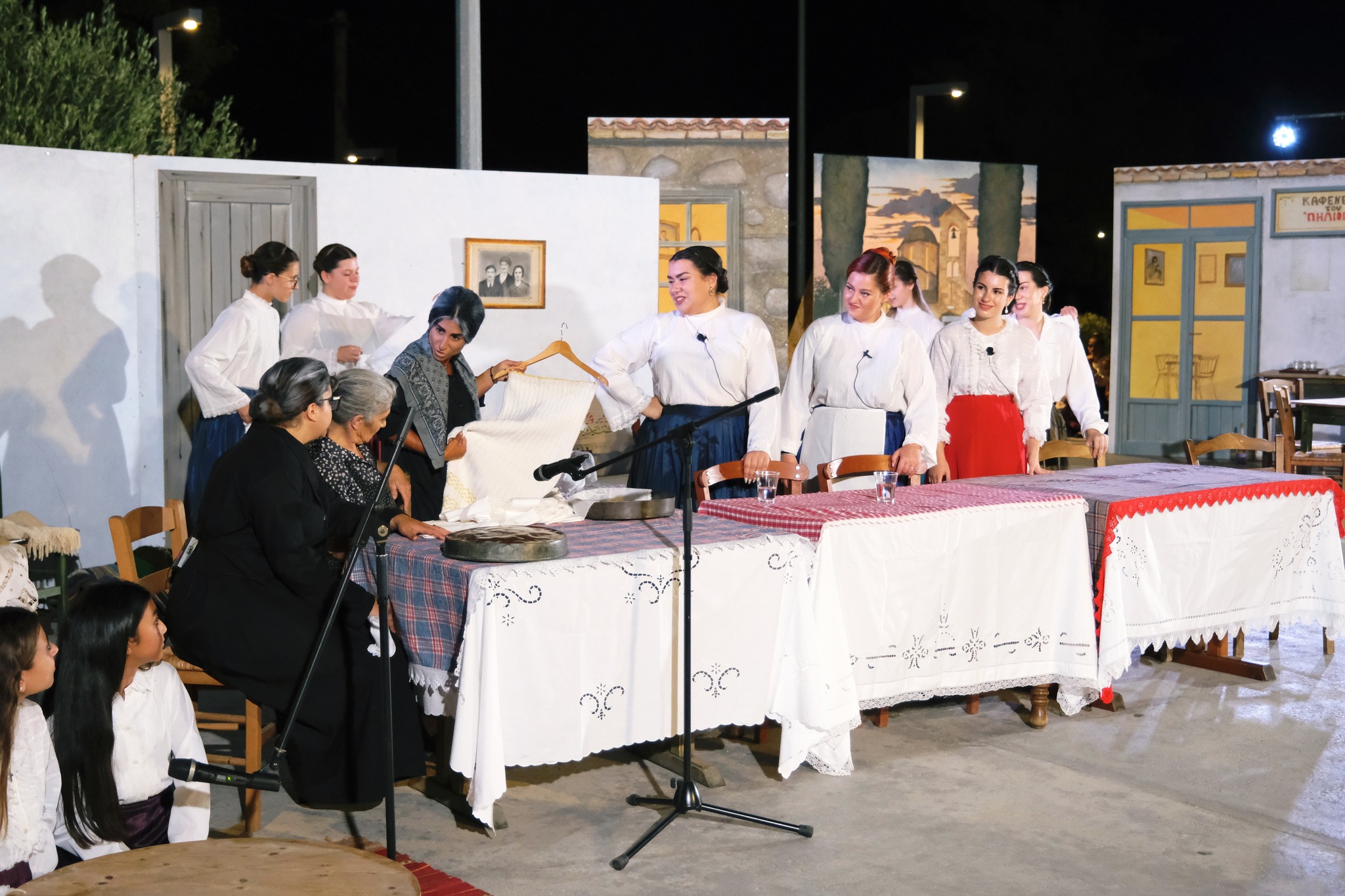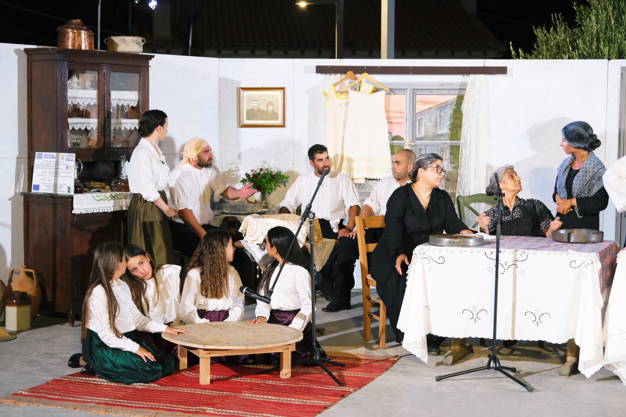 Εκεί όπου ο ΜΕΣ «Άγιος Δημήτριος» κατάφερε να «χτίσει» μια ολόκληρη γειτονιά χάρη στο ζωγράφο Κώστα Παντελιδάκη και τη βοήθεια του ξυλουργού Νίκου Μαρκάκη. Δεκάδες παλιά αντικείμενα, εργόχειρα, σκεύη, διακόσμησαν το σκηνικό με τη βοήθεια του Δημήτρη Γκαράλη, του Γιάννη Καλογιάννη και του Γιάννη Σπανού. Η Μαρία Φαντζίκη προσέφερε τον εξοπλισμό του καφενείου του Αντώνη και της Σοφίας Φαντζίκη. Η Μοδίστρα Ευγενία Ταρασίδου επιμελήθηκε την ενδυμασία όσων συμμετείχαν και η Ραφαέλα Πατρώνια τα χτενίσματα και το μακιγιάζ.