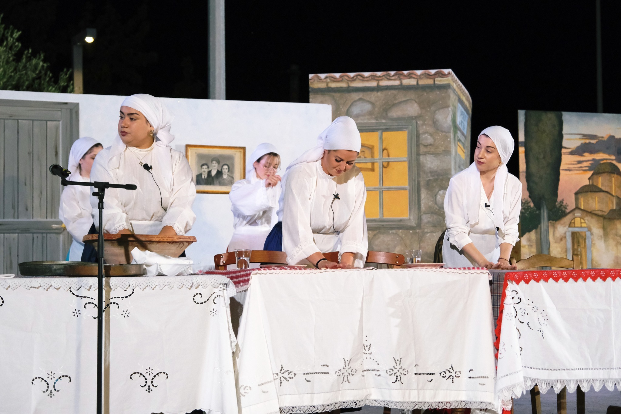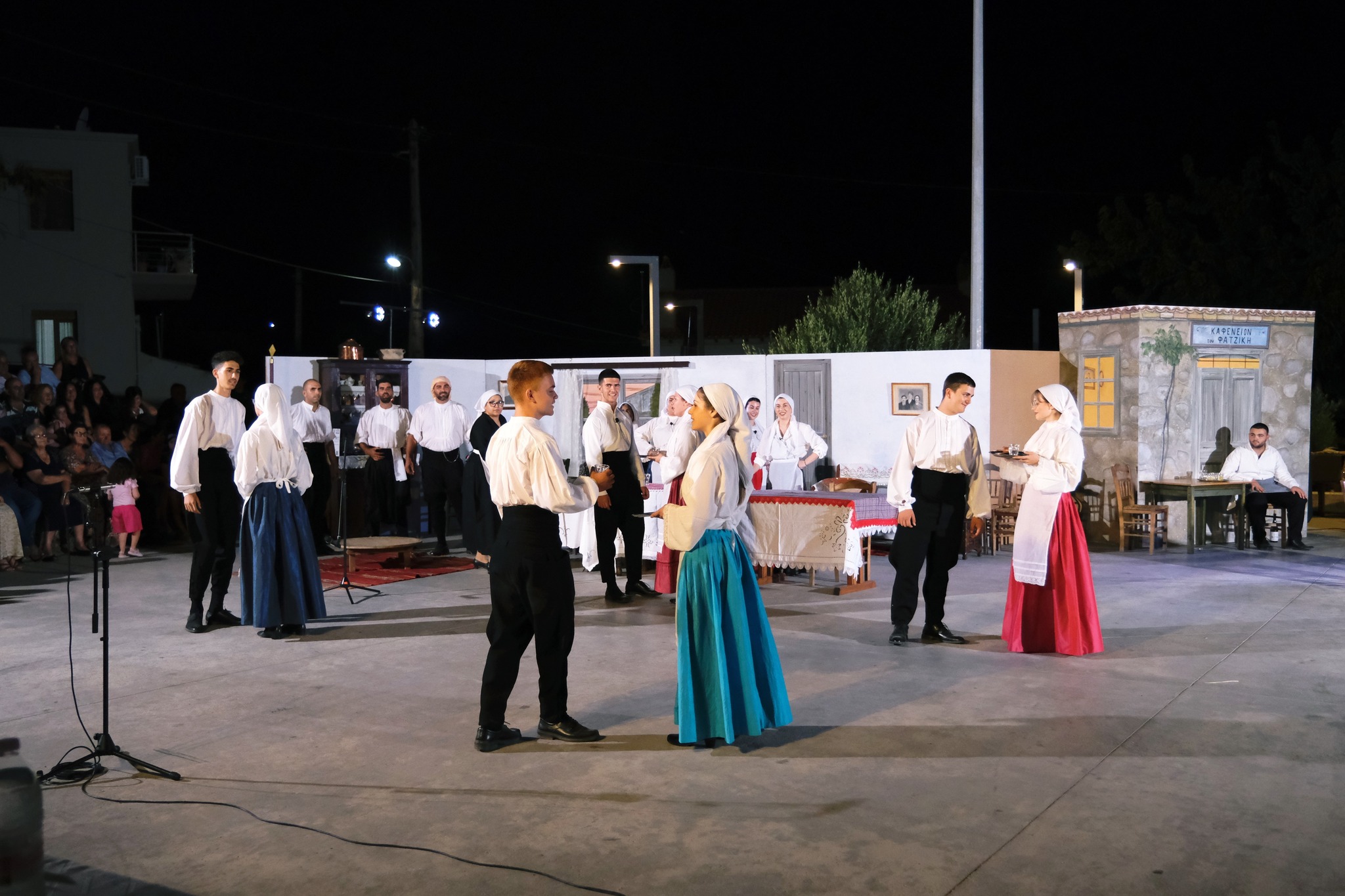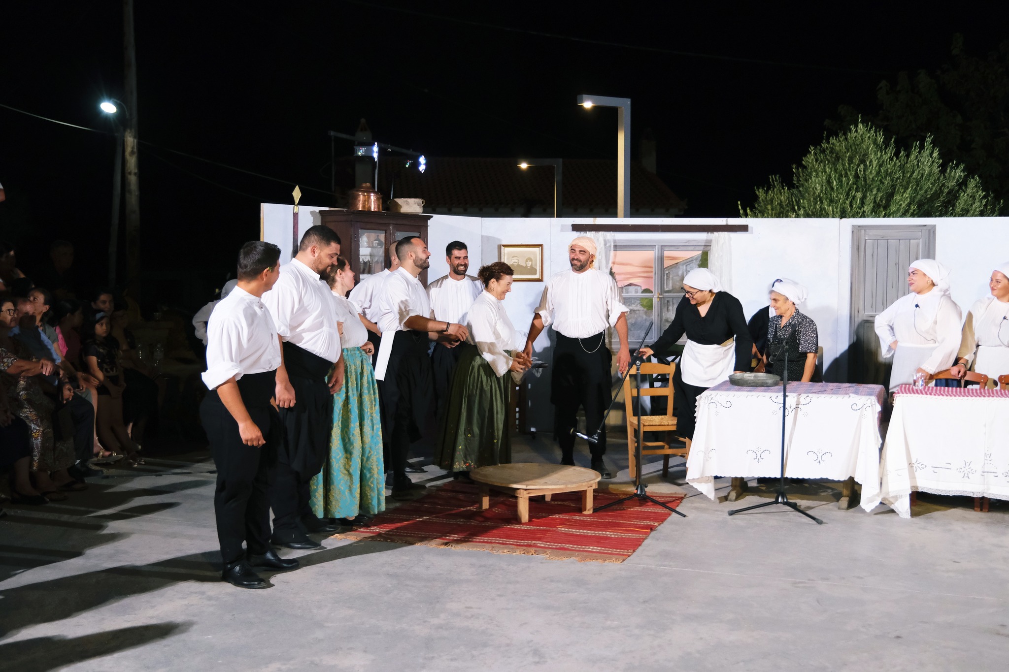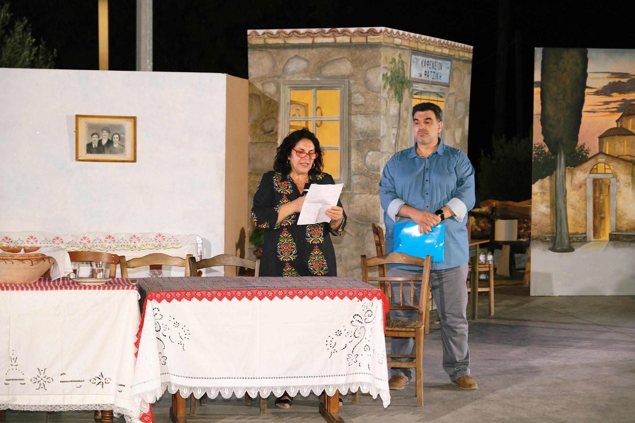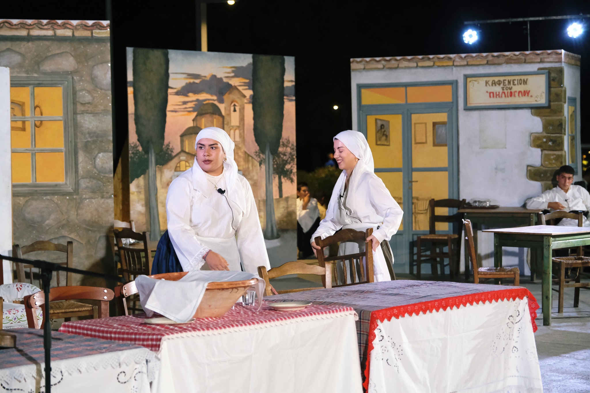 Εκεί όπου ο ΜΕΣ «Άγιος Δημήτριος» κατάφερε να «χτίσει» μια ολόκληρη γειτονιά χάρη στο ζωγράφο Κώστα Παντελιδάκη και τη βοήθεια του ξυλουργού Νίκου Μαρκάκη. Δεκάδες παλιά αντικείμενα, εργόχειρα, σκεύη, διακόσμησαν το σκηνικό με τη βοήθεια του Δημήτρη Γκαράλη, του Γιάννη Καλογιάννη και του Γιάννη Σπανού. Η Μαρία Φαντζίκη προσέφερε τον εξοπλισμό του καφενείου του Αντώνη και της Σοφίας Φαντζίκη. Η Μοδίστρα Ευγενία Ταρασίδου επιμελήθηκε την ενδυμασία όσων συμμετείχαν και η Ραφαέλα Πατρώνια τα χτενίσματα και το μακιγιάζ.