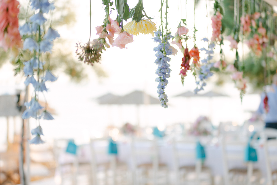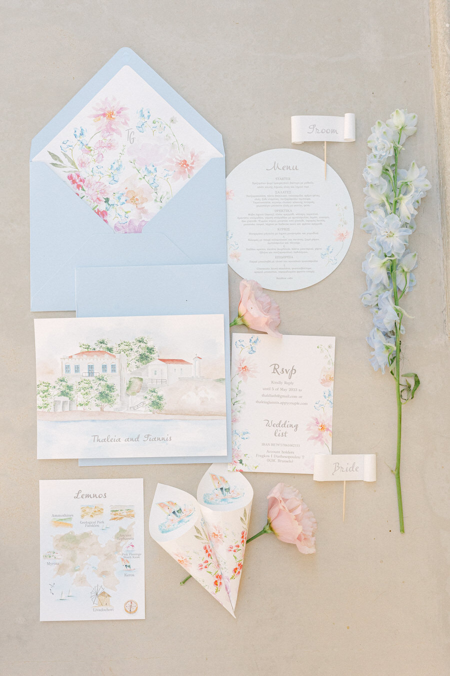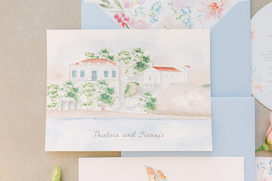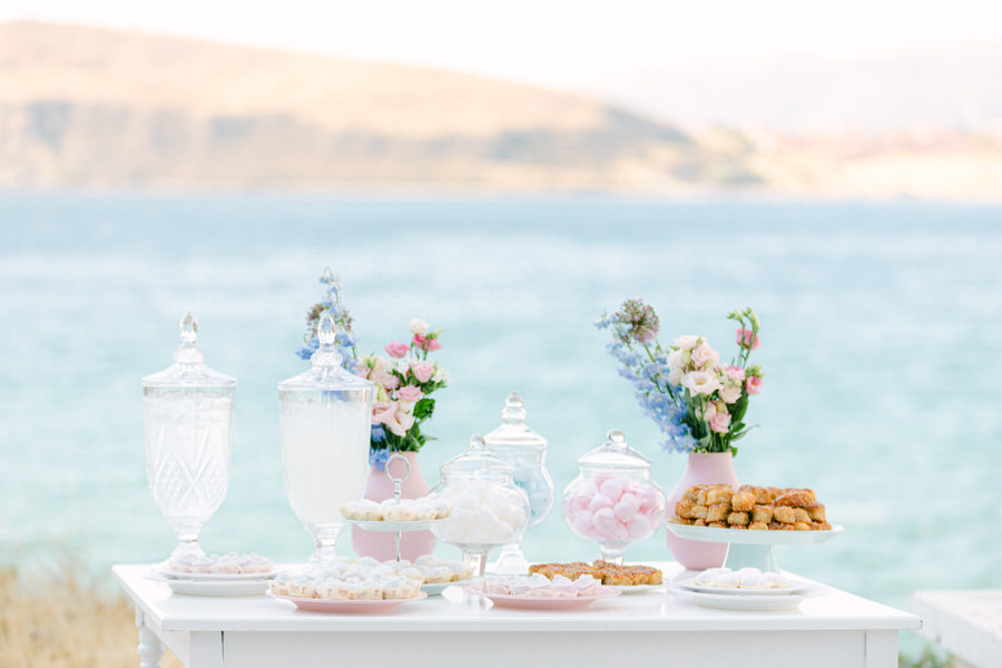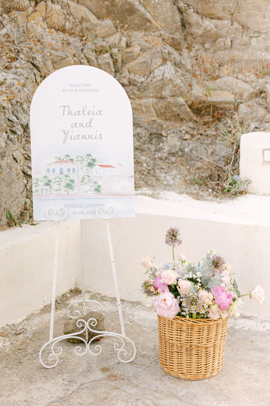 Η Θάλεια και ο Γιάννης ήθελαν ο γάμος τους να αντανακλά τη φυσική ομορφιά της Λήμνου, γι' αυτό επέλεξαν ένα μινιμαλιστικό αλλά κομψό θέμα. Η χρωματική παλέτα περιελάμβανε απαλά λευκά, γλυκά απαλά μπλε, ήπια πράσινα και πινελιές ροζ, συμπληρώνοντας τέλεια τους ευγενικούς ναυτικούς τόνους του νησιού. Η ανθοδέσμη της νύφης ήταν ένα ντελικάτο μείγμα από αγριολούλουδα και πράσινα κλαδιά, προσθέτοντας μια πινελιά τοπικής γεύσης στη γιορτή.