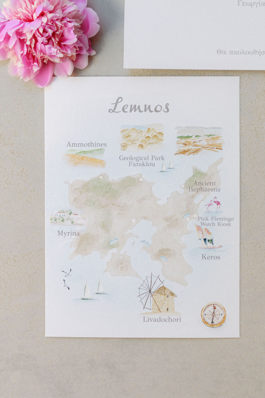 Όλα, ήταν εμπνευσμένα από τη Λήμνο. Το προσκλητήριο είχε ζωγραφισμένο πάνω του το Βόντελα και το εκκλησάκι της Αγίας Παρασκευής. Μαζί με το προσκλητήριο, μοιράστηκε κι ένας χάρτης παρόμοιος με εκείνους των πειρατών, με όλα τα σημαντικά κι αξιοσημείωτα σημεία του νησιού τοποθετημένα πάνω του.
