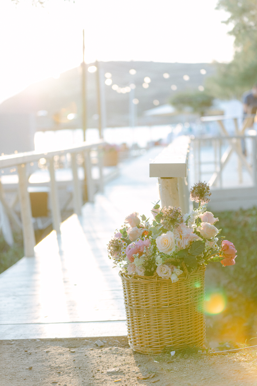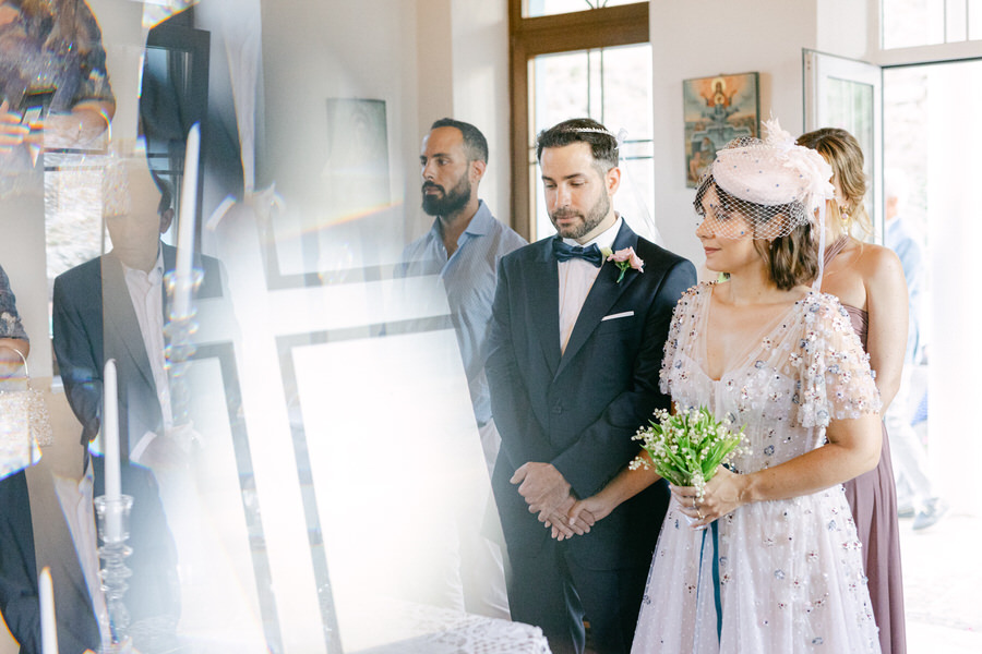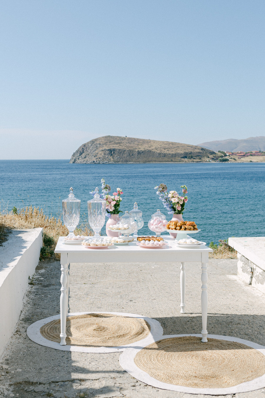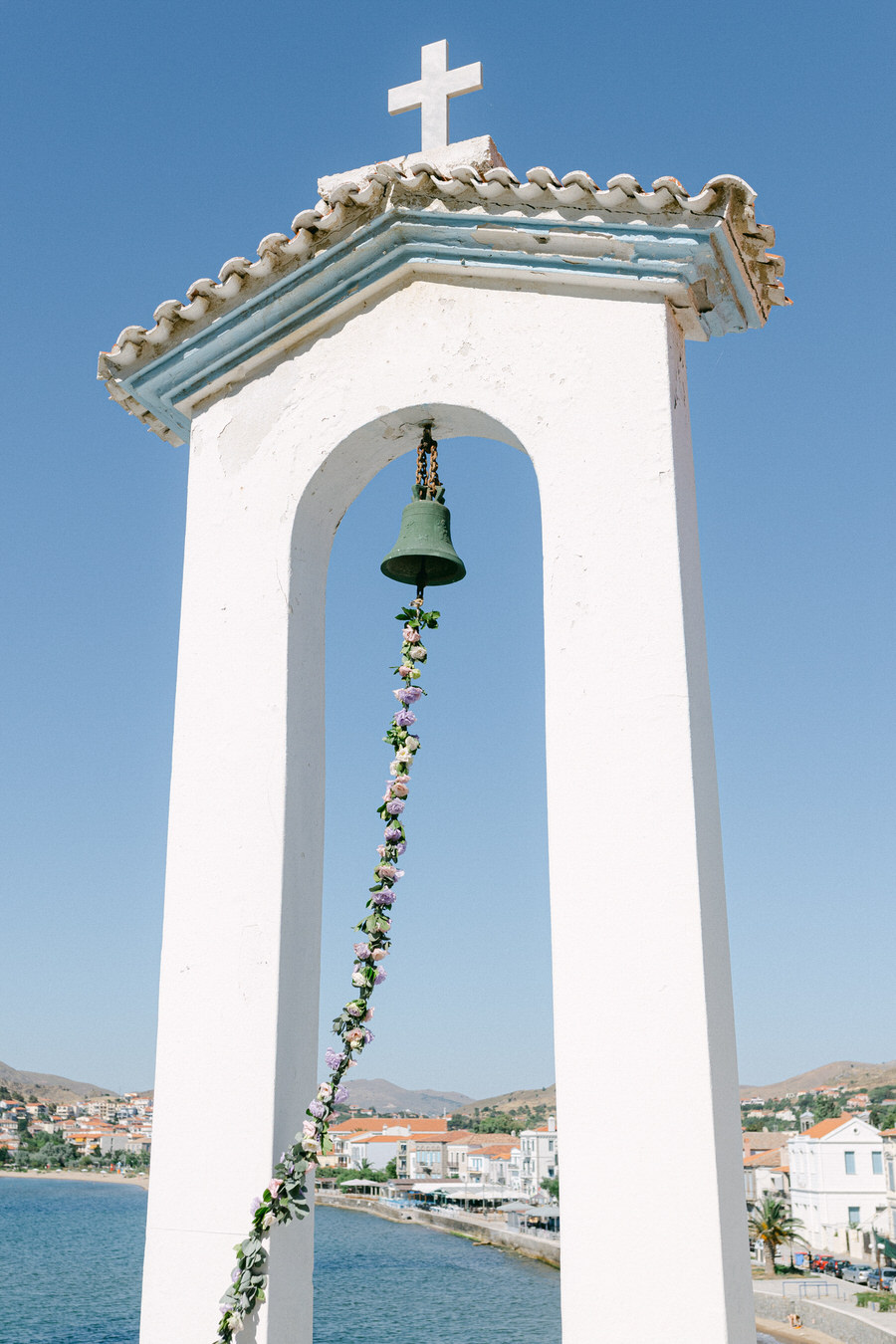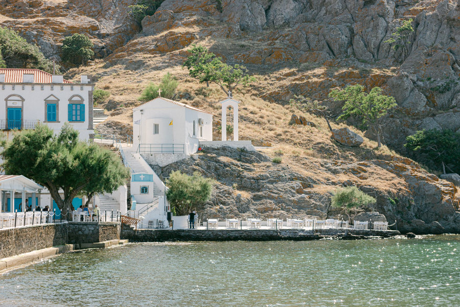 Το νησί της Λήμνου είναι ένα μέρος όπου ο χρόνος μοιάζει να σταματάει. Το ζευγάρι επέλεξε να φιλοξενήσει το γάμο του στη γραφική Αγία Παρασκευή Βόντελα, στη Μύρινα. Πρόκειται για ένα γαλήνιο μέρος γνωστό για την παραδοσιακή αρχιτεκτονική του και την εκπληκτική θέα στο Αιγαίο. Η τελετή έλαβε χώρα σε μια τοποθεσία που προσφέρει πανοραμική θέα στη θάλασσα.