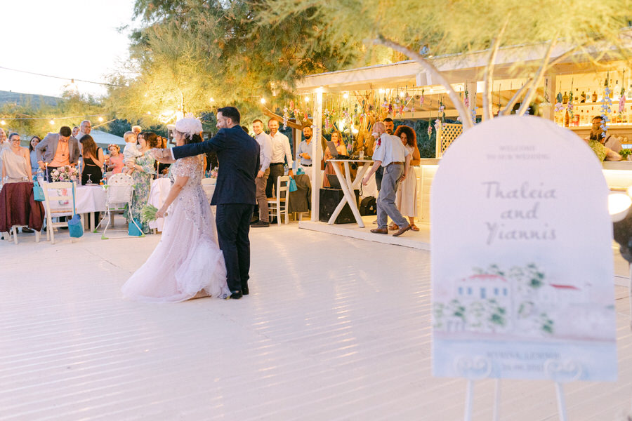 Η δεξίωση έγινε σε έναν γοητευτικό παραθαλάσσιο χώρο, το Manos Beach Bar, στο Richa Nera. Οι καλεσμένοι δείπνησαν κάτω από τα αστέρια, με τον απαλό ήχο των κυμάτων να αποτελεί το τέλειο soundtrack της βραδιάς. Τα τραπέζια ήταν στολισμένα με απλά αλλά όμορφα κεντρικά κομμάτια από τοπικά λουλούδια, προσθέτοντας μια μυρωδάτη νότα στον αέρα. Το μενού περιελάμβανε τις καλύτερες γαστρονομικές προτάσεις της Λήμνου, από φρέσκα θαλασσινά μέχρι τοπικά κρασιά.