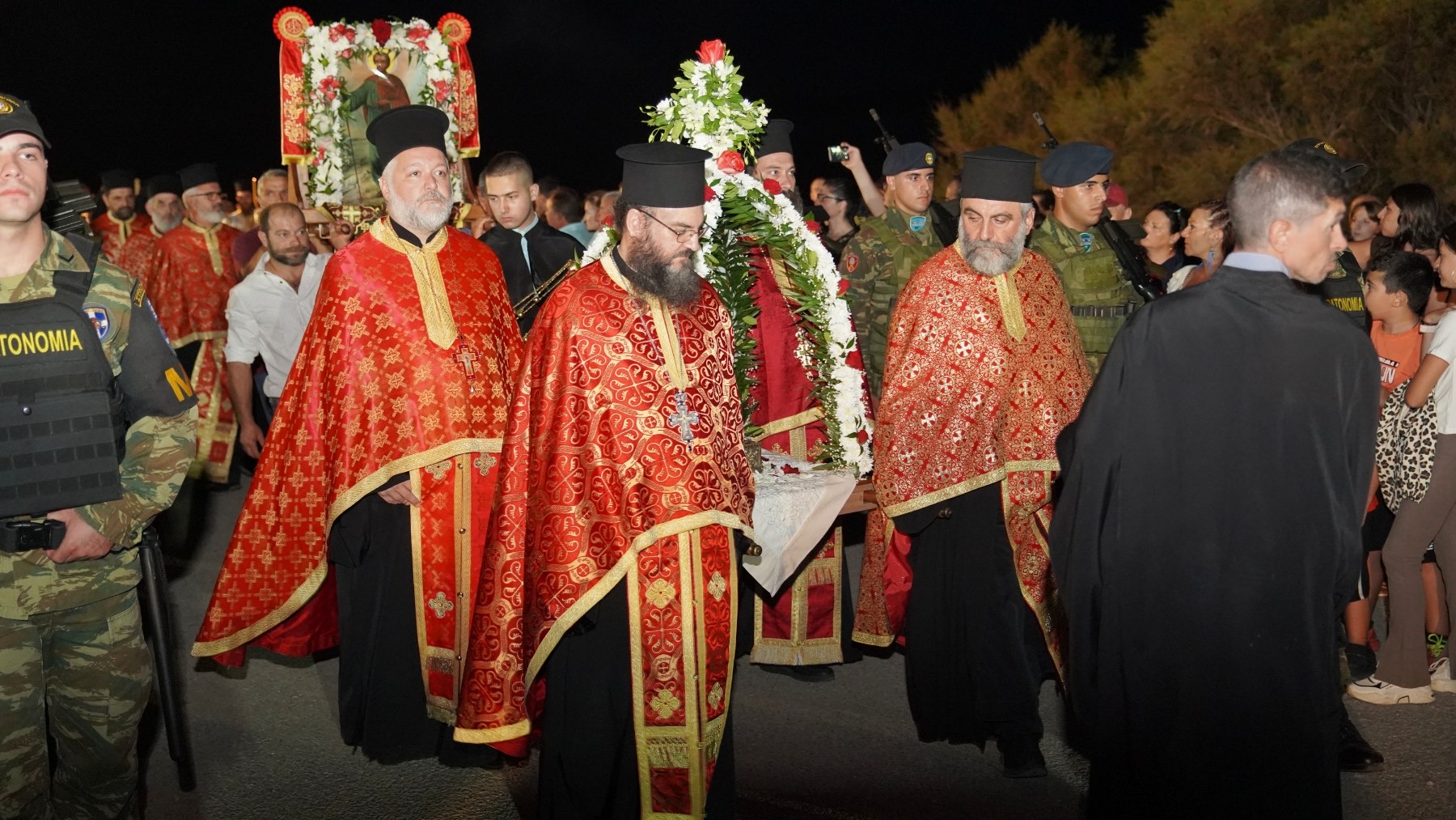 Προ του πέρατος της ακολουθίας του Εσπερινού πραγματοποιήθηκε μικρή λιτανεία της θαυματουργού Ιεράς Εικόνος και του χαριτοβρύτου Ιερού Λειψάνου του Αγίου Σώζοντος, με τη συνοδεία τιμητικού αγήματος και της φιλαρμονικής του στρατού.