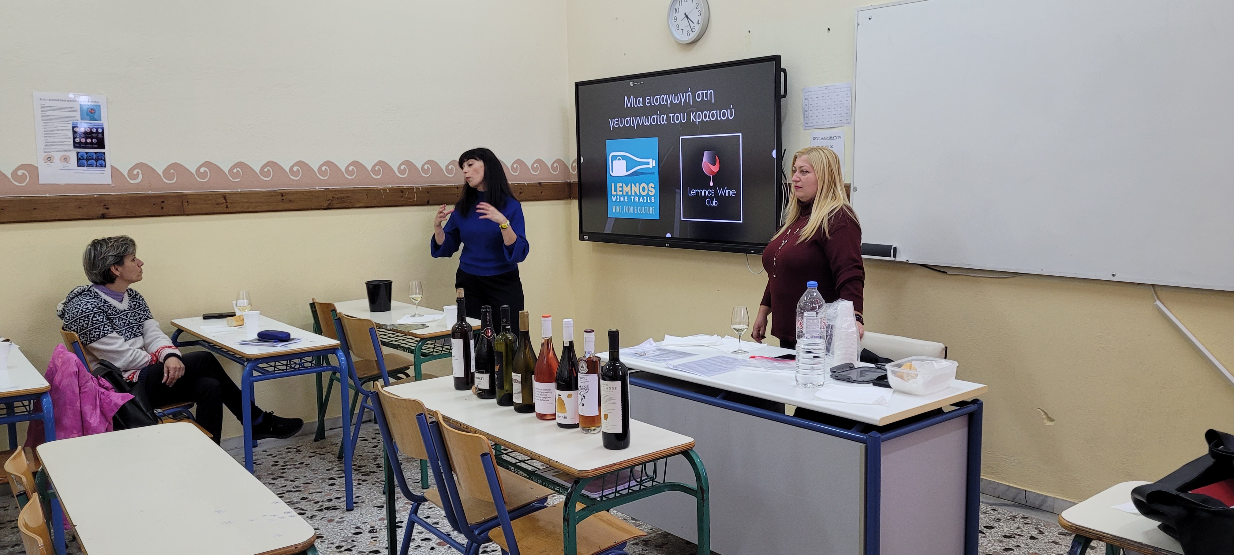 Εκπροσωπώντας το Limnos Wine Trails και το Limnos Wine Club, η κα Κωνσταντάρα παρουσίασε μια ποικιλία λημνιών οίνων, εξηγώντας τις τεχνικές αξιολόγησής τους. Στη δοκιμή περιλήφθηκαν οκτώ τοπικά κρασιά, καθώς και ένα συλλεκτικό Ξινόμαυρο του 2018 από το Κτήμα Κυρ-Γιάννη, όλα ευγενική χορηγία του Χ. Παλαιολογούδια και του καταστήματος «Η Λήμνος μας».
