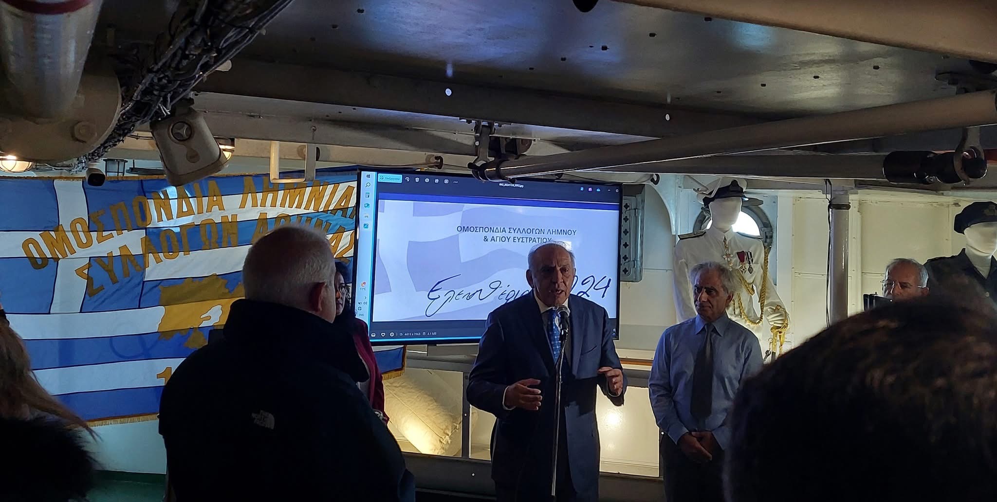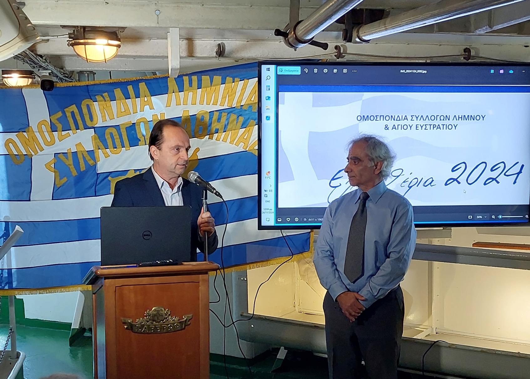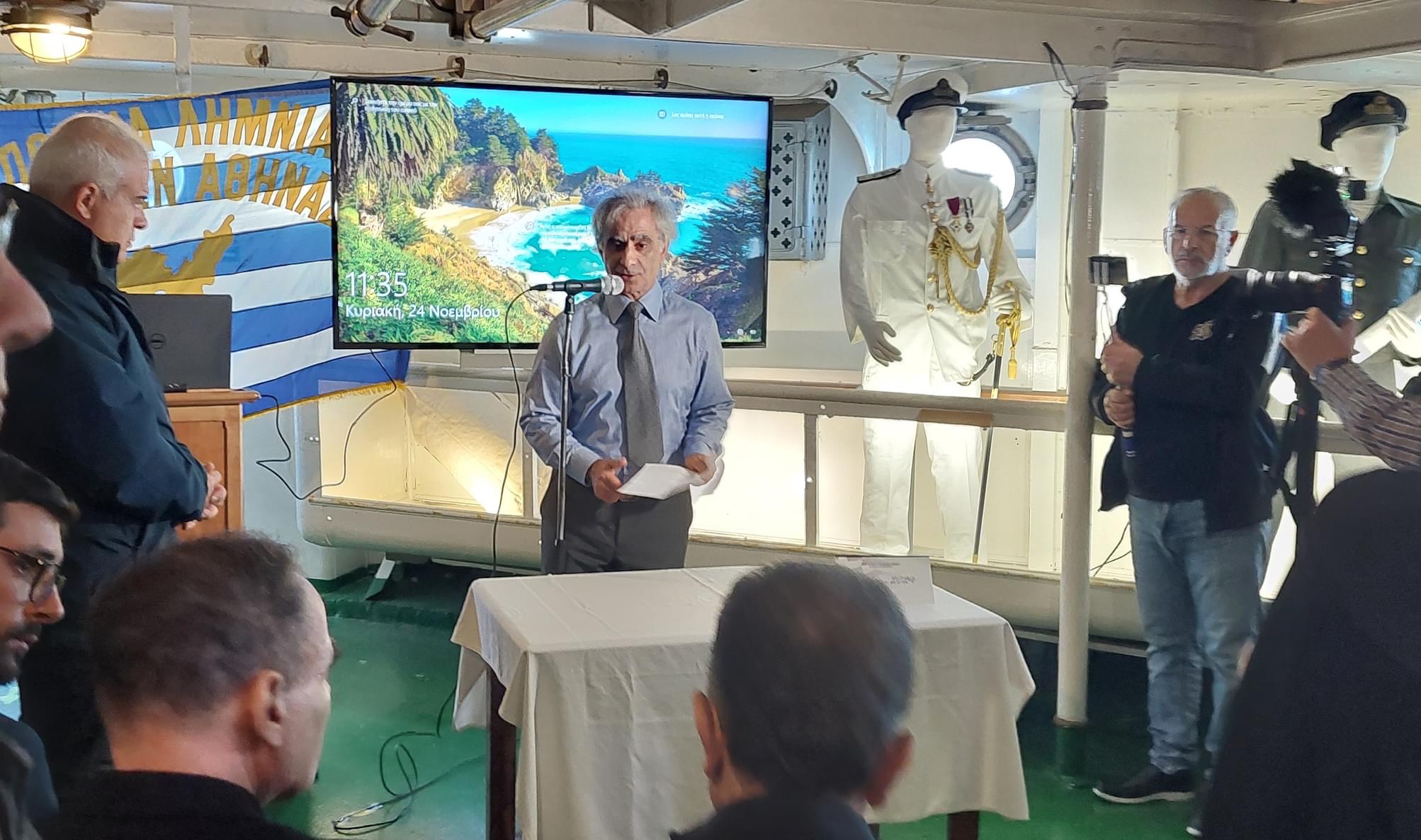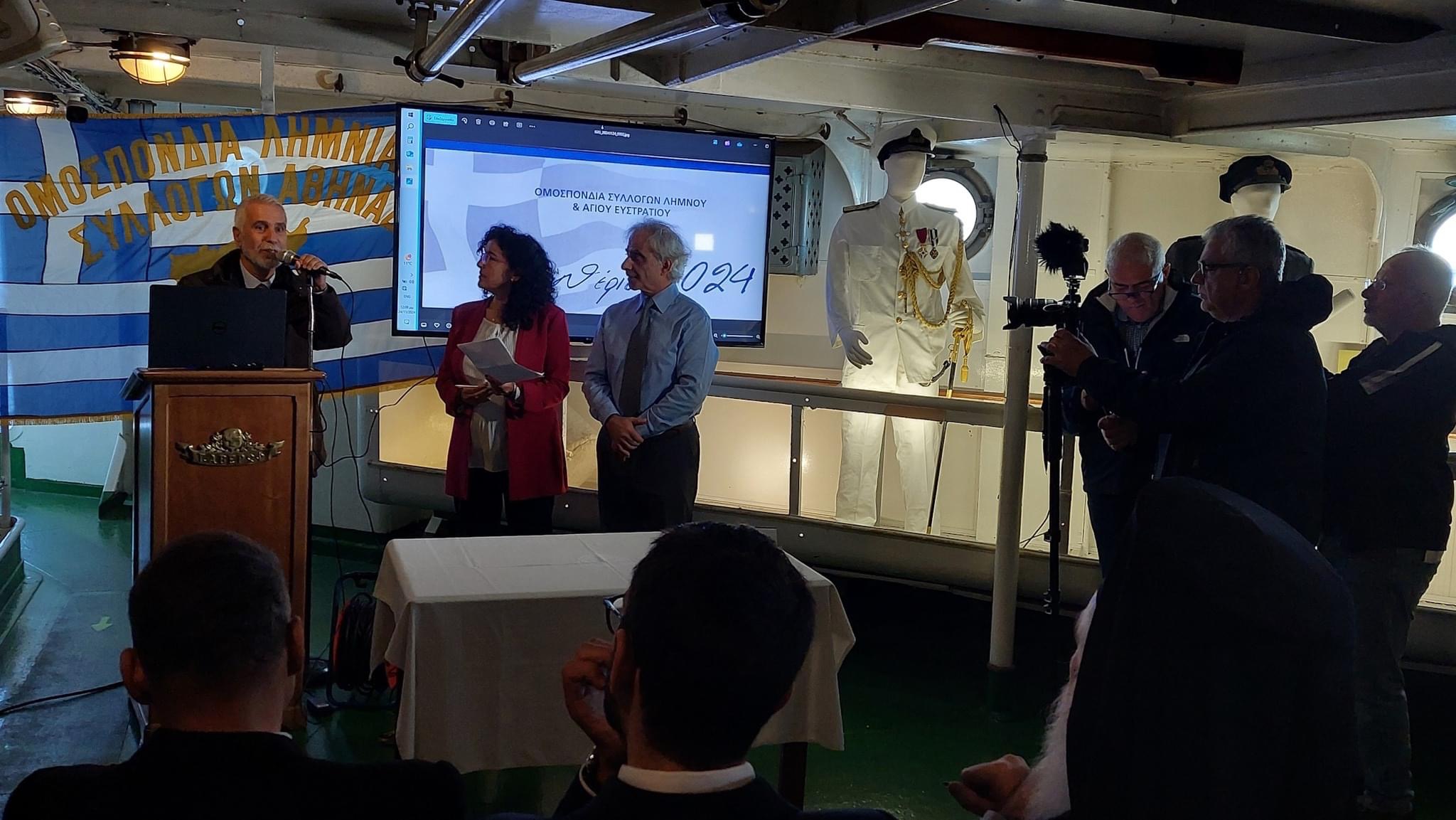Ο Πρόεδρος της ΟΛΣΥ,κ. Αντώνιος Καραγιάννης, στην ομιλία του έβαλε διεκδικητικό πλαίσιο και αναφέρθηκε στον ακτοπλοϊκό αποκλεισμό του νησιού του Αγίου Ευστρατίου. Ευχαρίστησε τον Αντιναύαρχο,κ. Καλογερόπουλο και όλο το πλήρωμα του θωρηκτό για την πολύμηνη συνεργασία τους.