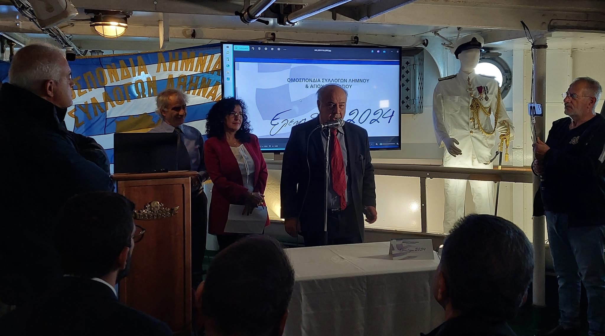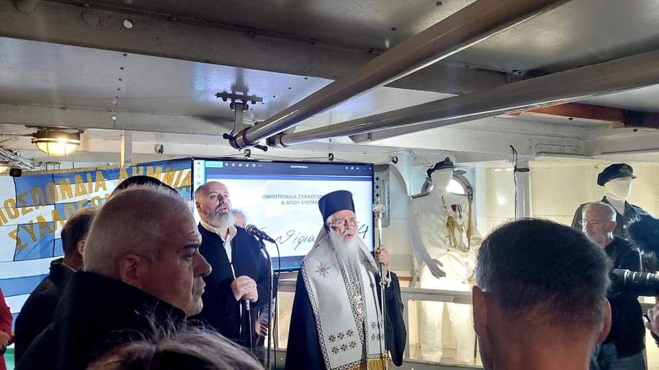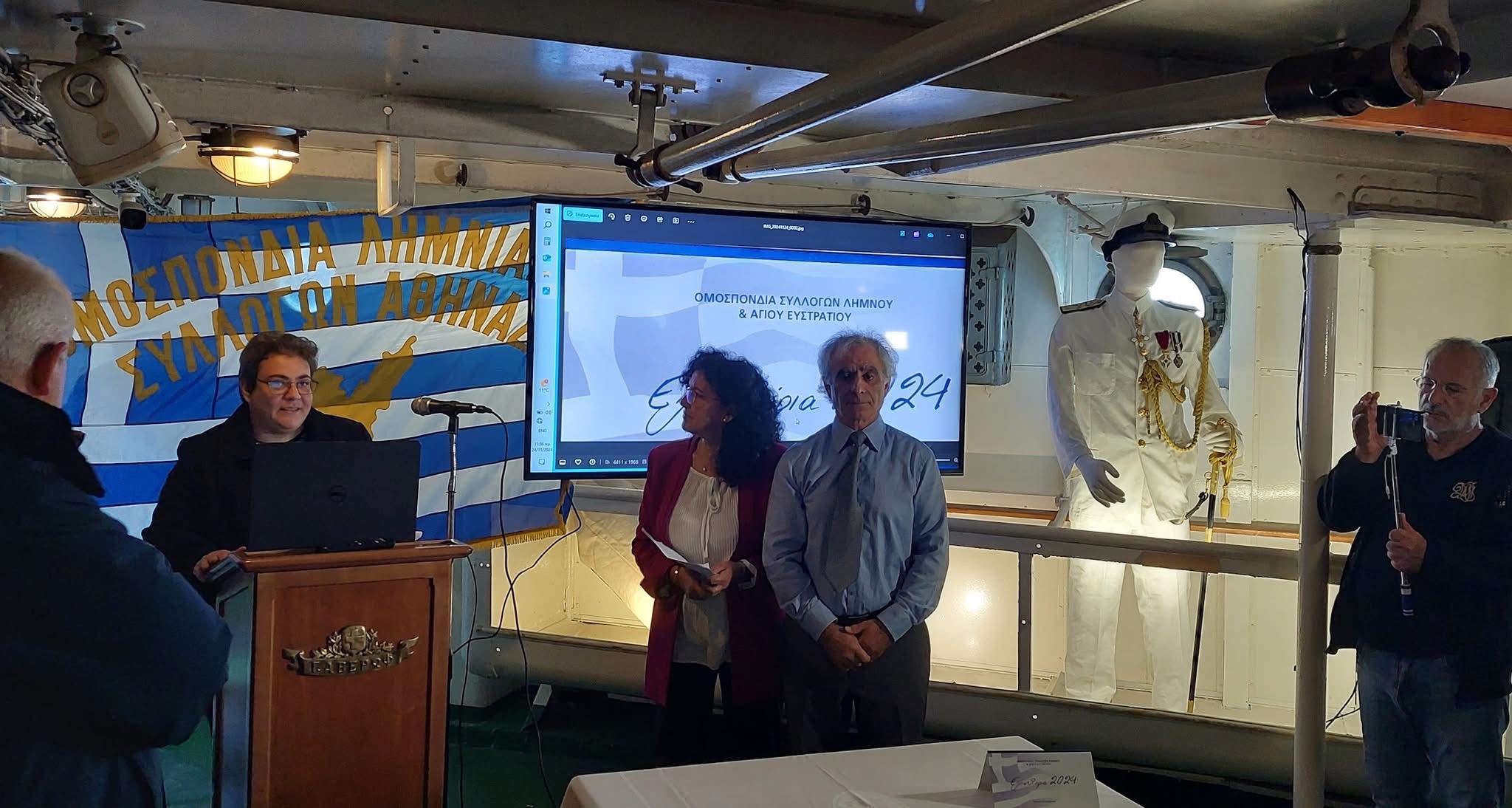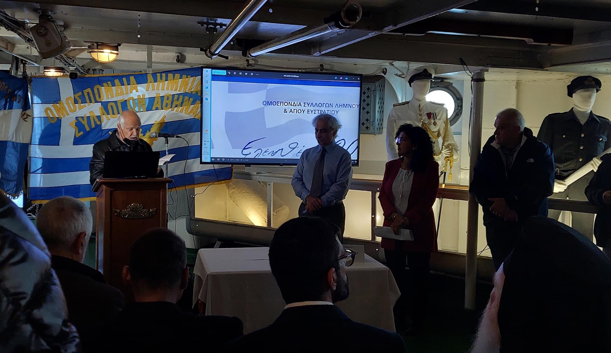 Ο Πρόεδρος της ΟΛΣΥ,κ. Αντώνιος Καραγιάννης, στην ομιλία του έβαλε διεκδικητικό πλαίσιο και αναφέρθηκε στον ακτοπλοϊκό αποκλεισμό του νησιού του Αγίου Ευστρατίου. Ευχαρίστησε τον Αντιναύαρχο,κ. Καλογερόπουλο και όλο το πλήρωμα του θωρηκτό για την πολύμηνη συνεργασία τους.