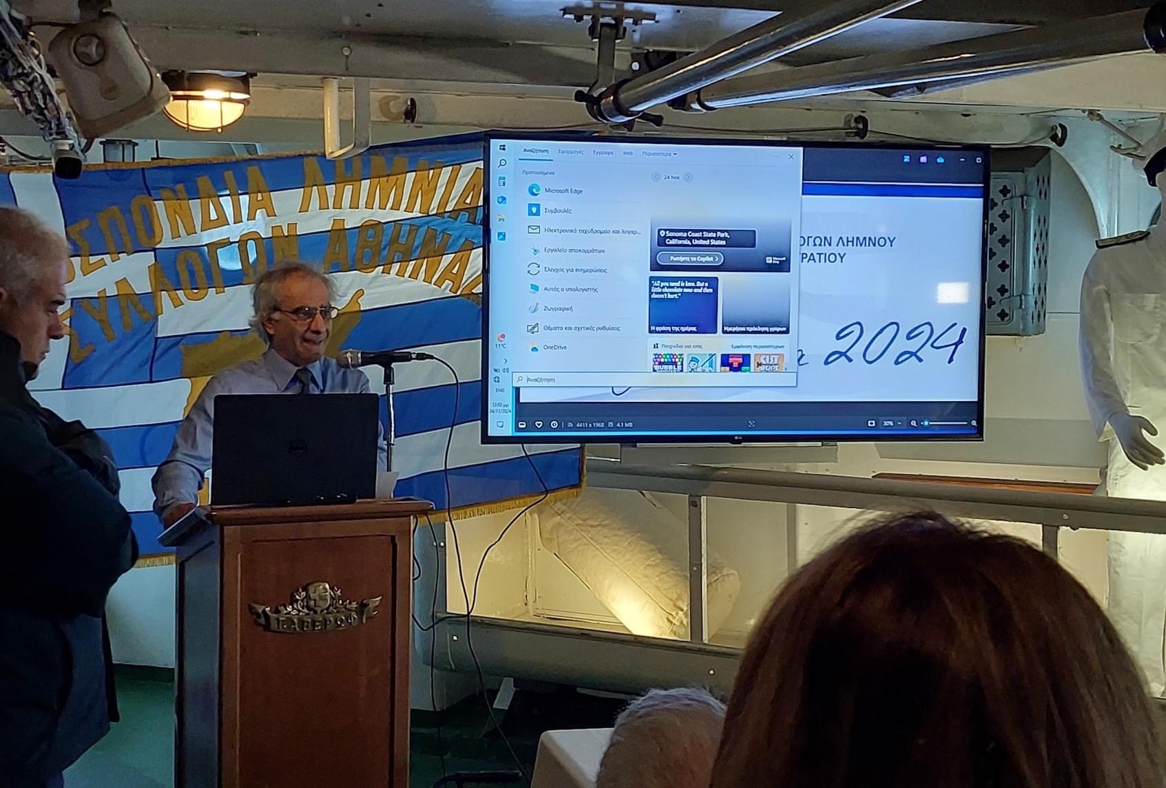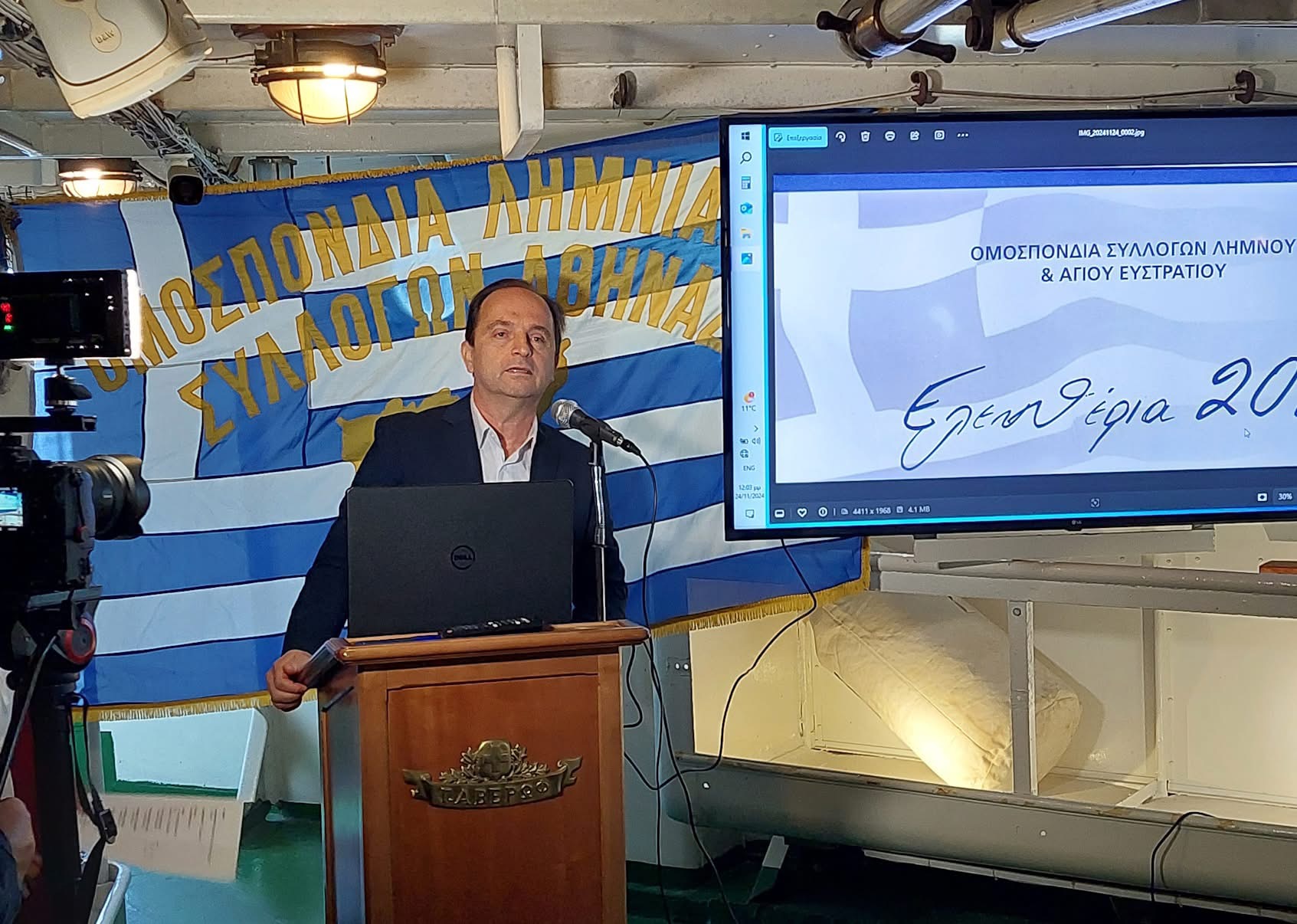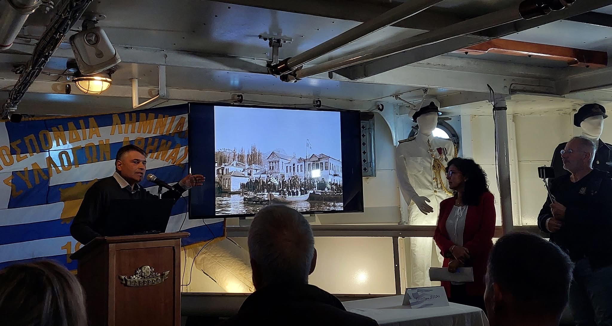 Οι ομιλητές μας, κ. Παντελής Βατάκης,Ταξίαρχος ε.α.-συγγραφέας, και κ.Κωνσταντίνος Λαγός,καθηγητής ιστορίας-συγγραφέας, αναφέρθηκαν με γλαφυρότητα και ιστορική ακρίβειαστην κοινή τους ομιλία με θέμα «Λήμνος, το ορμητήριο του ελληνικού στόλου για την απελευθέρωση των νησιών του Β.Α. Αιγαίου»στα ιστορικά γεγονότα της εποχής εκείνης. Ο πρώτος ομιλητής αναφέρθηκε αναλυτικά στηναπελευθέρωση της Λήμνου, ενώ ο δεύτερος εξιστόρησε την απελευθέρωση των υπολοίπων νησιών.