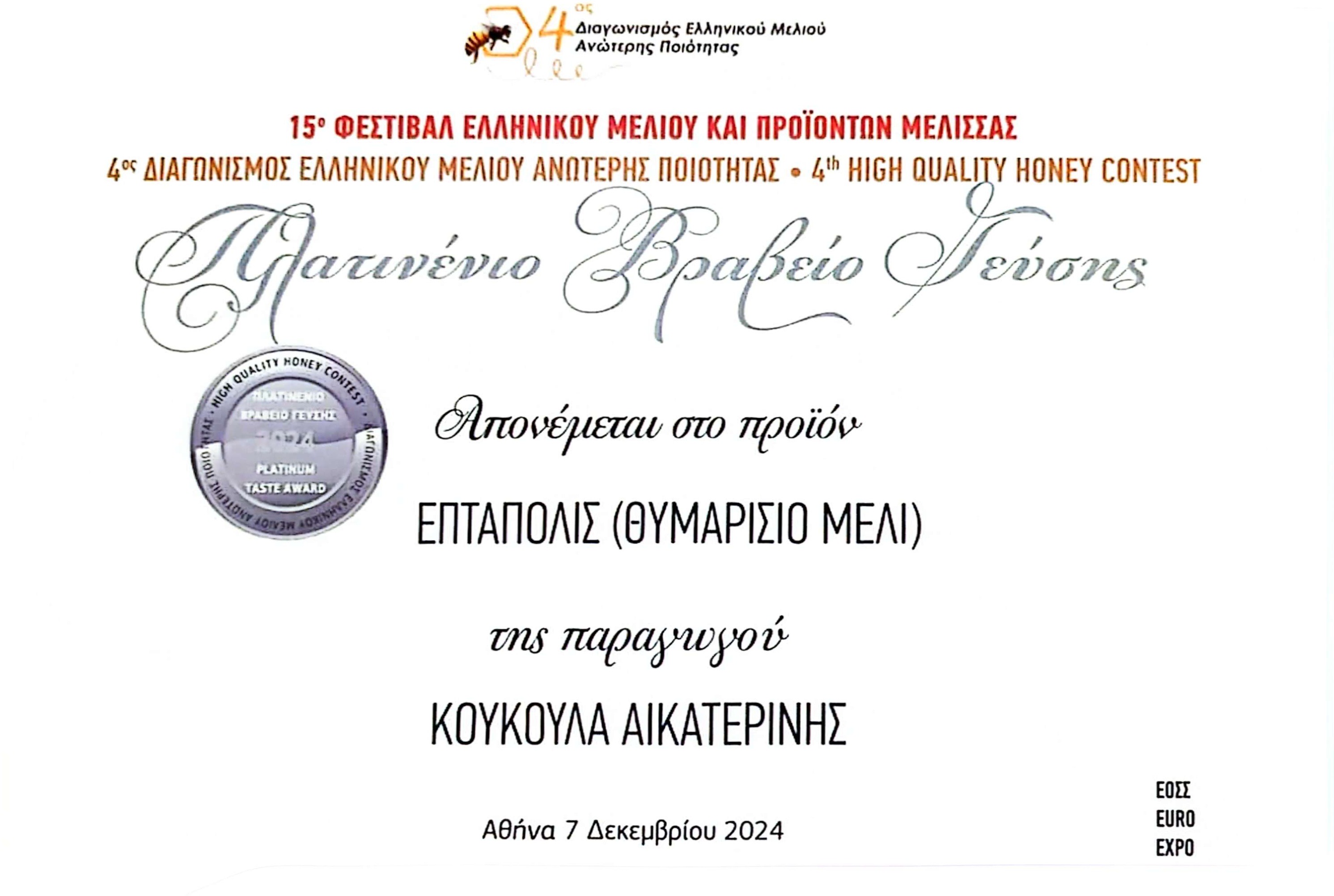 Το Θυμαρίσιο μέλι της Λήμνου, «Επτάπολις» της Αικατερίνης Κουκούλα, κατέκτησε το Πλατινένιο Βραβείο στον 4ο Διαγωνισμό Ελληνικού Μελιού Ανώτερης Ποιότητας, ξεχωρίζοντας ανάμεσα σε πλήθος αξιόλογων συμμετοχών από όλη την Ελλάδα.
