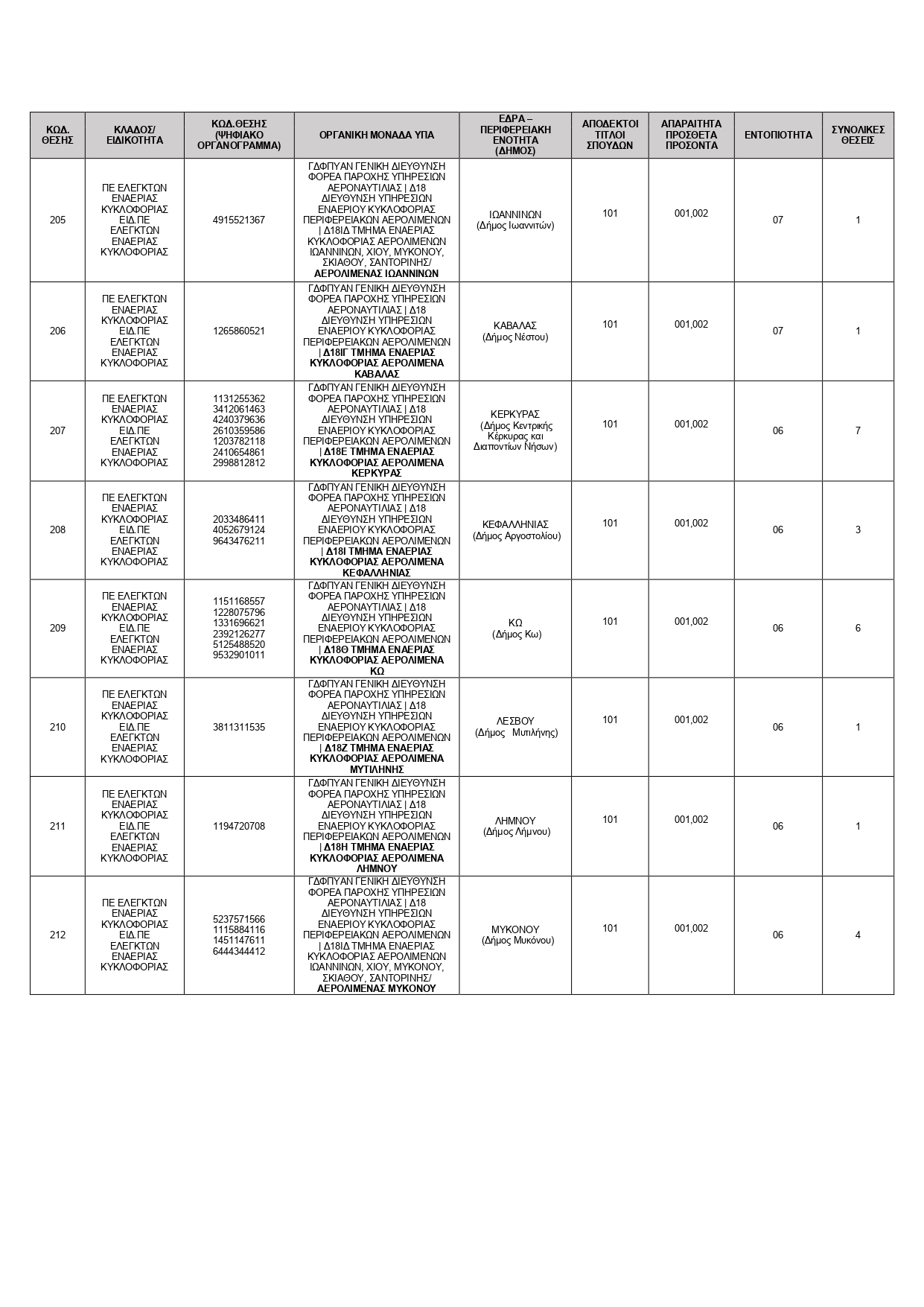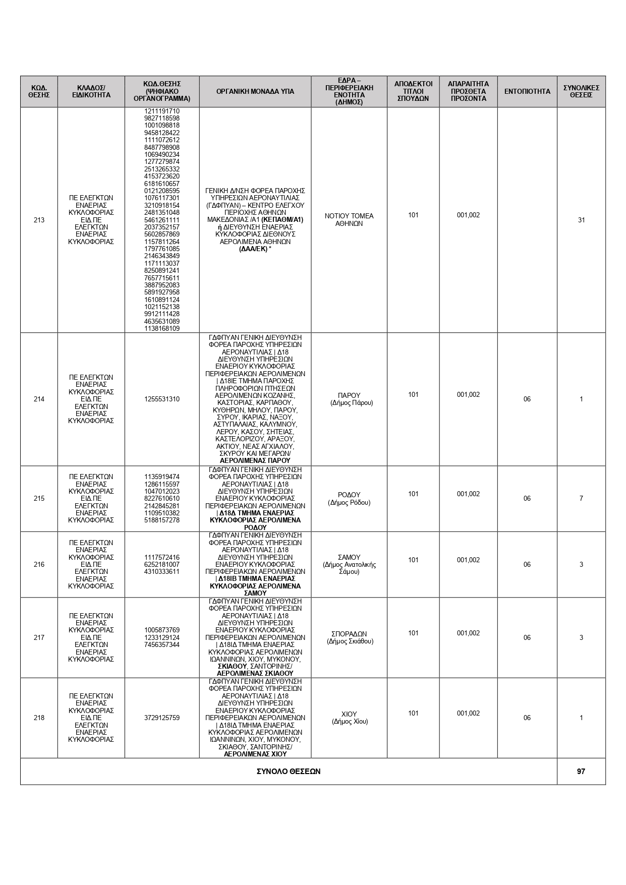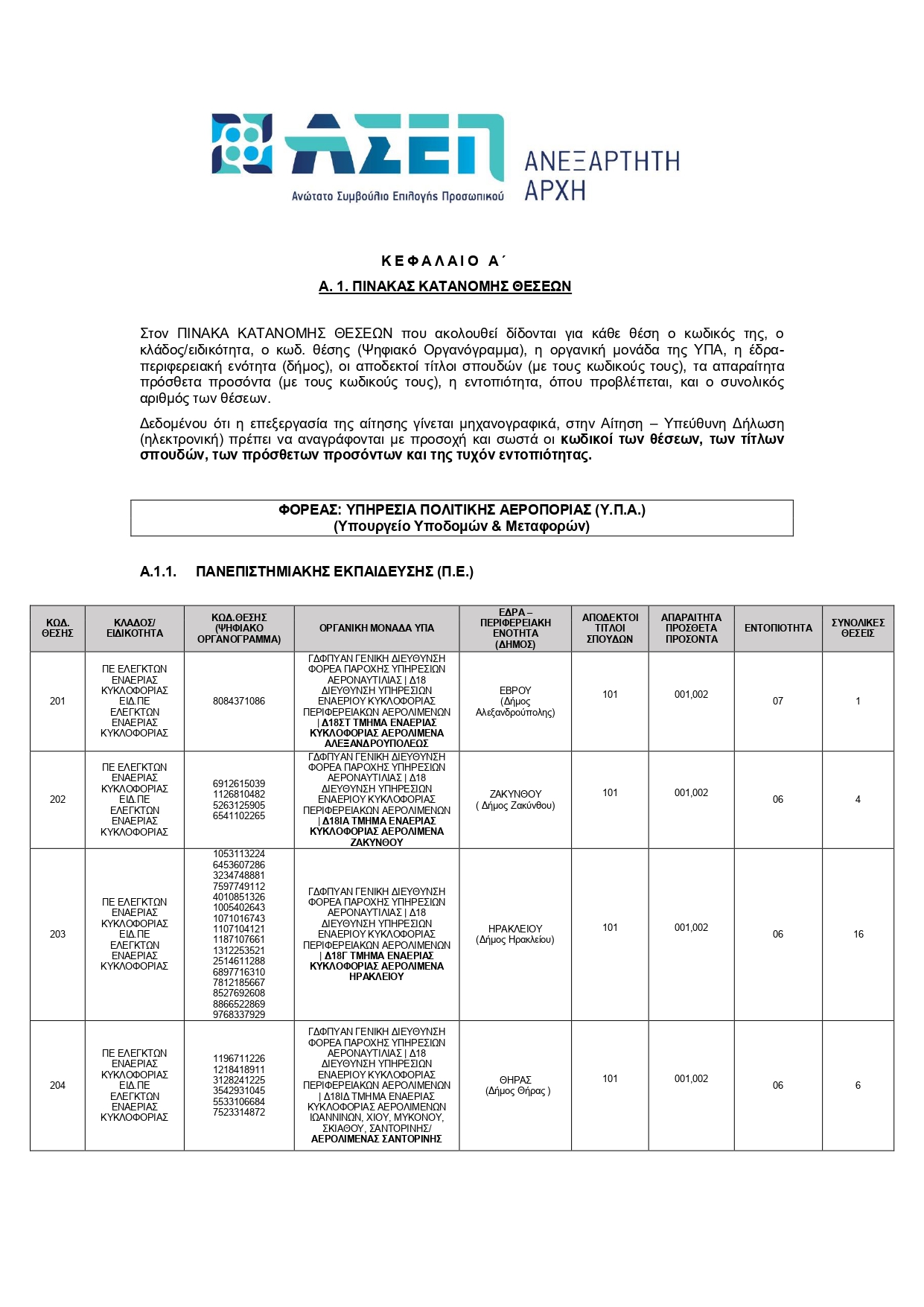 Στον ΠΙΝΑΚΑ ΚΑΤΑΝΟΜΗΣ ΘΕΣΕΩΝ που ακολουθεί δίδονται για κάθε θέση ο κωδικός της, ο κλάδος/ειδικότητα, ο κωδ. θέσης (Ψηφιακό Οργανόγραμμα), η οργανική μονάδα της ΥΠΑ, η έδρα- περιφερειακή ενότητα (δήμος), οι αποδεκτοί τίτλοι σπουδών (με τους κωδικούς τους), τα απαραίτητα