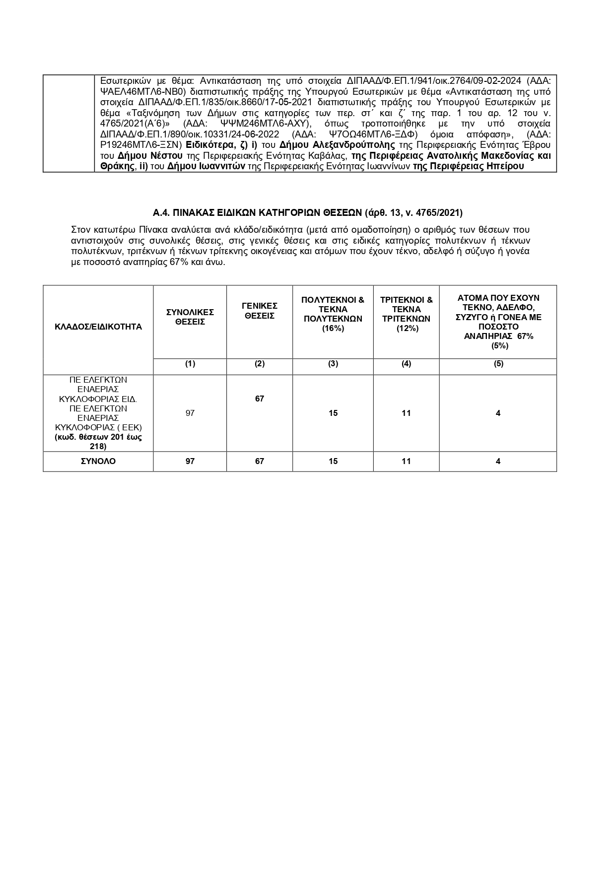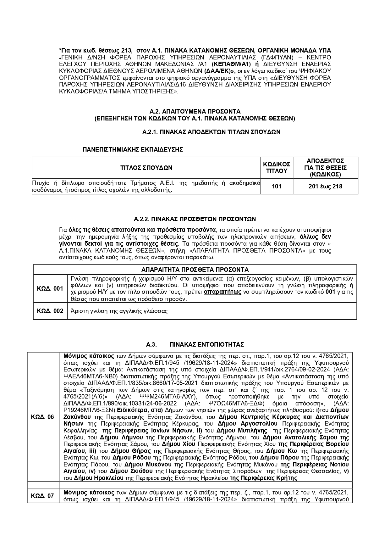πρόσθετα προσόντα (με τους κωδικούς τους), η εντοπιότητα, όπου προβλέπεται, και ο συνολικός αριθμός των θέσεων.