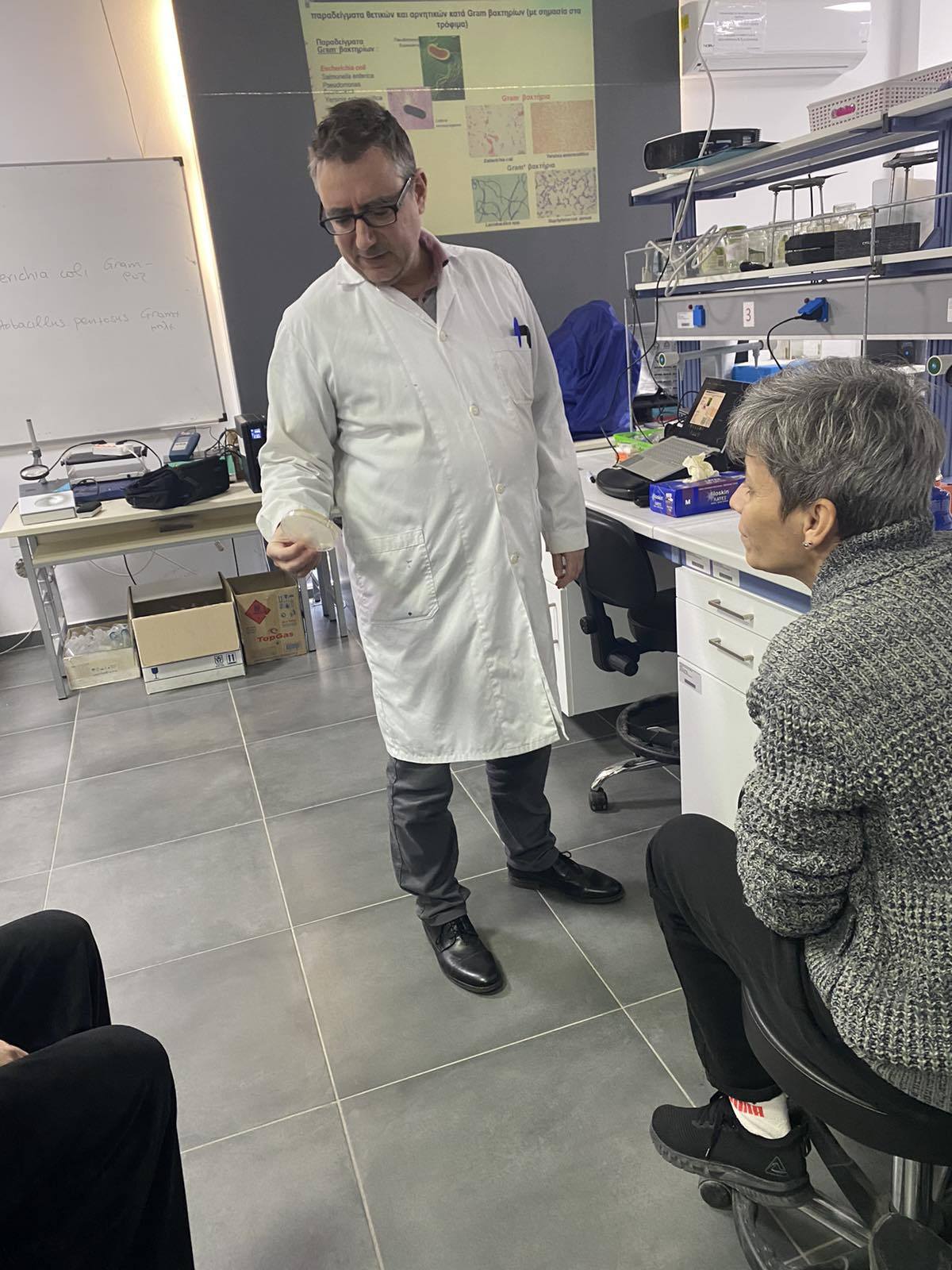 Με μεγάλη χαρα και προθυμία δέχτηκε να φιλοξενήσει τους σπουδαστές της ΣΑΕΚ στο εργαστήριό του προκειμένου να έρθουν σε επαφή με εργαστηριακούς χώρους και να εκπονήσουν και οι ίδιοι πειράματα. Είχε προετοιμάσει τα υλικά που απαιτούνταν για να πραγματοποιήσουν οι σπουδαστές χρεώσεις Gram+ και Gram- βακτηρίων και επιπλέον επεξήγησε με σαφήνεια, με τη χρήση διαφανειών, βίντεο αλλά και με live επίδειξη τα βήματα που απαιτούνταν για τον χρωματισμό δυο βακτηρίων, ένα εκ των οποίων εντοπίζεται και στον οίνο, τα οποία στη συνέχεια, παρατηρήθηκαν και στο μικροσκόπιο.