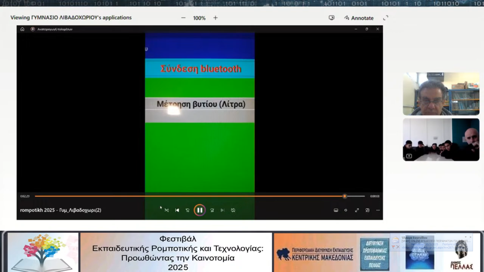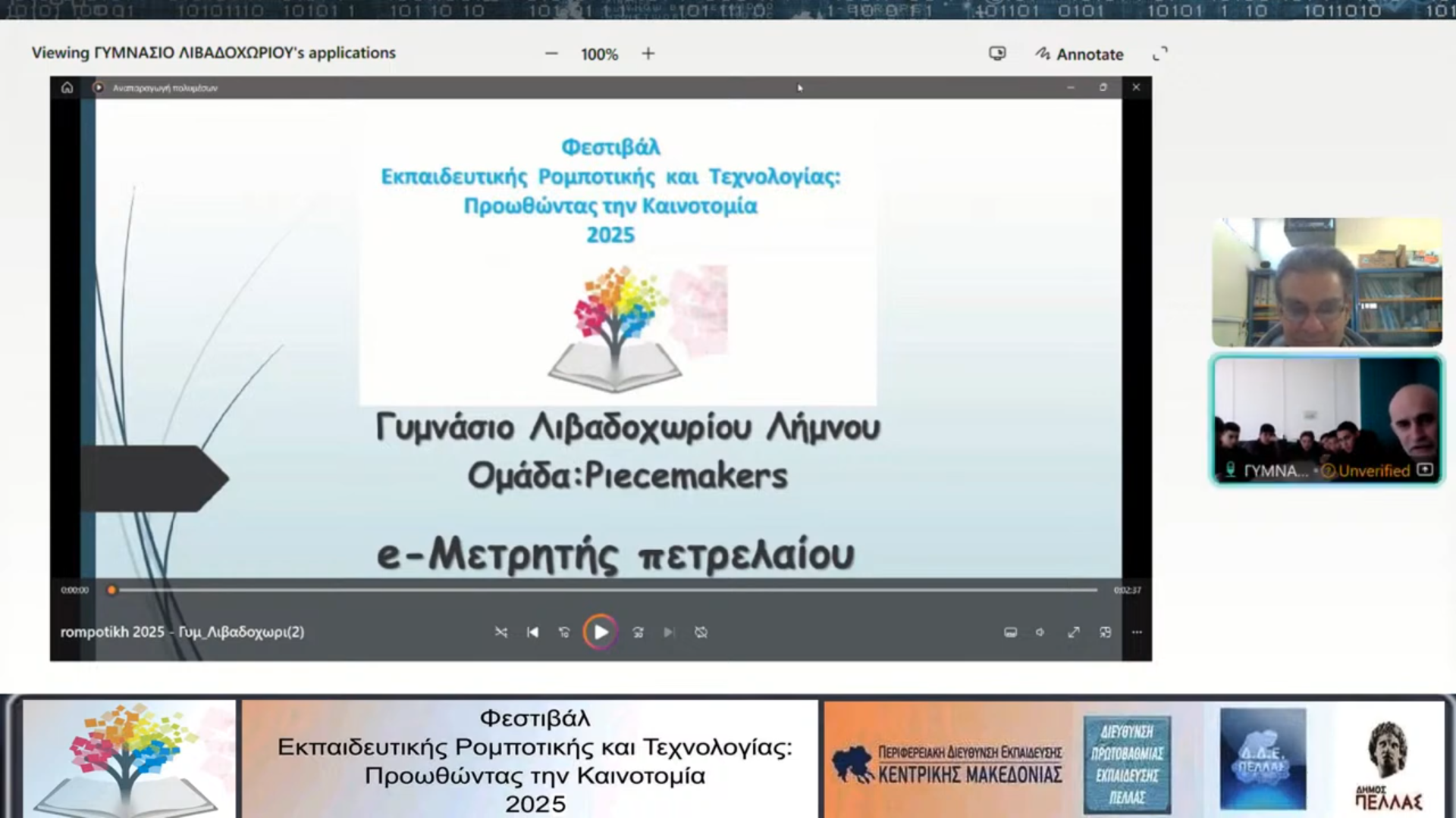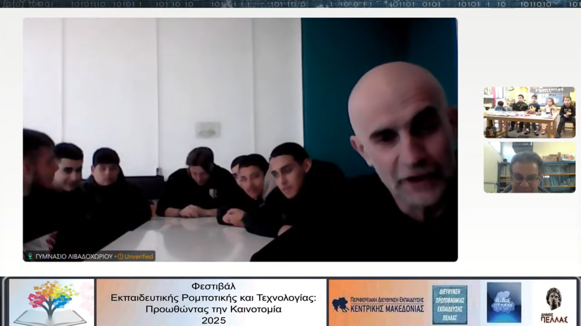Την Παρασκευή, 7 Μαρτίου 2025, ο Όμιλος Ρομποτικής του σχολείου μας συμμετείχε διαδικτυακά για τέταρτησχολική χρονιά στο Φεστιβάλ Εκπαιδευτικής Ρομποτικής &Τεχνολογίας 2025 που διοργανώνει το ΕΚΦΕ της ΔΔΕ Πέλλας σε συνεργασία με το Μεταπτυχιακό ΔΙ.Φ.Ε.Τ. του τμήματος Φυσικής του Α.Π.Θ., την Περιφερειακή Διεύθυνση Α/θμιας & Β/θμιας Εκπαίδευσης Κεντρικής Μακεδονίας, τον Οργανισμό Ανοιχτών Τεχνολογιών (ΕΕΛΛΑΚ) και με την υποστήριξη της ΠΑΝ.Ε.Κ.Φ.Ε.
