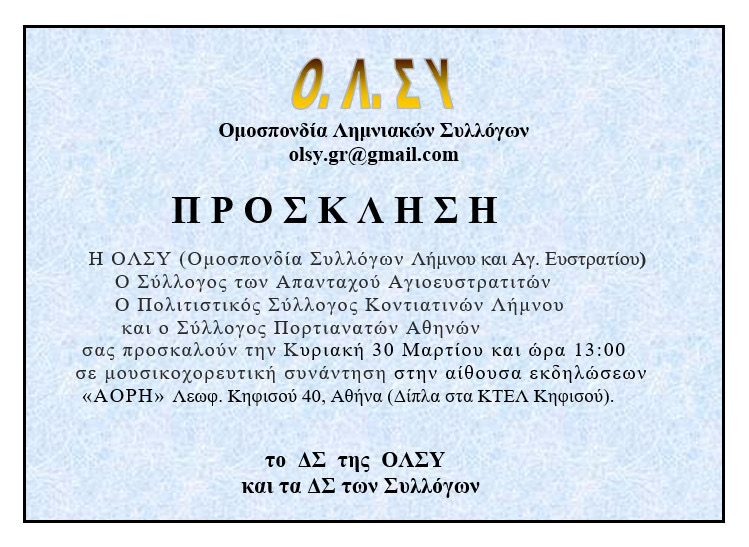 Η ΟΛΣΥ σε συνεργασία με τους συλλόγους των Απανταχού Αγιοευστρατιτών, τον πολιτιστικό σύλλογο Κοντιατινών Λήμνου και τον σύλλογο Πορτιανατών Αθηνών διοργανώνει και σας προσκαλεί την Κυριακή 30 Μαρτίου και ώρα 13:00 το μεγάλο ετήσιο χορό των συντοπιτών μας της Αττικής, στο κέντρο «Αόρη» Λεωφ. Κηφισού 40, Αθήνα (Δίπλα στα ΚΤΕΛ Κηφισού).