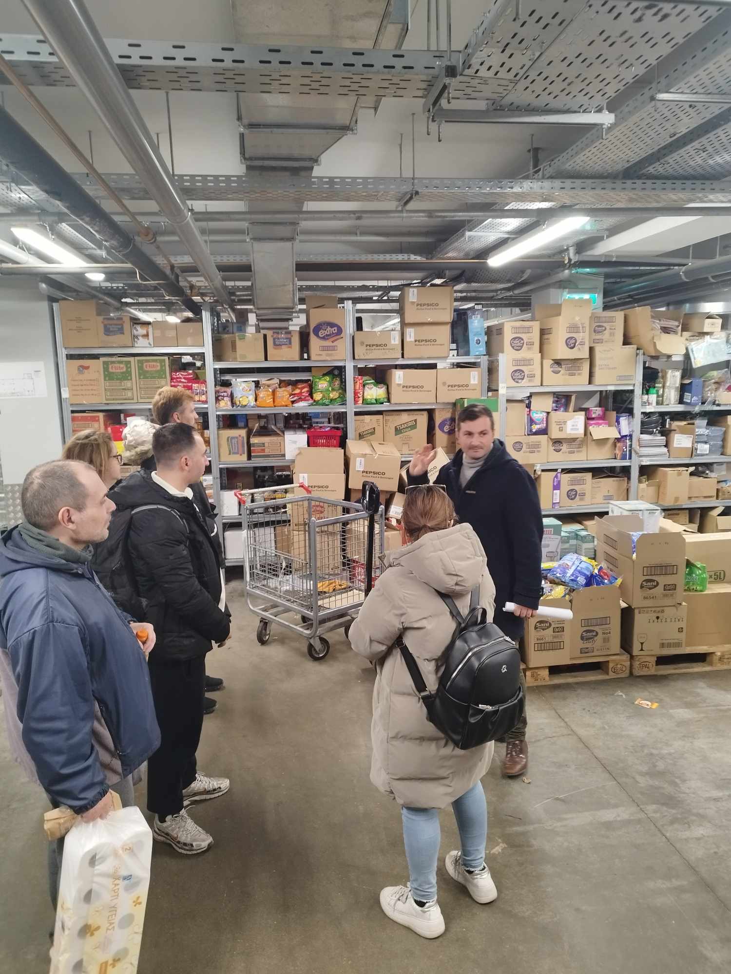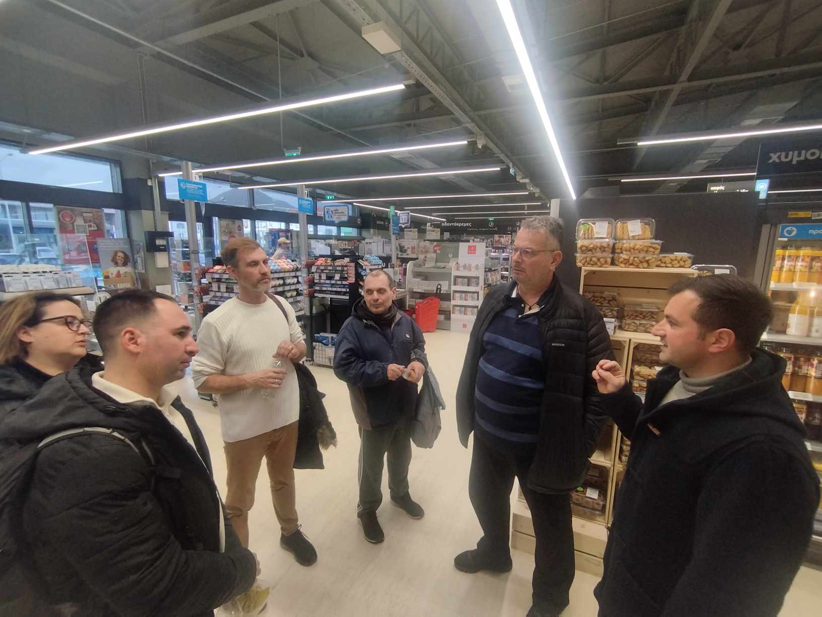 Ο κ. Ρουμελιώτης δεν παρέλειψε να οδηγήσει τους/τις εκπαιδευόμενους/ες σε όλους τους χώρους του καταστήματος, από το ισόγειο επίπεδο τροφίμων και καθημερινής διαβίωσης, μέχρι και τον υπόγειο χώρο των ψυγείων αλλά και των εφαρμογών ανακύκλωσης υλικών και συσκευασιών.