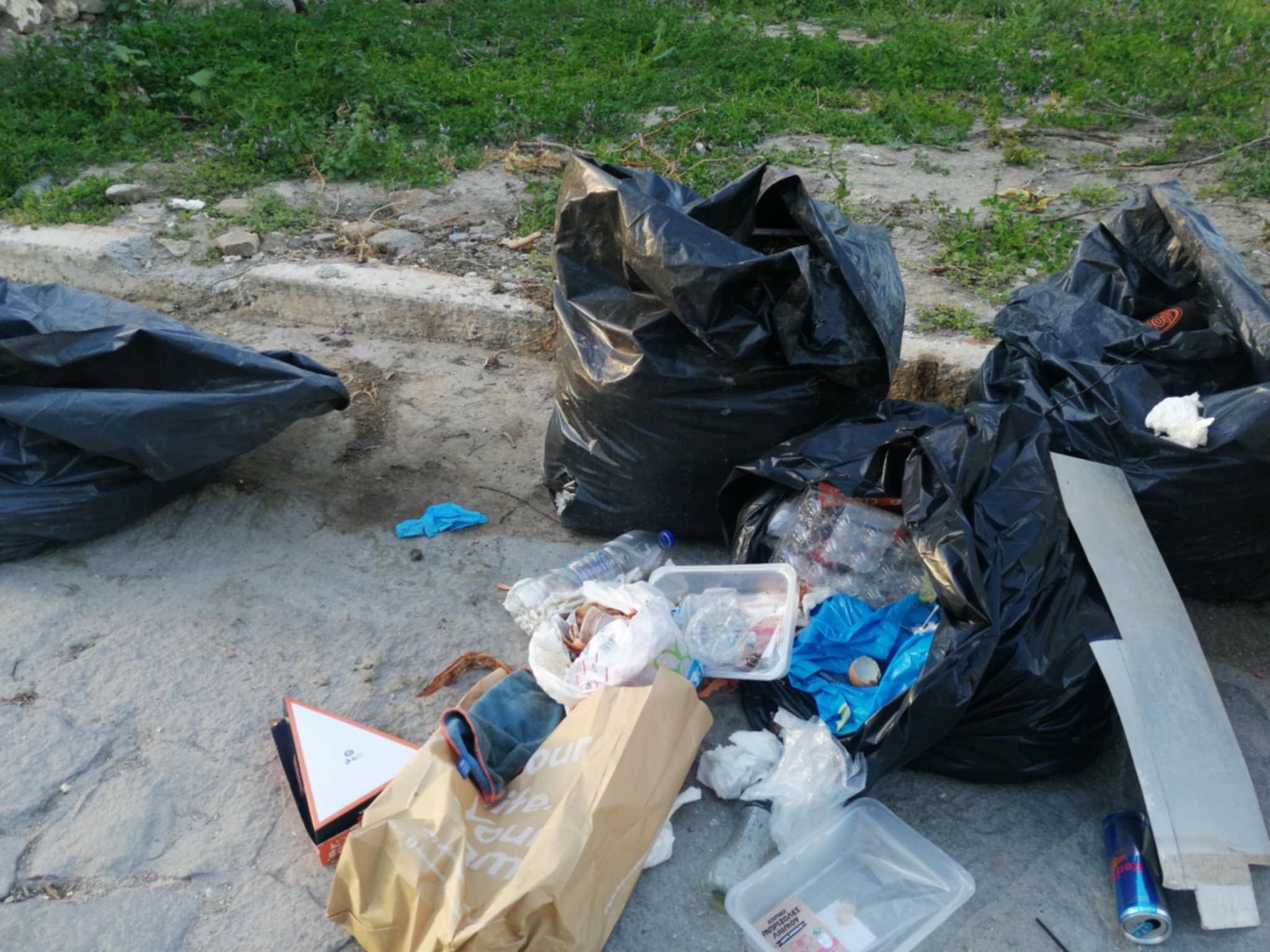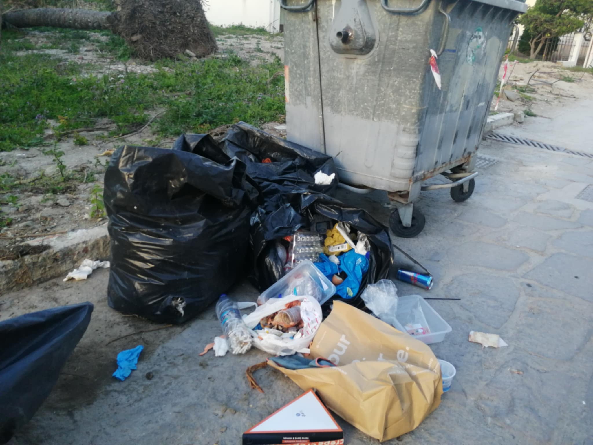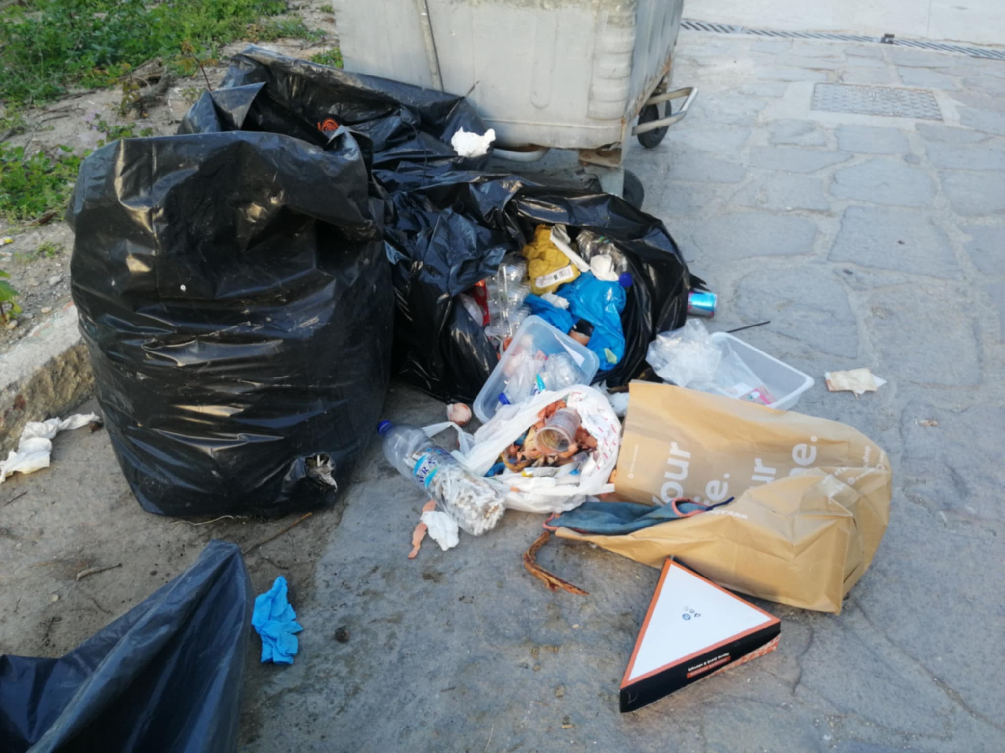 Σκουπίδια πεταμένα στον δρόμο, ανοιχτές σακούλες, πλαστικά, κουτιά και υπολείμματα φαγητού, συνθέτουν το σκηνικό.