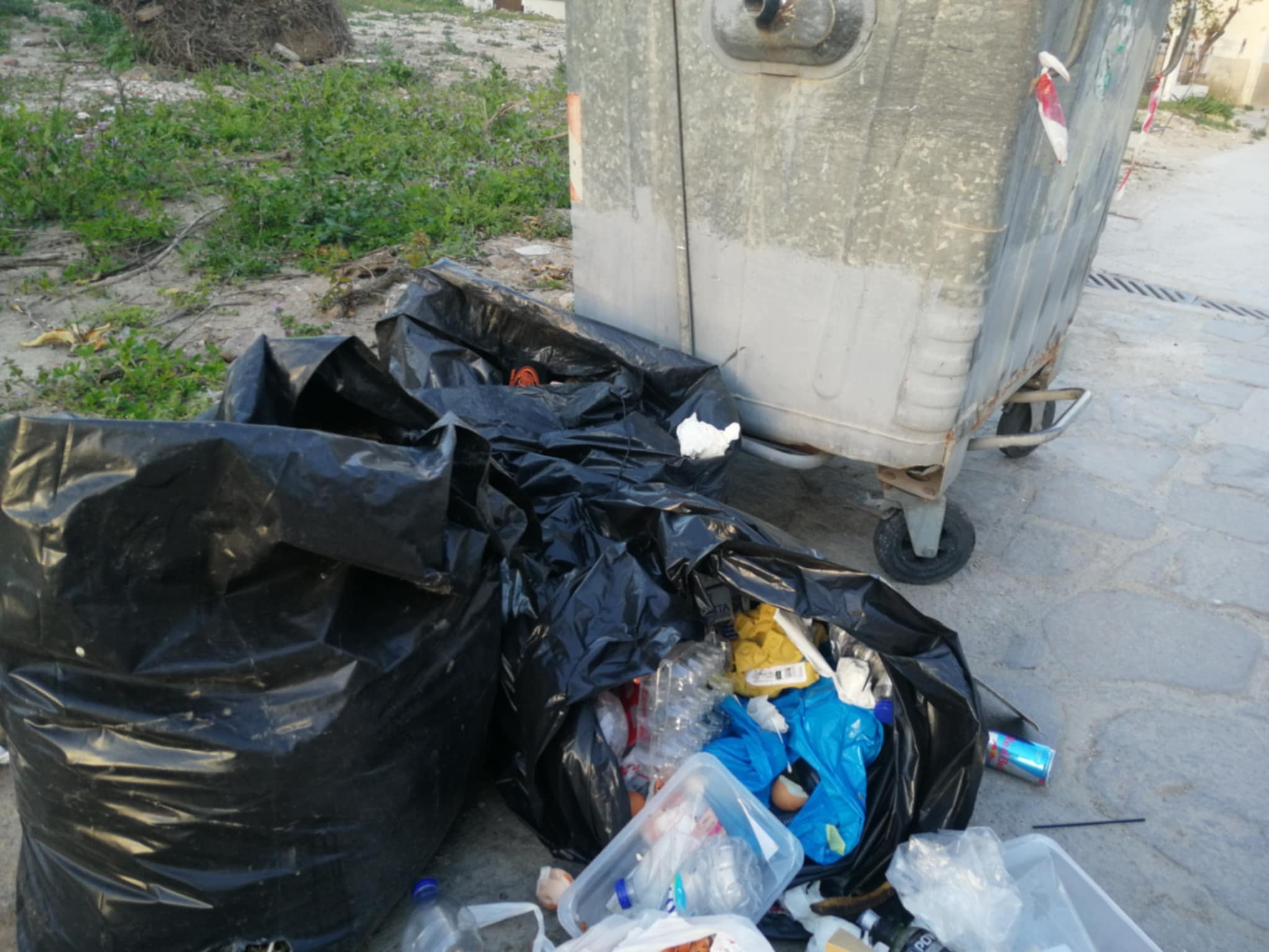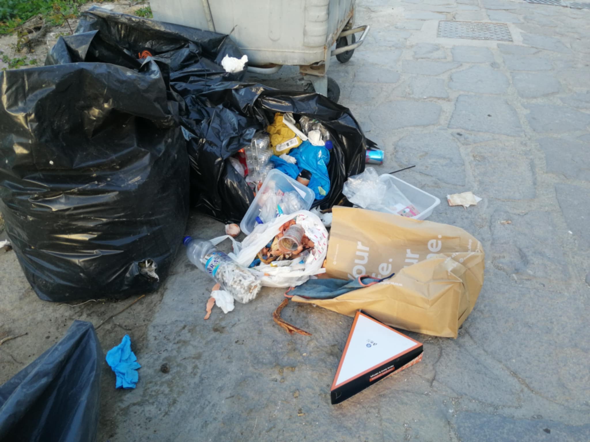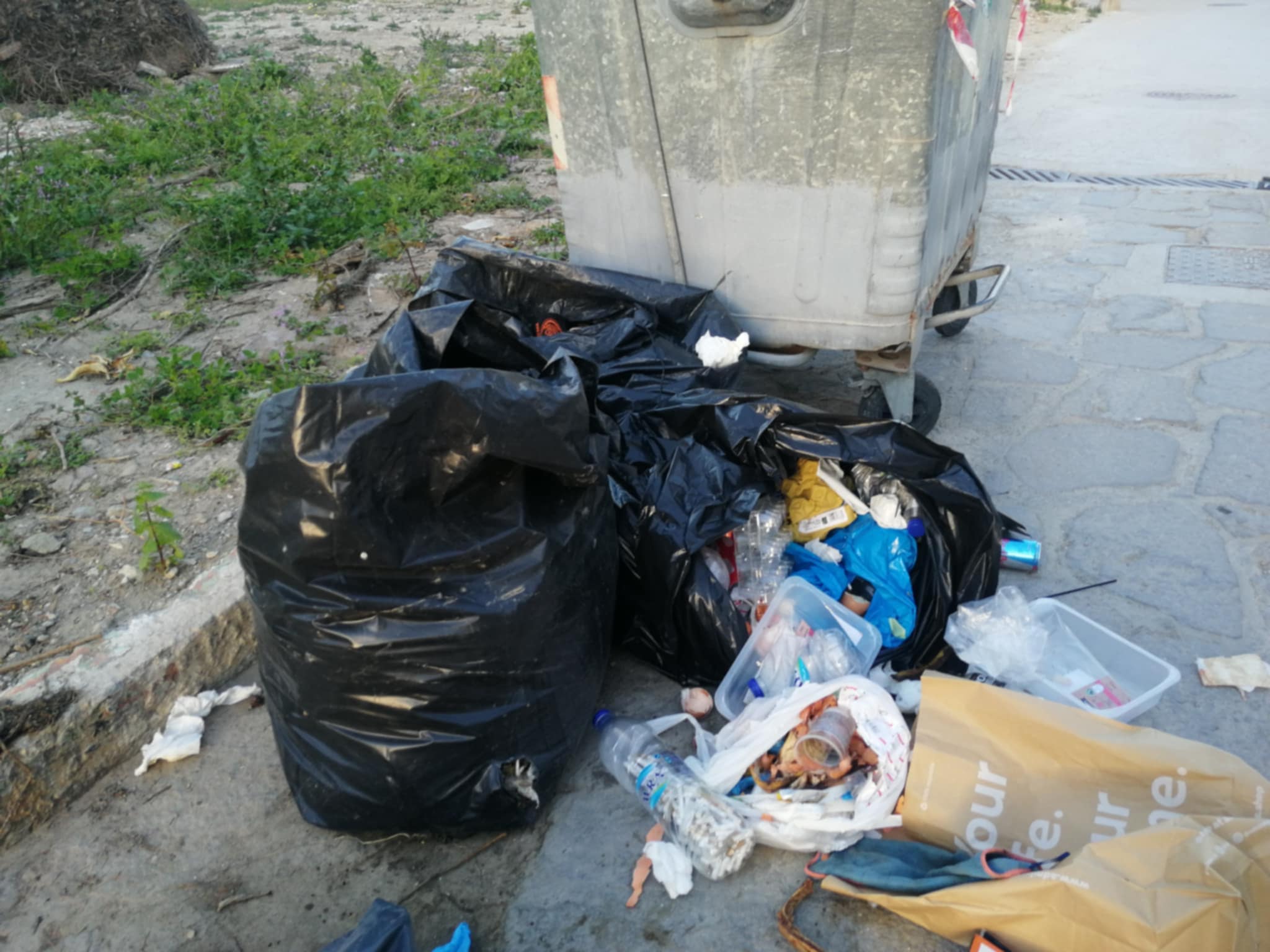 Σκουπίδια πεταμένα στον δρόμο, ανοιχτές σακούλες, πλαστικά, κουτιά και υπολείμματα φαγητού, συνθέτουν το σκηνικό.