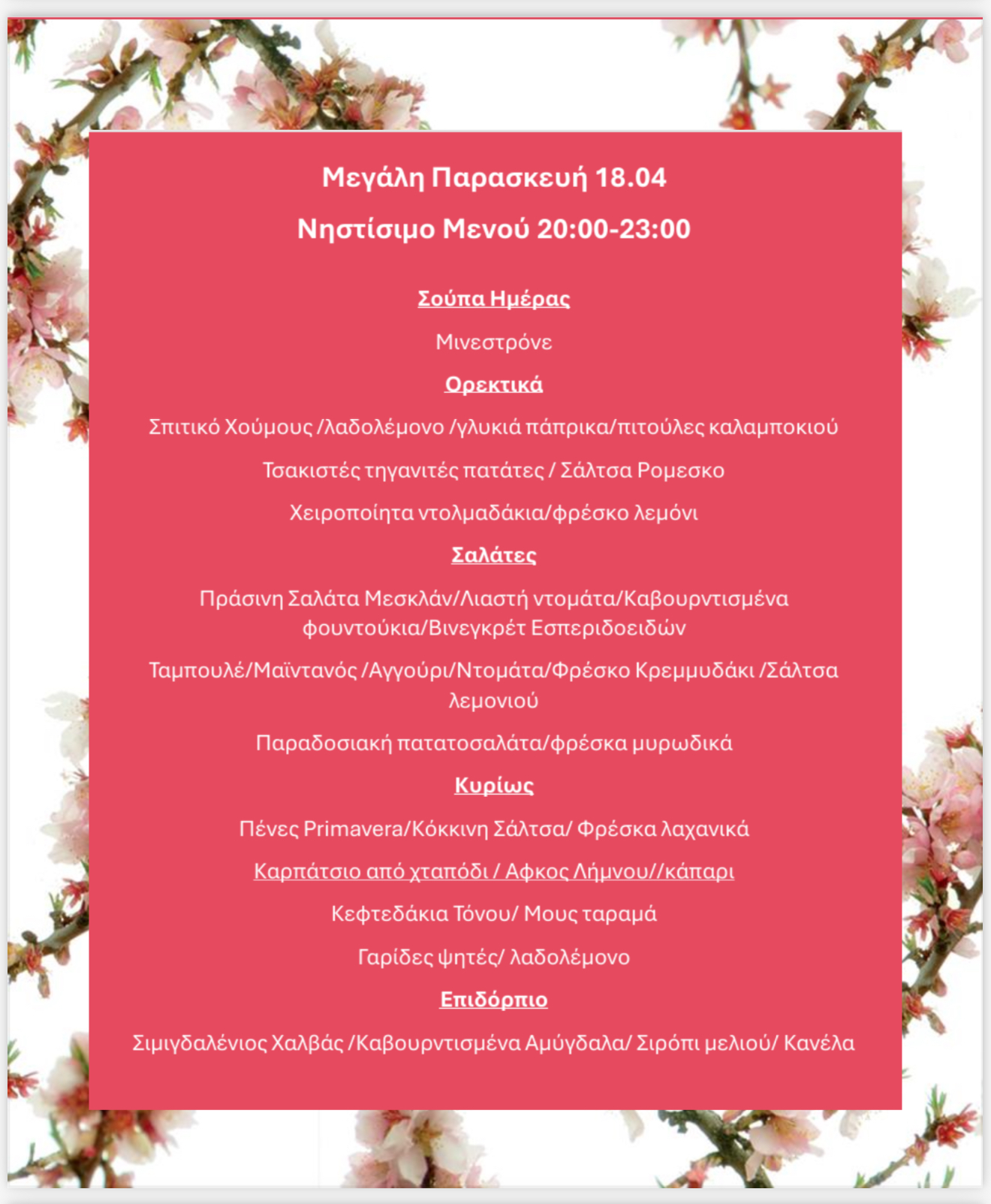 • Μεγάλη Παρασκευή (20.00 - 23.00): Νηστίσιμες δημιουργίες και τοπικά πιάτα, σε μια βραδιά με γεύση παράδοσης.