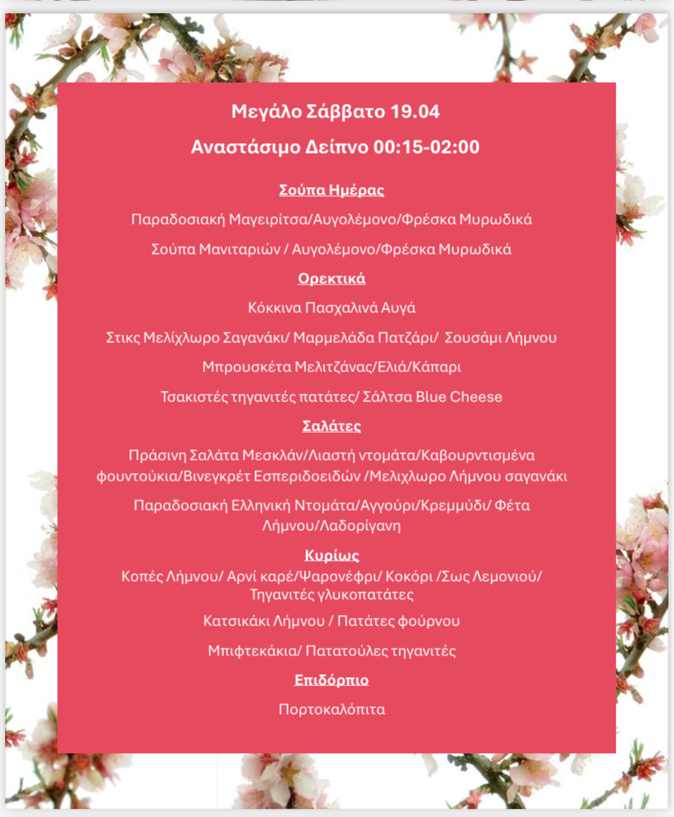• Μεγάλο Σάββατο (από τις 00.15): Αναστάσιμο δείπνο με αυθεντική μαγειρίτσα και τρυφερό κατσικάκι, όπως προστάζει το έθιμο.