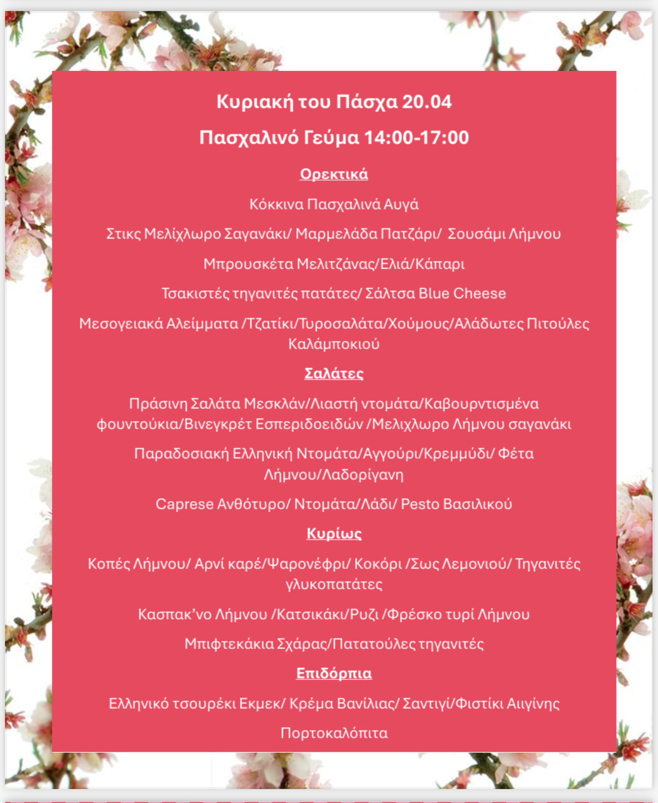 • Κυριακή του Πάσχα (14.00 - 17.00): Εορταστικό τραπέζι με όλα τα απαραίτητα της ημέρας, σε μια εμπειρία που συνδυάζει νοστιμιά και φιλοξενία.